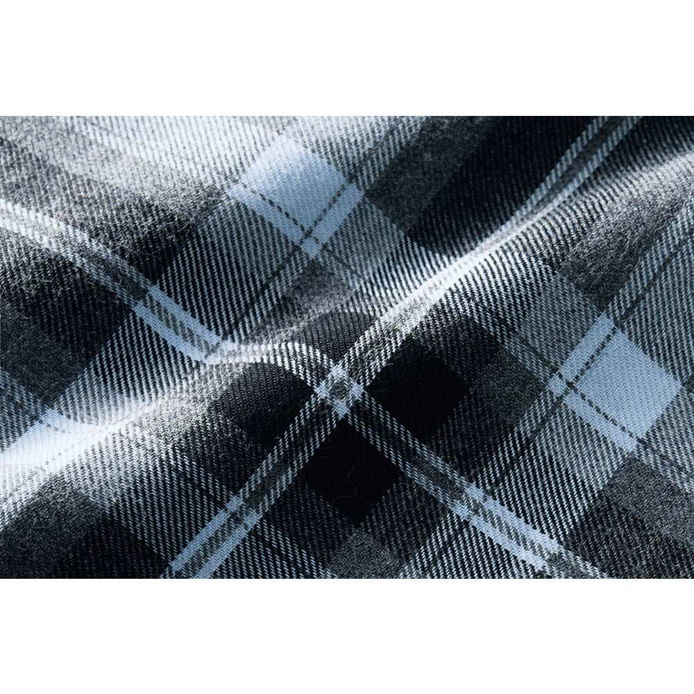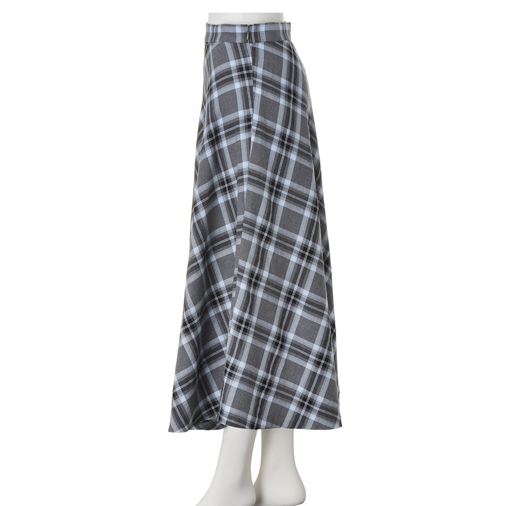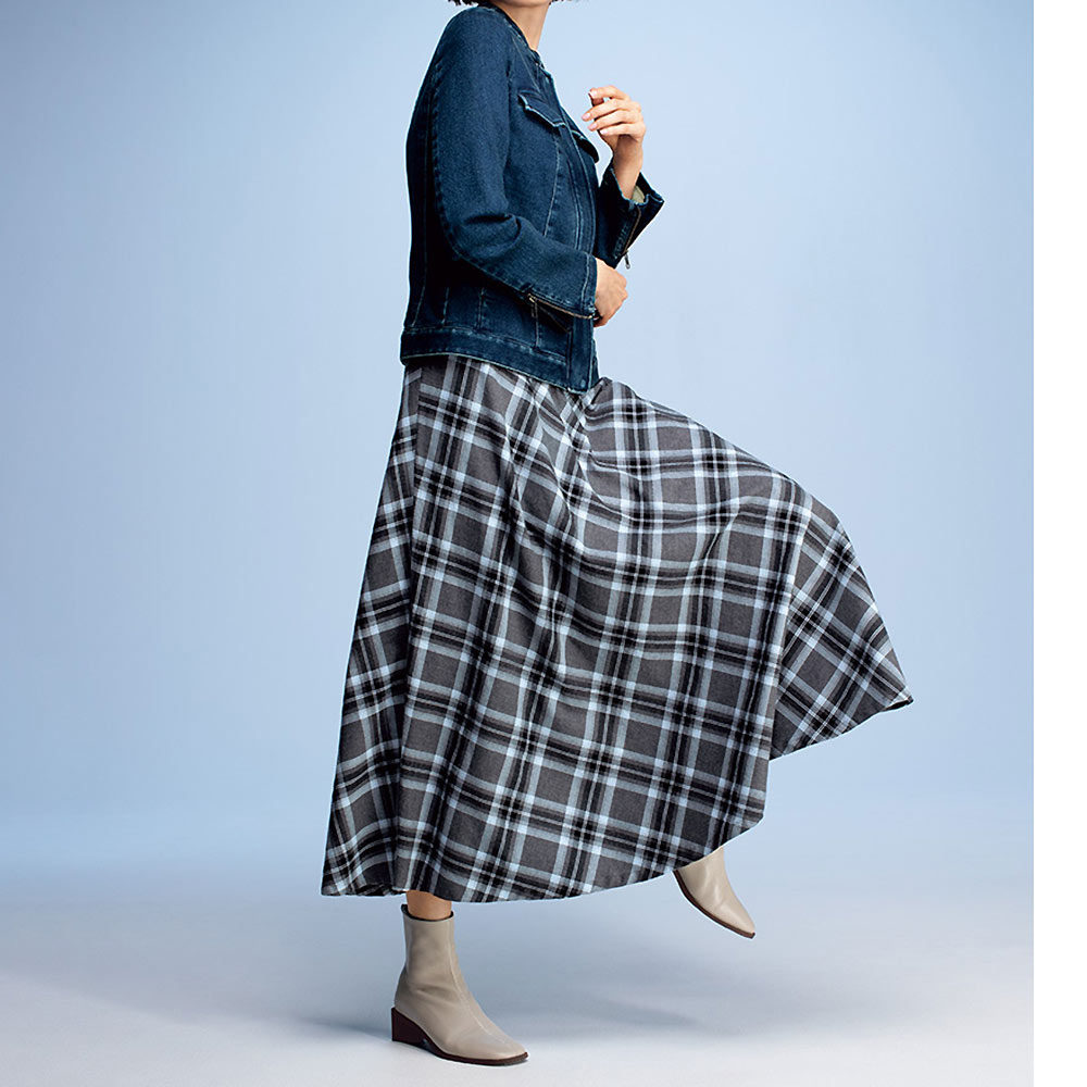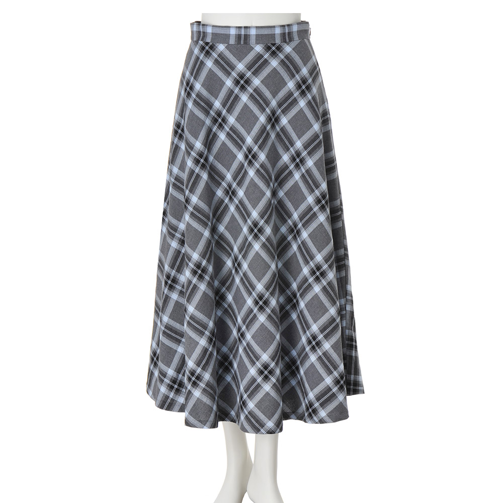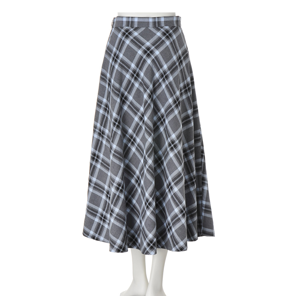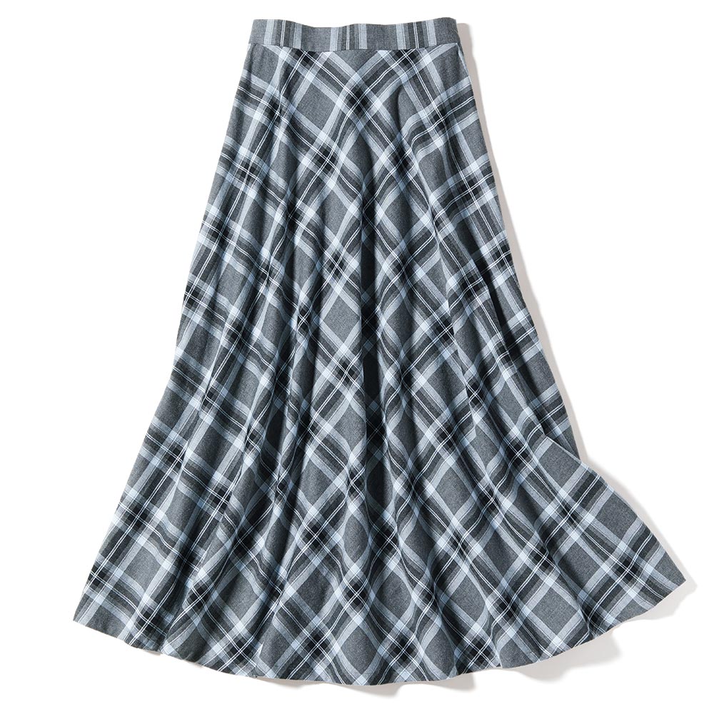 惜しみなく生地を使って仕立てたフレアースカートは、甘い織り地を微起毛させたイタリア製先染めチェック柄。モノトーンに淡いブルーを織り込んだ爽やかな配色、ドレープが波打つバイアス仕立ての優しい表情…、長く愛せるオーセンティックな魅力にあふれて。スカート部分はバイアスチェック、ウエストベルトは向きを変えた生地使いで、メリハリある表情に。