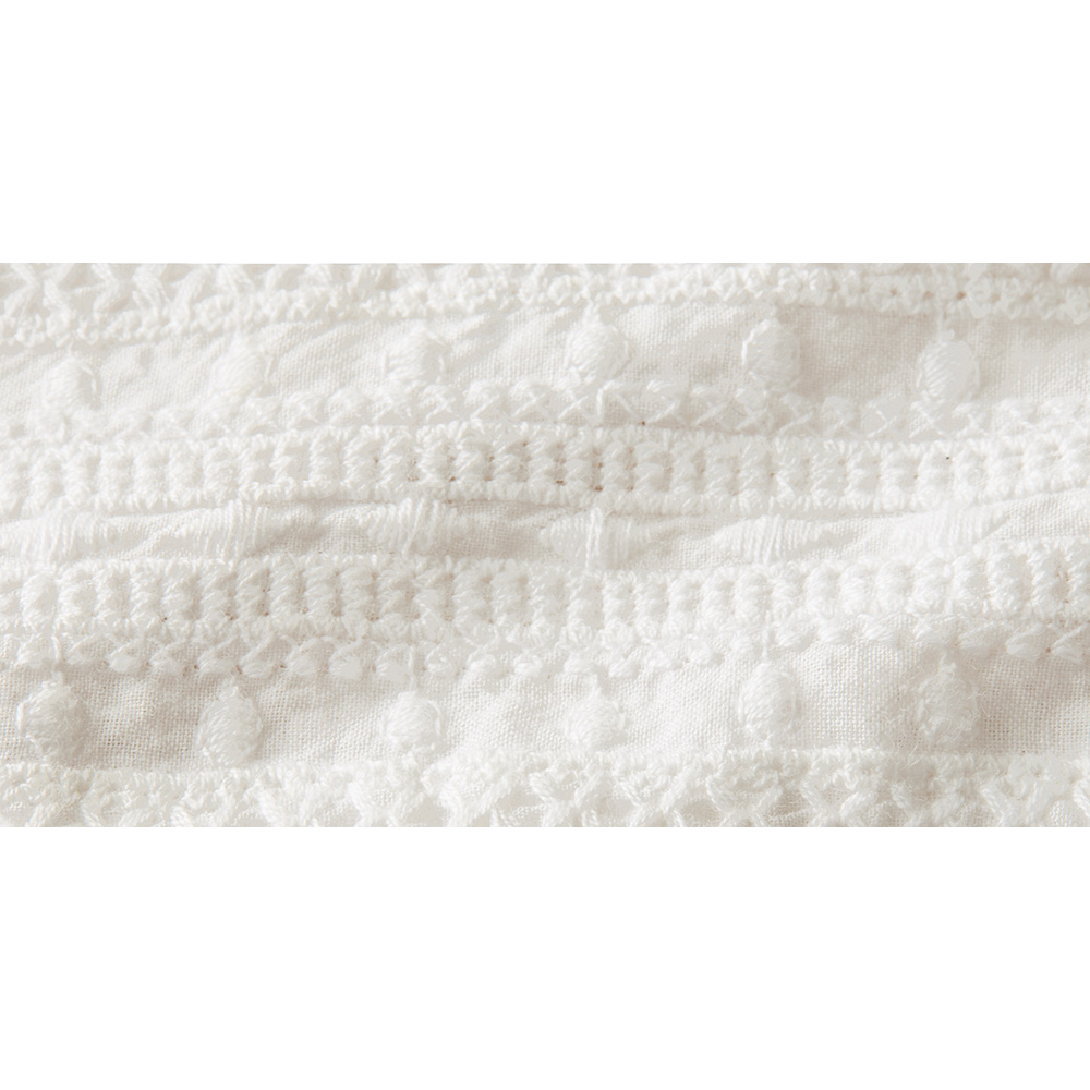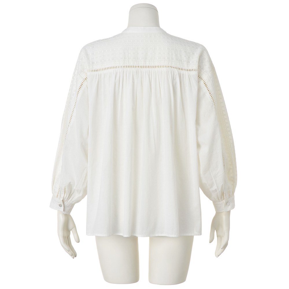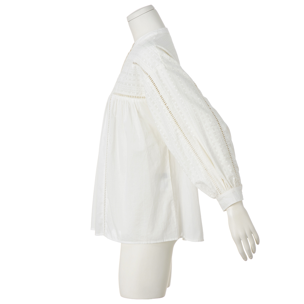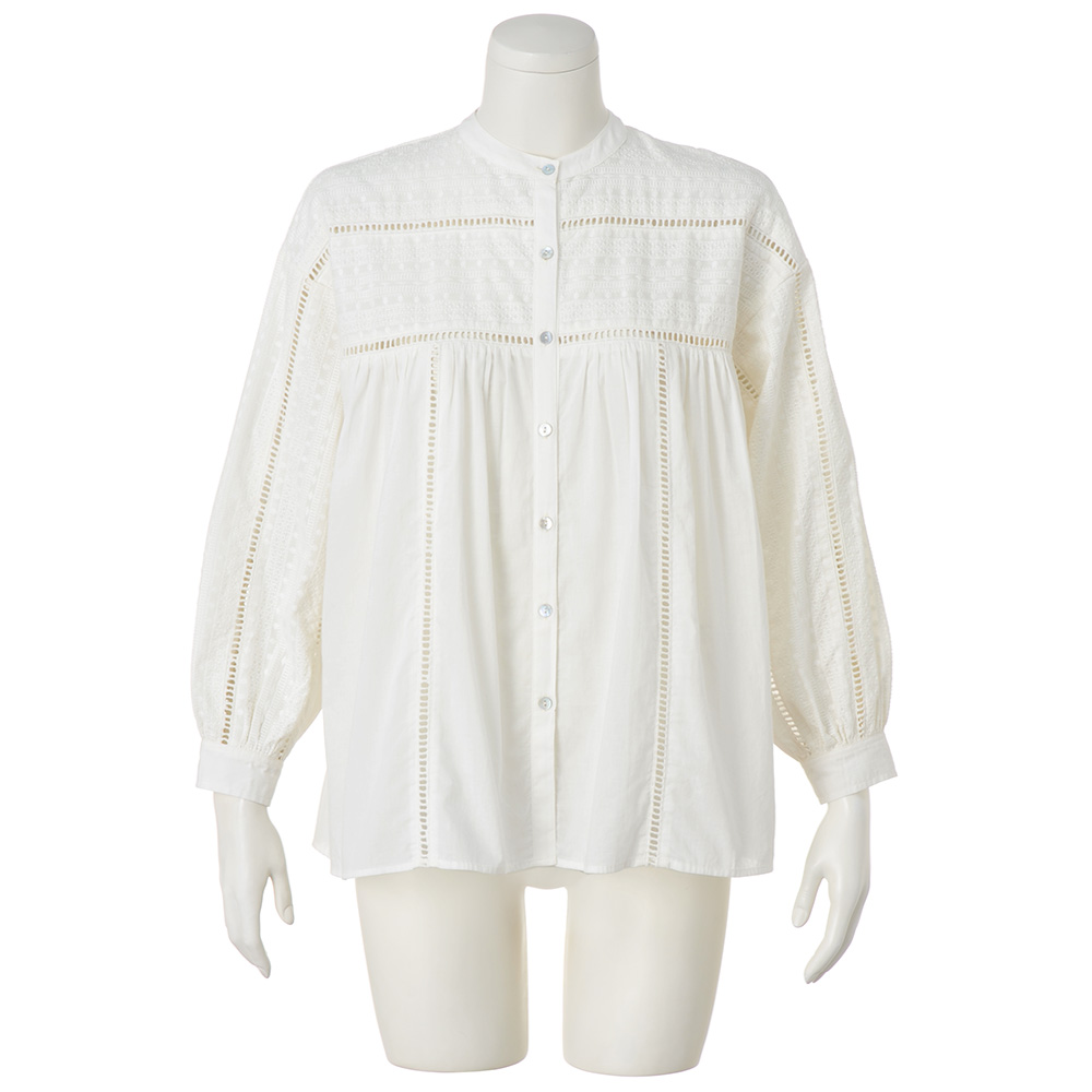 プレシャスな刺しゅうを愛しむブラウス針数の多い特殊マシンを使い、精緻な立体柄を描くインドの“シフリー刺しゅう”。間近で見ると驚くほど繊細な華やぎを、胸元から袖、背ヨークまで飾った贅沢なブラウスが完成しました。無地部分や刺しゅうの基布は、同じインドで生産した綿100%のキャンブリック。季節を限定しない素材感なので、インナーの着合わせ次第で長く愛用できます。また、ハシゴレースの切り替えや貝ボタンがヴィンテージを思わせるノスタルジックなアクセントに。襟型はバンドカラーを採用し、ふんわりしたフォルムをスタイリッシュに纏めました。POINTインドならではのクラフト感とシフリー刺しゅうの繊細さがノスタルジックな雰囲気を醸します。
