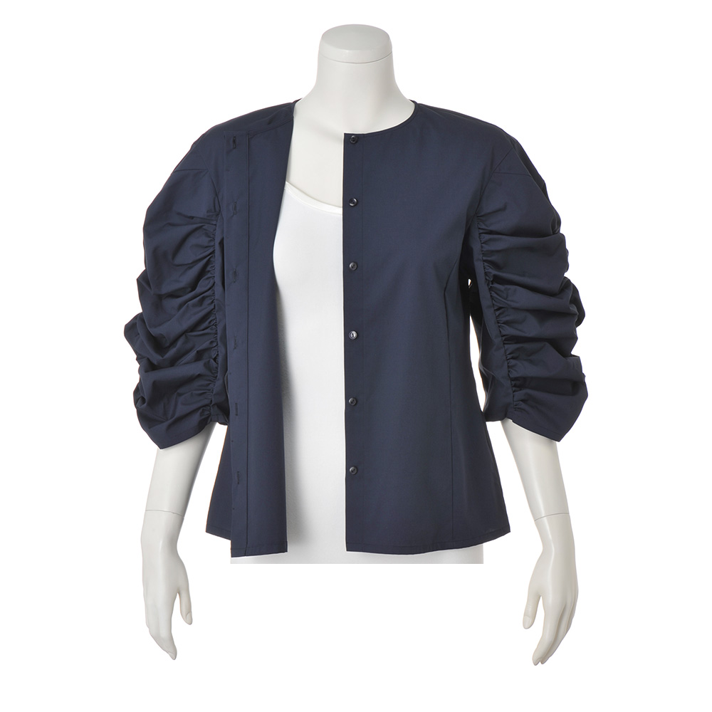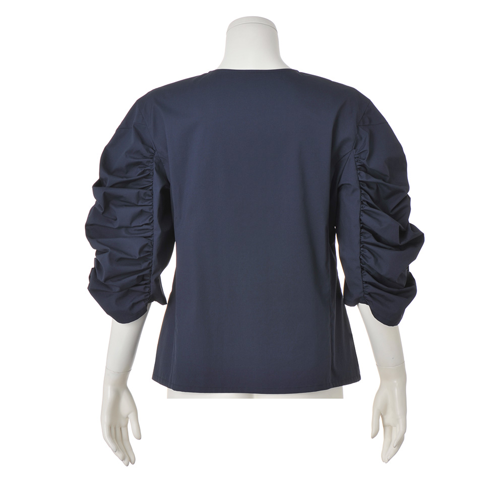 Career Style涼を誘い、軽やかな素材感、風が通り抜けるシルエット…。着心地が快適なら、仕事もお洒落もきっと心から楽しめます。信頼を与えるネイビーに袖のギャザーで優しさを華やかなデザイン袖を大人が取り入れやすいよう、身頃はシンプルに徹したブラウスです。袖はあえて外側のみにシャーリングを寄せ、立体パターンを駆使して構築的なシルエットに仕上げました。さらに、身頃のパネルラインや肘の隠れる袖丈、フロントの比翼仕立てなど、すっきりとしたディテールと袖のボリュームとのコントラストが、着る人を洗練美へと導きます。色はオフィスコーデに欠かせないネイビー。コットンの爽やかな肌触りとポリエステルのイージーケア性を併せ持ち、接触冷感、UVカット機能にも優れた素材です。