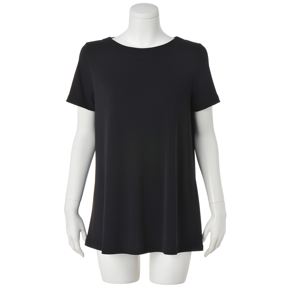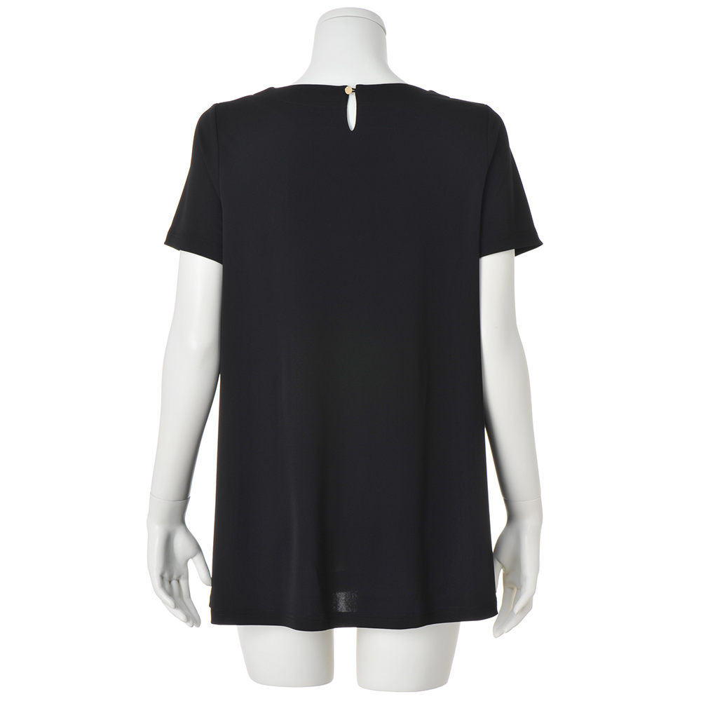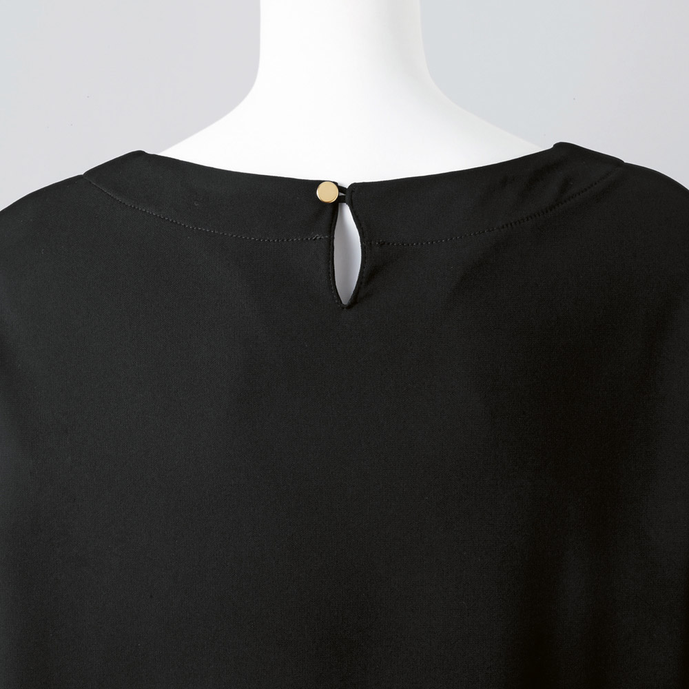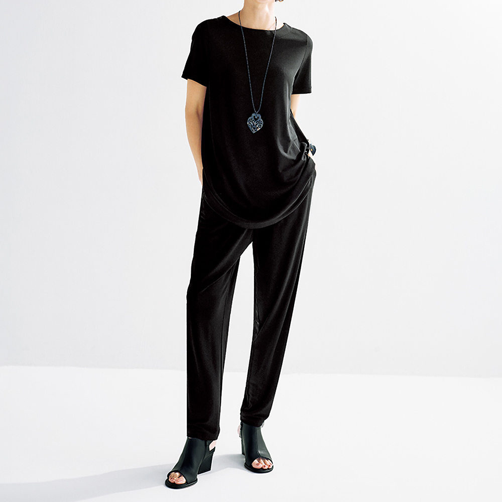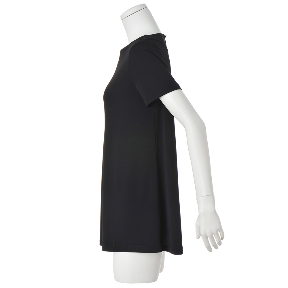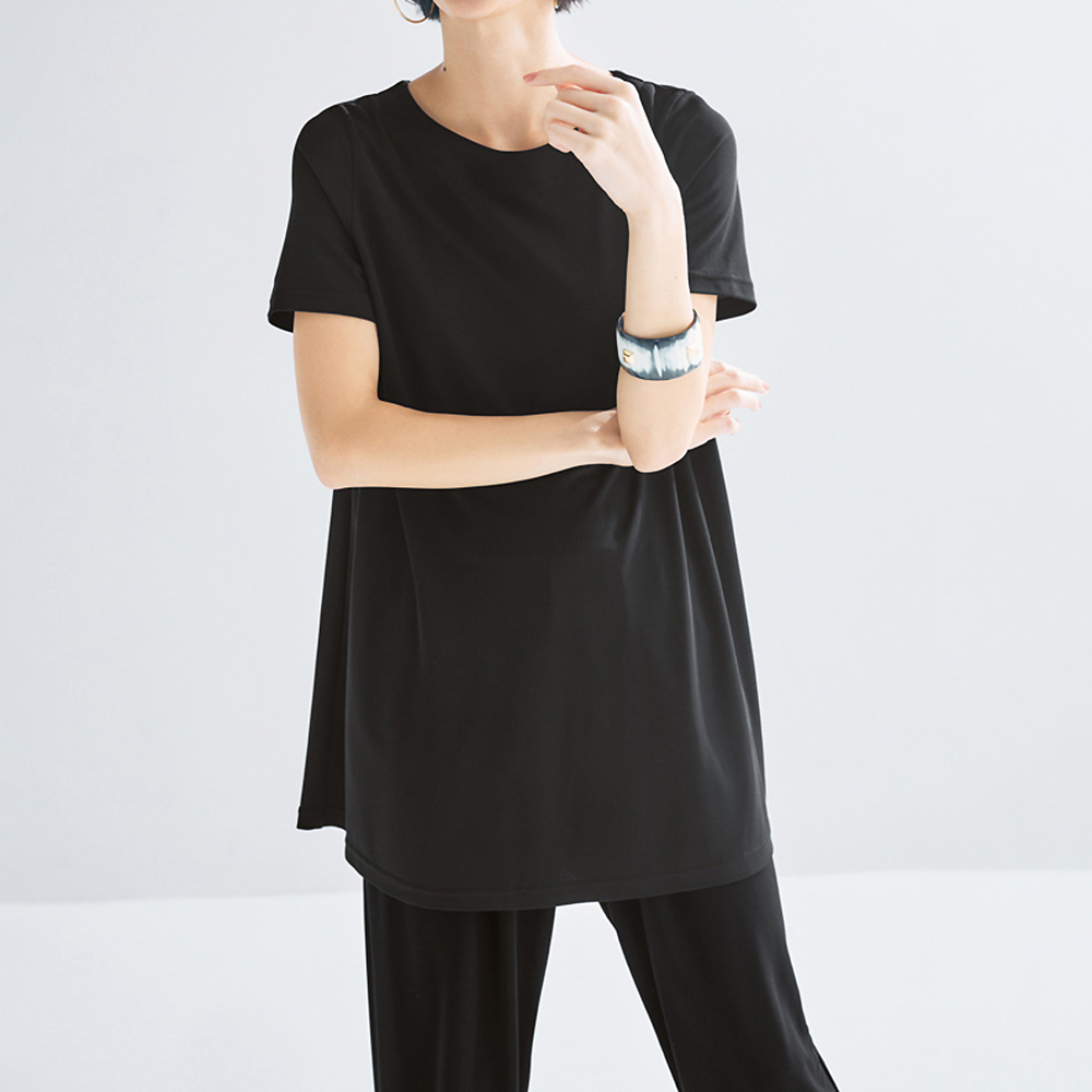 シーンレスに映える、クールなモード服。流麗な落ち感、サラリとした着心地、接触冷感など、優れたジャージー素材を使っています。半袖のプルオーバーは細身Aラインでスタイリッシュに仕上げ、裾の表情で変化をつけて。後ろ首下の金ボタンが洒落感を上乗せします。