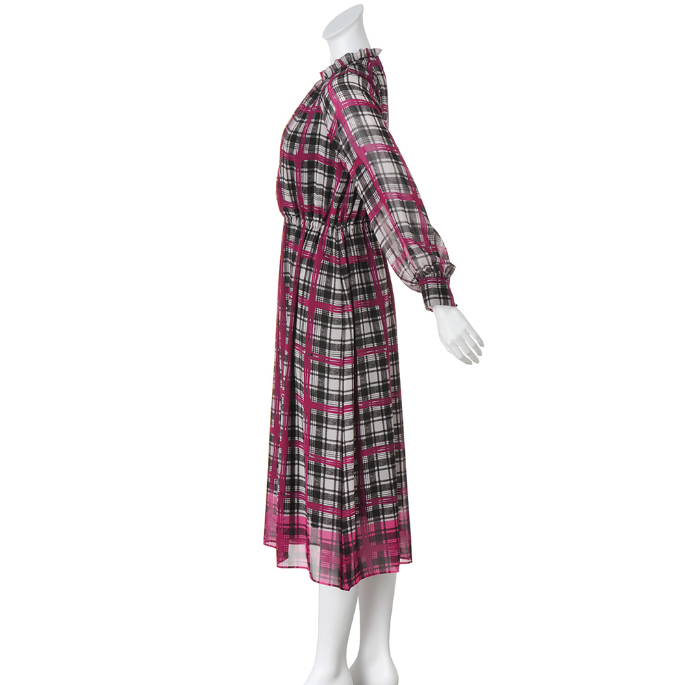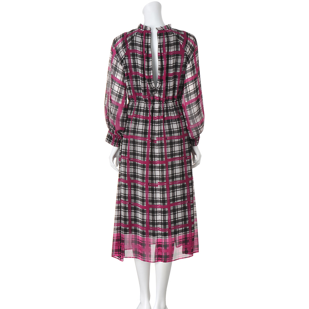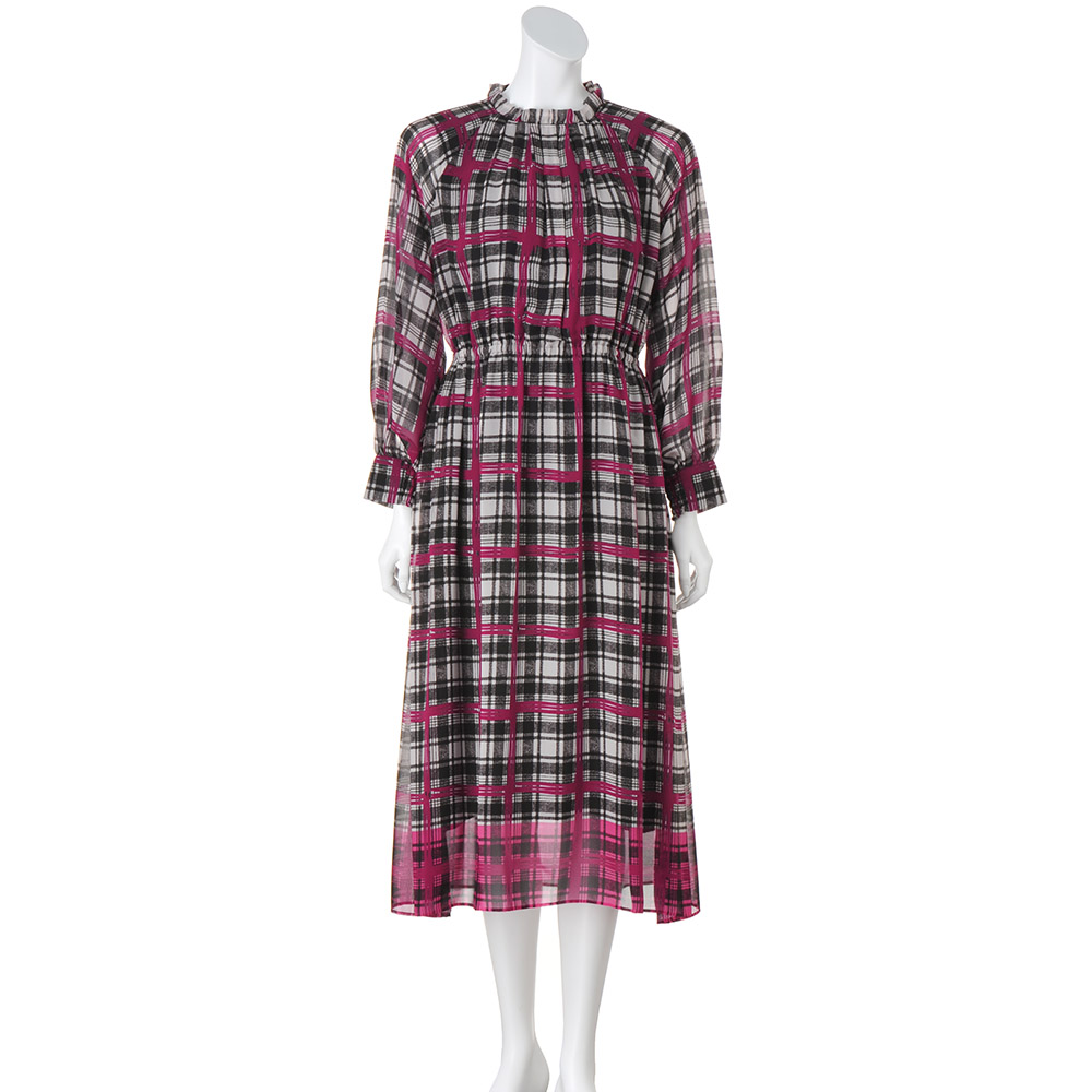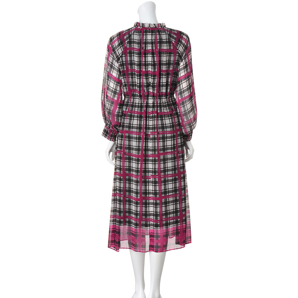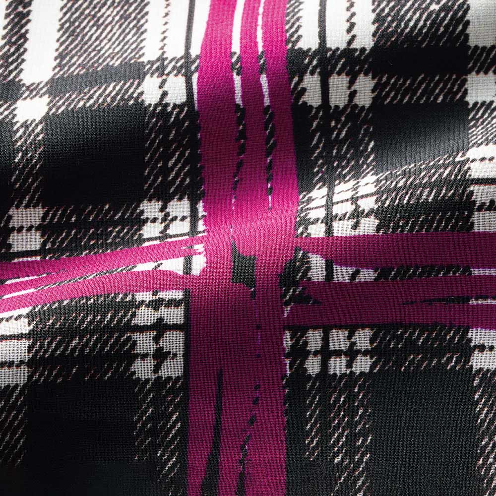 モードな感性が描き出す イタリアのプリント卓越した色彩センスとアートな美意識が調和したデザインが大人を魅了するイタリア「エリカ」社のプリント。カラフルで繊細、毎日を彩るアート「エリカ」のチェック柄で知的かつ大胆に!モノトーンのグレンチェックにピンクの格子柄を手描き風に載せ、幅広のピンクを着丈に合わせて裾に配したパネルプリントは、パウダリータッチのシフォンジョーゼット素材。ピンクが溶け込んでゆくような柄行きを際立たせる黒の裏地を添えたロング丈のワンピースを完成させました。フリル襟の下にタックを入れて柄を崩しつつ柔らかな立体感もプラス。ウエスト部分はゴム入りで柔らかなフィット&フレアーラインに。さらに、袖のカフスは、内側だけゴムシャーリングを寄せデザインポイントになるだけでなく、たくし上げても落ちてこない利便性も叶えています。