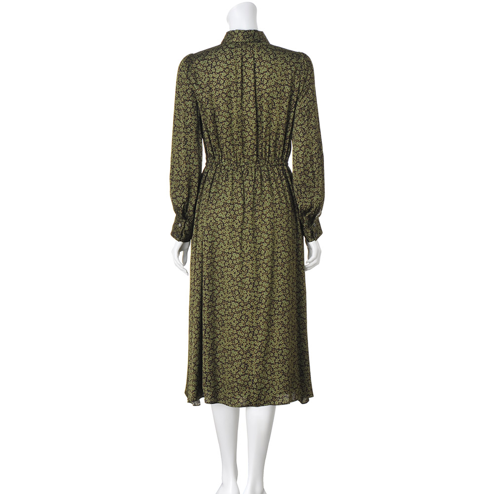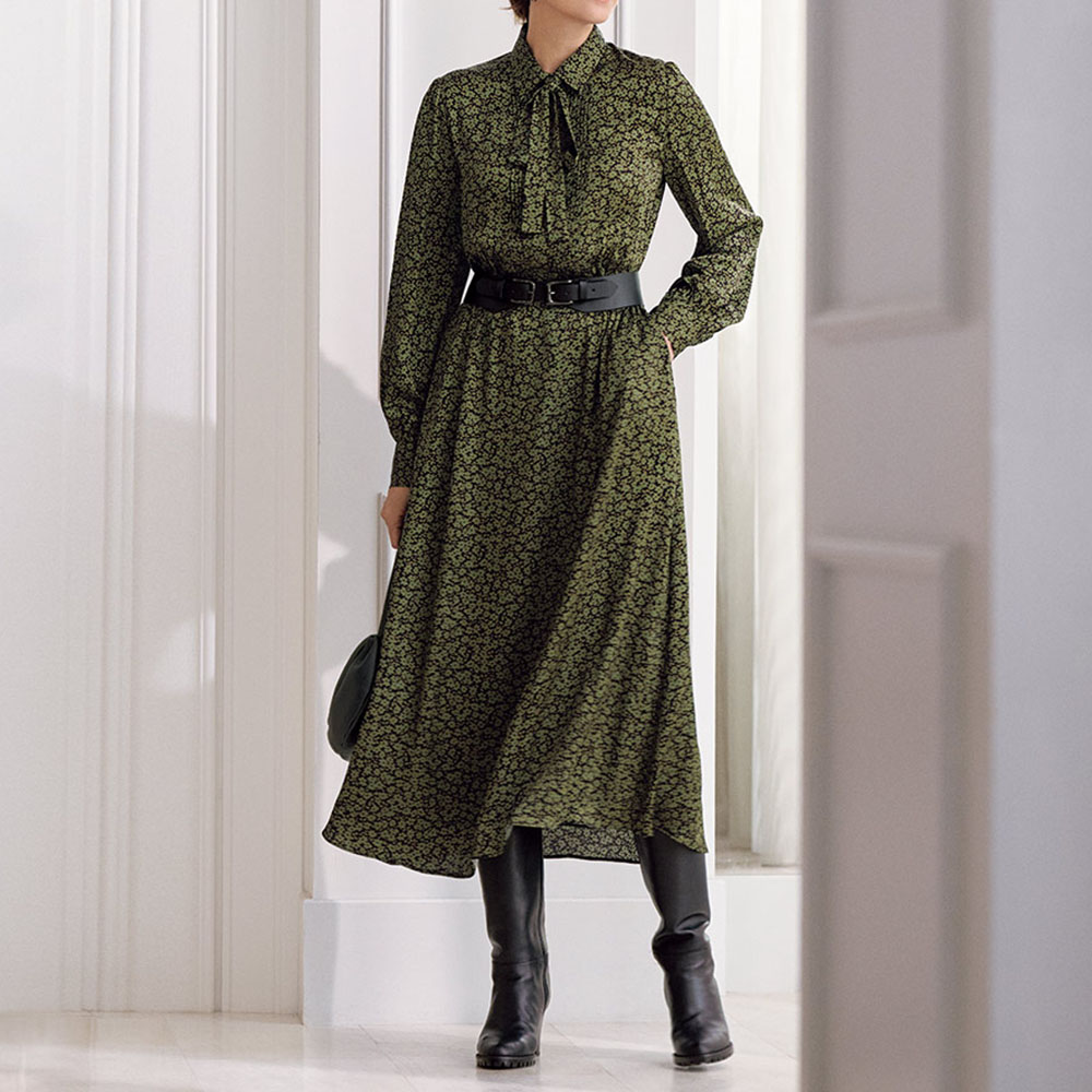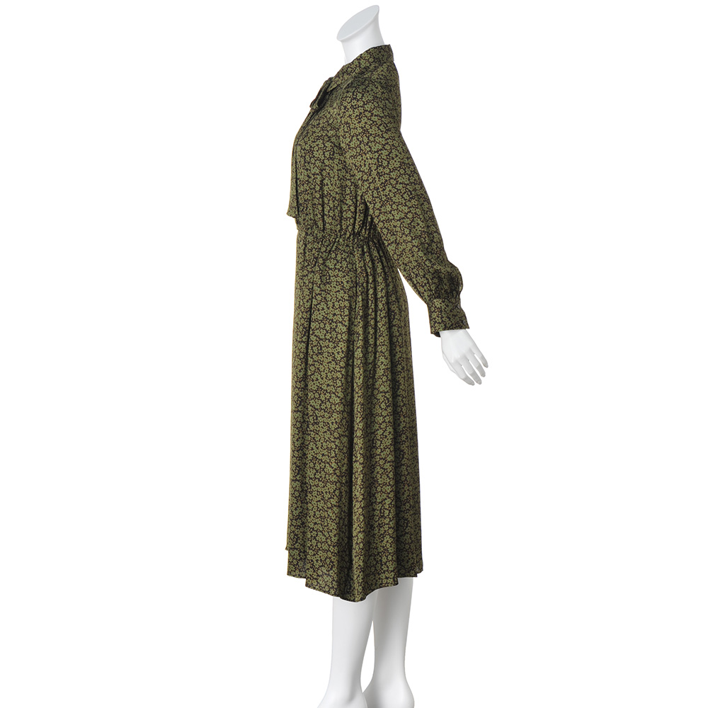 シックな小花プリントで優しい気持ちにシフトイタリアならではの配色センスが光るマットサテン生地で仕立てた、大人がシックに着こなせる小花柄ワンピース。ブラック地にちりばめられているのは、オレンジで縁取られたカーキのシャドーフラワー。重なるように描かれているため一見、花柄とわかりにくく、上身頃のピンタックやスカート部分のギャザーフレアーで柄を崩しているのも着こなしやすいポイントに。デザインは着ればブラウジングが決まるウエストゴム仕様。付け外しできる細いボウタイを襟元に結べば、クラシカルな女性らしさが漂います。POINT共布で仕立てたナローボウタイは後ろ襟内側のループに通す仕様。付け外しで簡単にイメージチェンジができます。