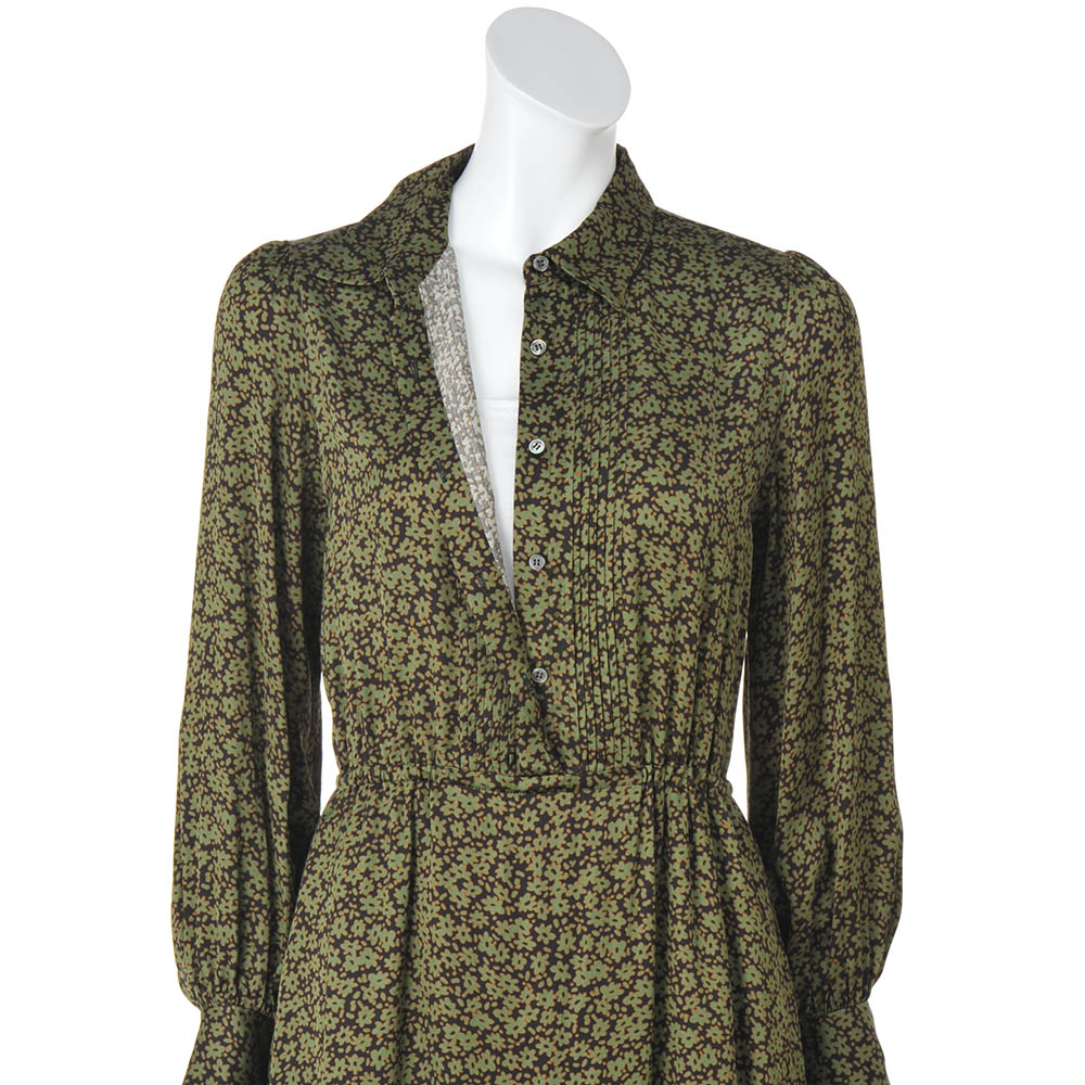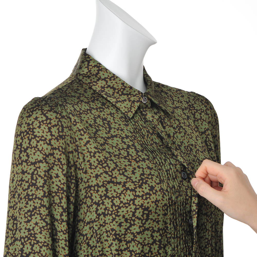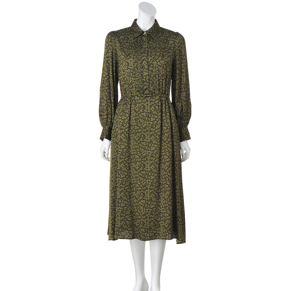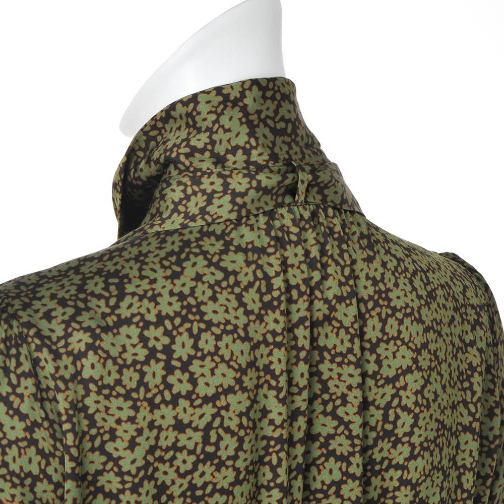 シックな小花プリントで優しい気持ちにシフトイタリアならではの配色センスが光るマットサテン生地で仕立てた、大人がシックに着こなせる小花柄ワンピース。ブラック地にちりばめられているのは、オレンジで縁取られたカーキのシャドーフラワー。重なるように描かれているため一見、花柄とわかりにくく、上身頃のピンタックやスカート部分のギャザーフレアーで柄を崩しているのも着こなしやすいポイントに。デザインは着ればブラウジングが決まるウエストゴム仕様。付け外しできる細いボウタイを襟元に結べば、クラシカルな女性らしさが漂います。POINT共布で仕立てたナローボウタイは後ろ襟内側のループに通す仕様。付け外しで簡単にイメージチェンジができます。