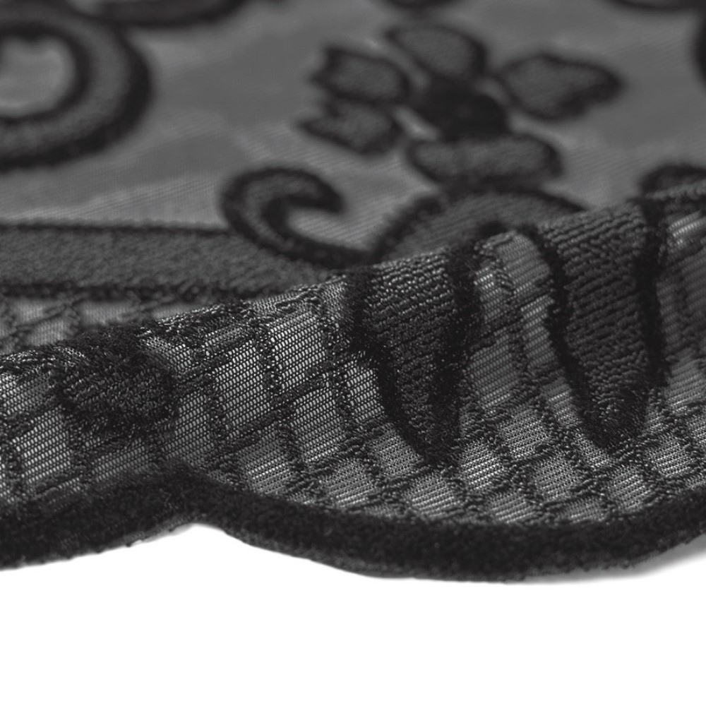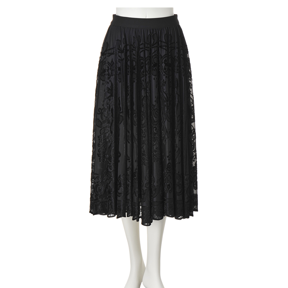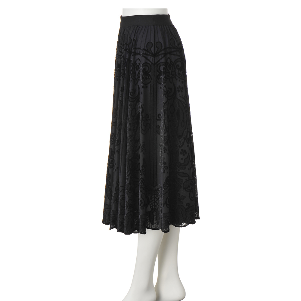 柄部分にフロッキー風の起毛感のある素材を用いて、ジャカードでクラシカルなレース調の柄を表現。たっぷり贅沢なフレアシルエットで、ドラマティックな着こなしを演出します。レースの柄に合わせてスカラップ風にカットした裾の表情もエレガント。