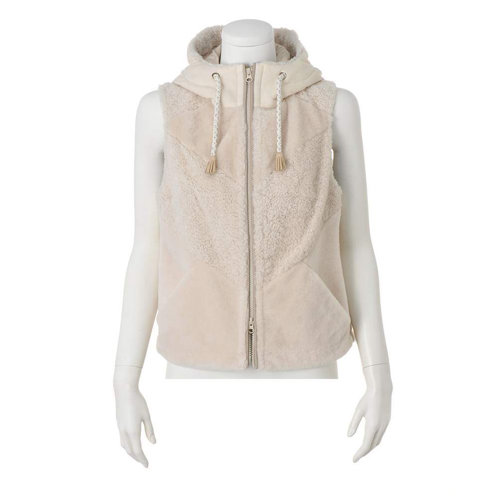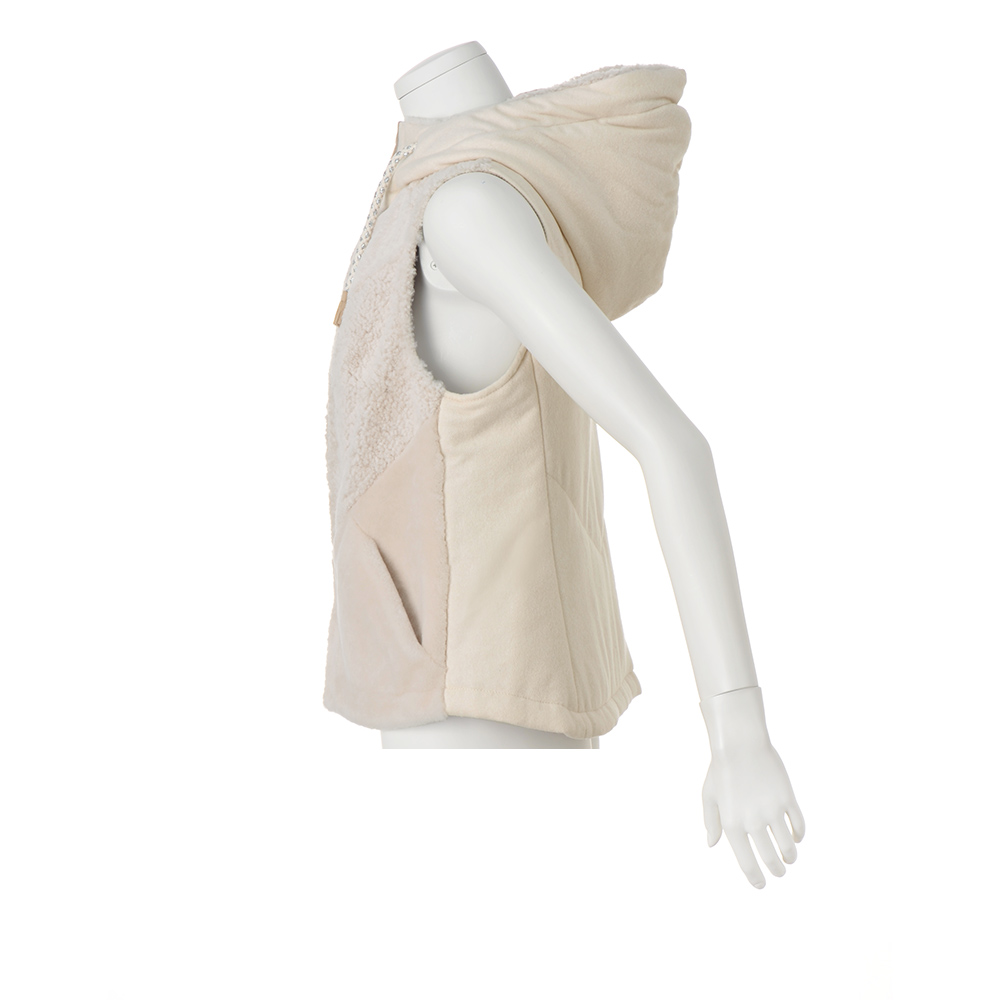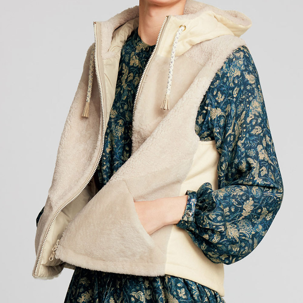 洗練された重ね着を自在に叶えるベスト。主役アウターとしてもコートインでも活躍する中わた入りベストは、イタリアのブランド「リサコンテ」からのセレクト。前身頃はパッチワーク風ムートン、フードと後ろ身頃はカシミヤ混ウールの素材コンビに、フードに通したフリンジ付きの紐が軽妙なアクセントを添えています。POINT前身頃は、ムートンのピース一枚一枚の色、毛並の向き、毛量を合わせながら、職人が丹念な手作業でパッチワークに仕上げています。フードと後ろ身頃はカシミヤ混ウール素材ですっきりとした印象に仕上げています。フードに通した紐とフリンジが、クラフト調の温かみのあるアクセントを添えています。程よいトレンド感と着回し力を備えたベストです。
