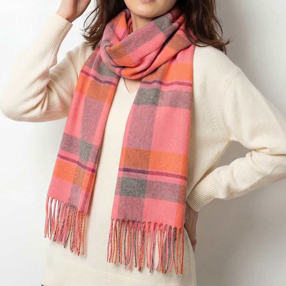 ときめきを届ける洗練配色のチェック柄カシミヤストール柔らかな肌触りと共に、上品なアクセント効果を発揮するカシミヤ100%ストールに、幸福オーラを放つイエローが効いたクールモダンなグレー系、鮮やかなピンク系、気品溢れる濃淡ブラウン系の3種類のチェック柄が登場。二つ折りでも三つ折りでも首元に収まりのいい厚みも計算した長さなので、そのまま垂らしたり、2重に巻いたり…様々にアレンジできるのが魅力です。