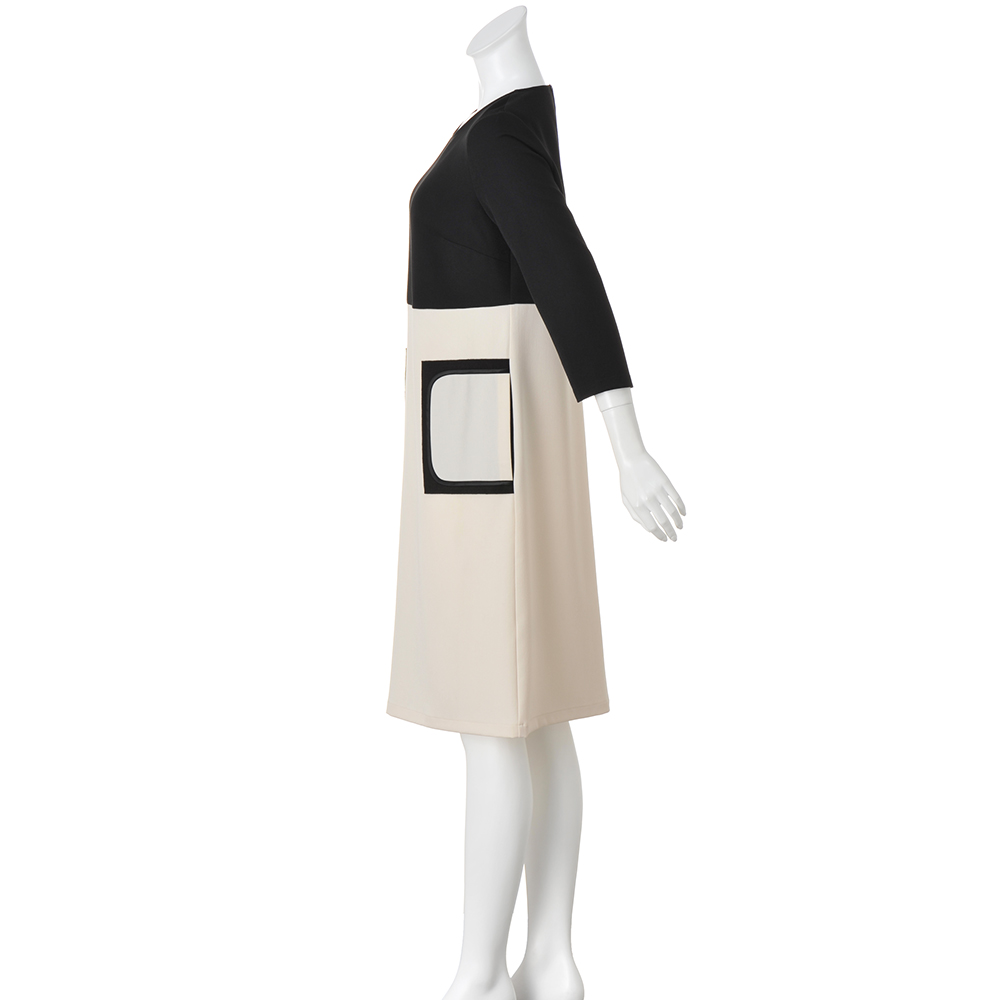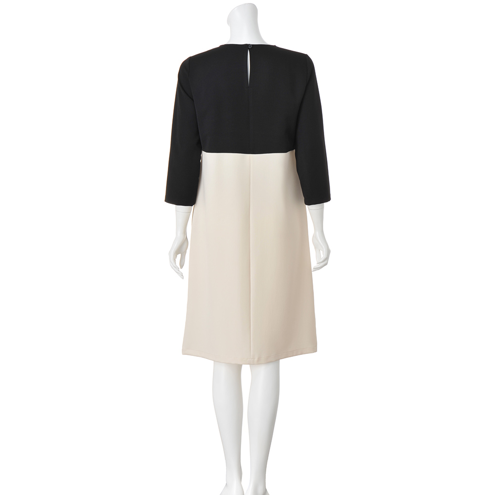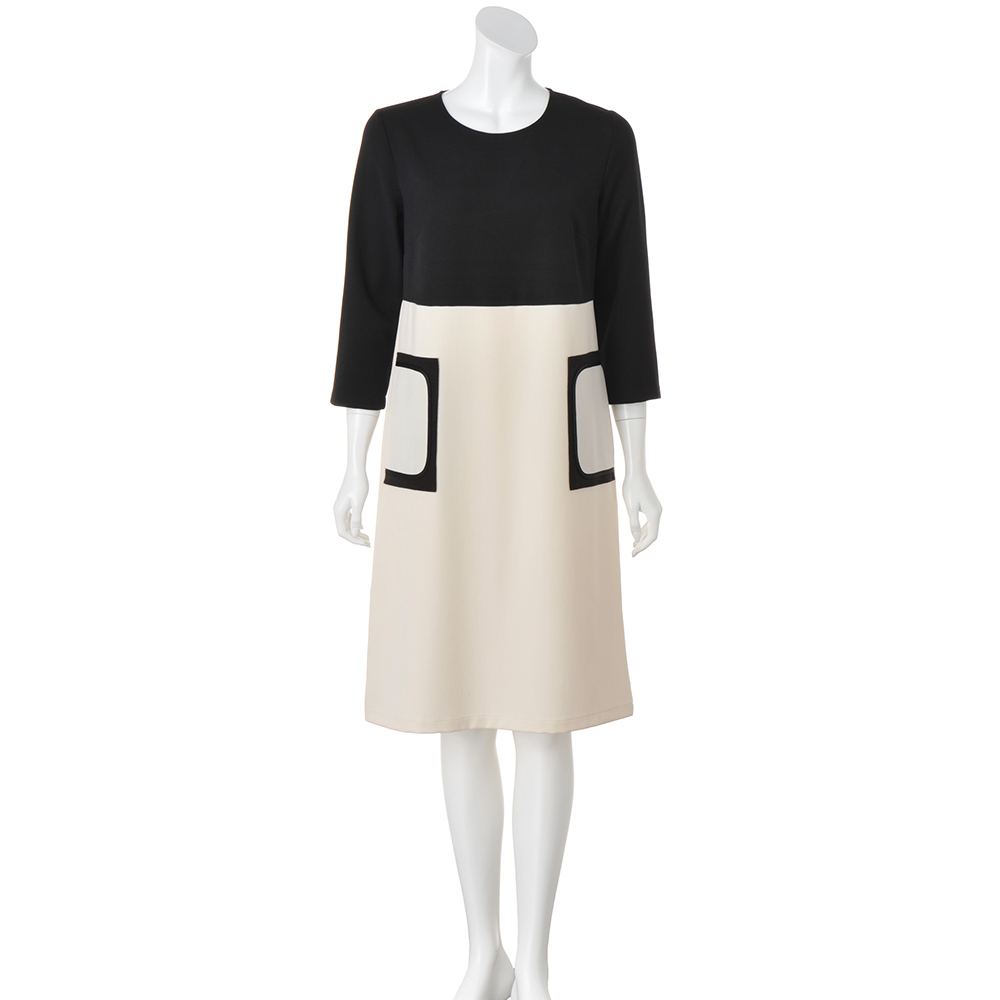 ブラック×オフベージュの色の組み合わせが、どこかレトロなムード漂うワンピース。大胆なポケットのデザインが目を引きます。すとんとしたシルエットで楽に着られ、配色と切り替えの視覚効果でスタイルアップも。一枚仕立ての7分袖で、季節問わず活躍します。#SLASH# - スラッシュ -ファッションとアートの共存をコンセプトにイタリアで誕生したブランド。女性らしいシルエットや、華やかさをプラスしたデザインに定評。
