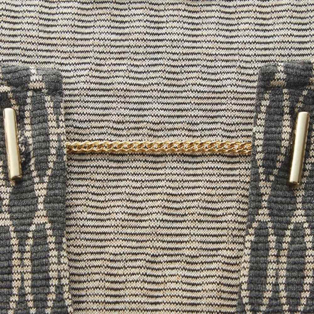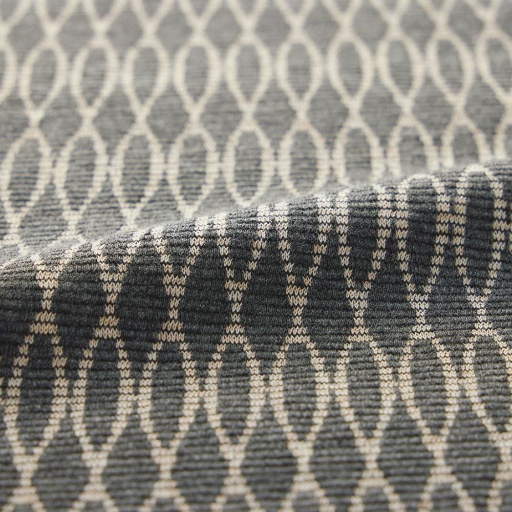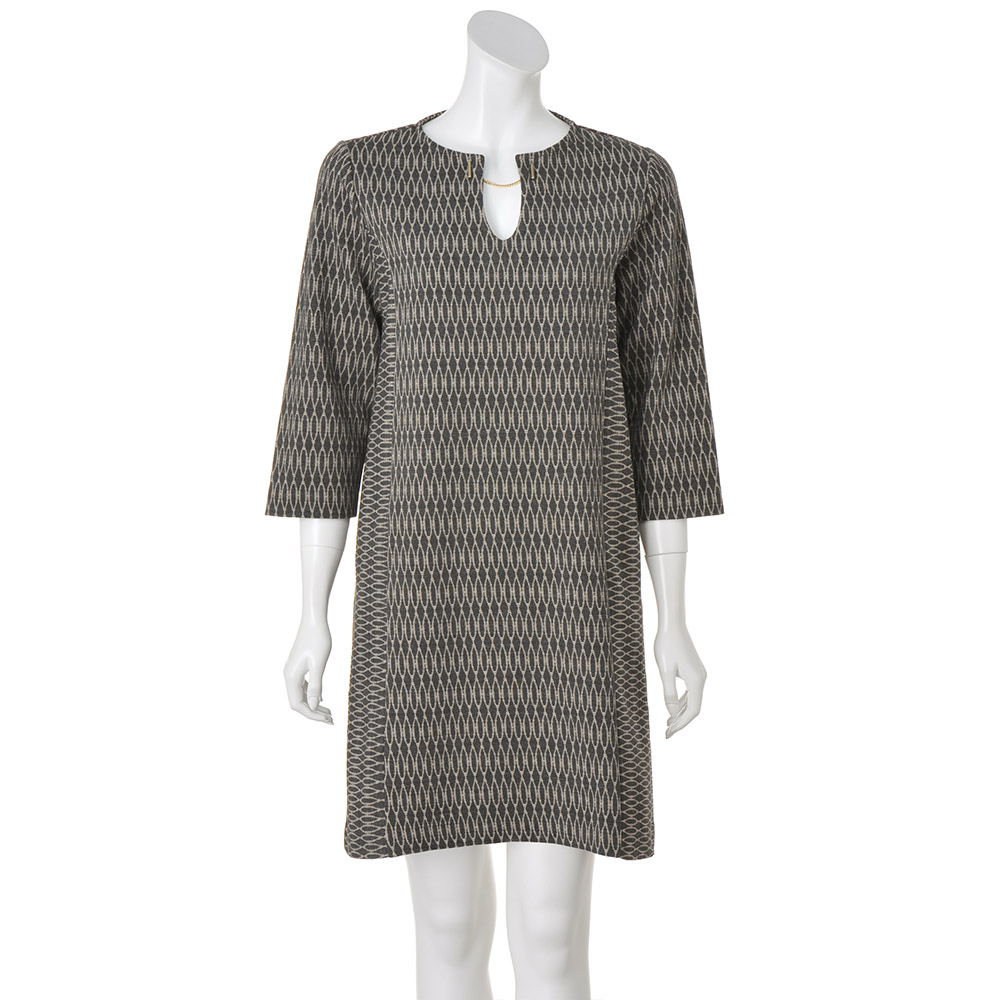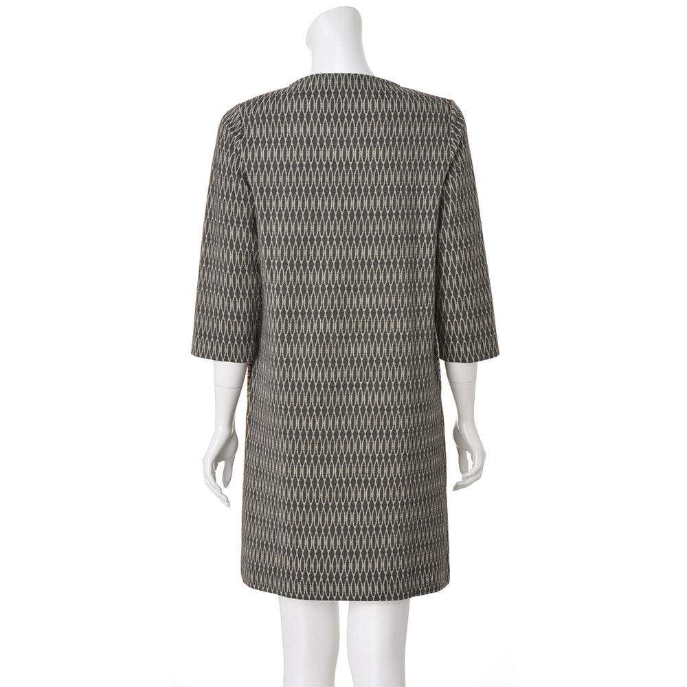 グレー×オフベージュの幾何学柄が印象的。総柄ながらシックな色合いで気負わず着られます。