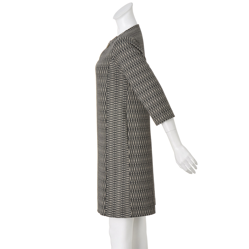 幾何学柄をジャカードで表現した、美シルエットのワンピース。サイドの切り替えと、柄を縦使いする視覚効果で細見えを叶えます。レーヨン混のさらりとした着心地と、ジャージー生地の動きやすさも兼備。胸元はスラッシュ開きに金具を配し、華やかに彩ります。AMETHIST - アメジスト -Made in Italyにこだわり、ファミリーで営むイタリア発のブランド。現代を生きる女性のニーズに応えるべく、熱意を持ったものづくりが魅力。
