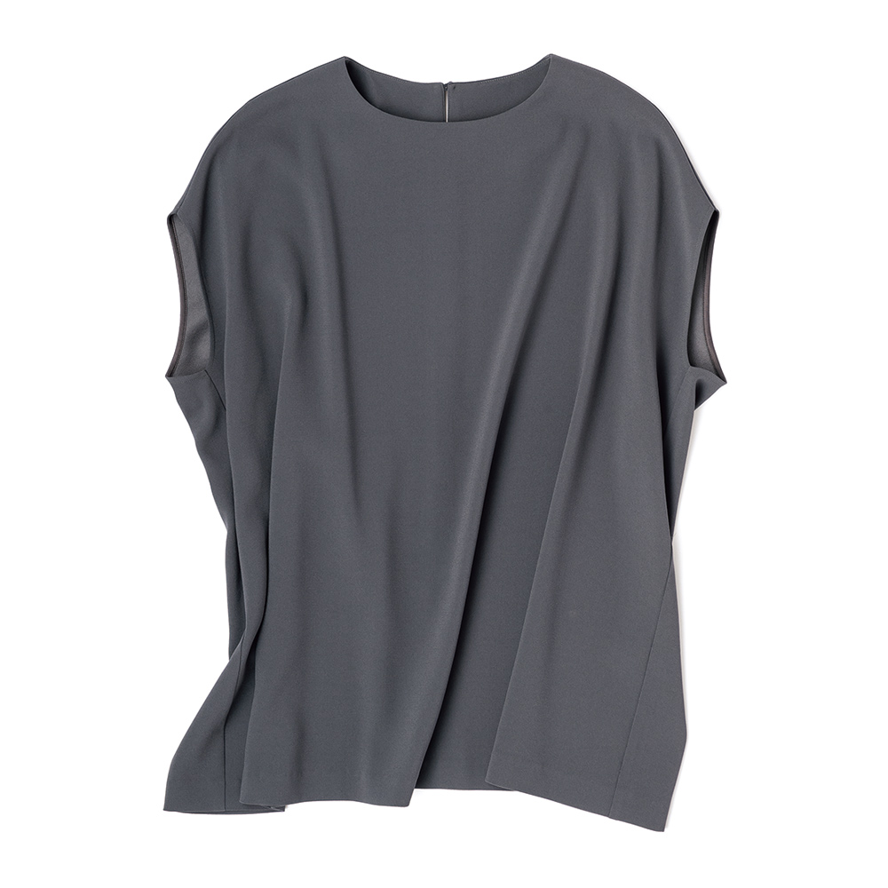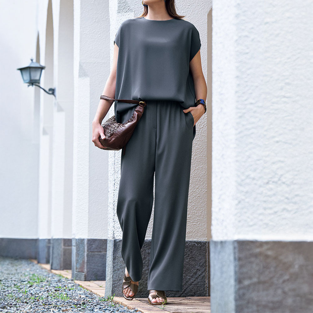 旅先でも頼りになるモードを心地よく楽しんで日常から旅先まで役立つセットアップのご提案です。素材は、高級感溢れるルックスを備えつつシワになりにくいバックサテンジョーゼット。トップスは、ゆったりとしたスクエアな身幅でアームホールから脇線にかけて少し前振りにしたのが拘り。腕周りをカバーしつつも動きやすく、前はほっそり、後ろはたっぷり、と表情豊かに仕上げています。大人をきれいに見せる仕立てに拘っているから、セットアップでも単品でも着回しが利くのです。≫ POINT単品使いもサマになる美シルエットが自慢