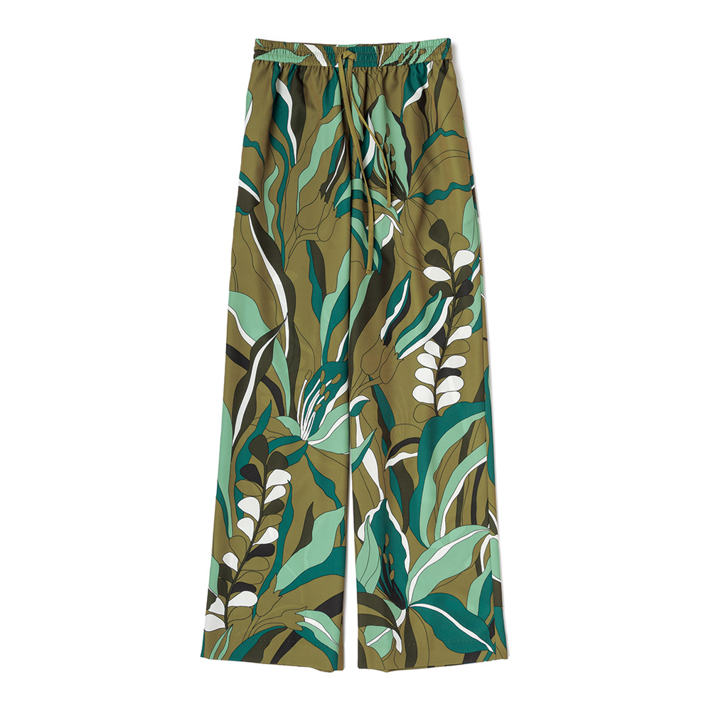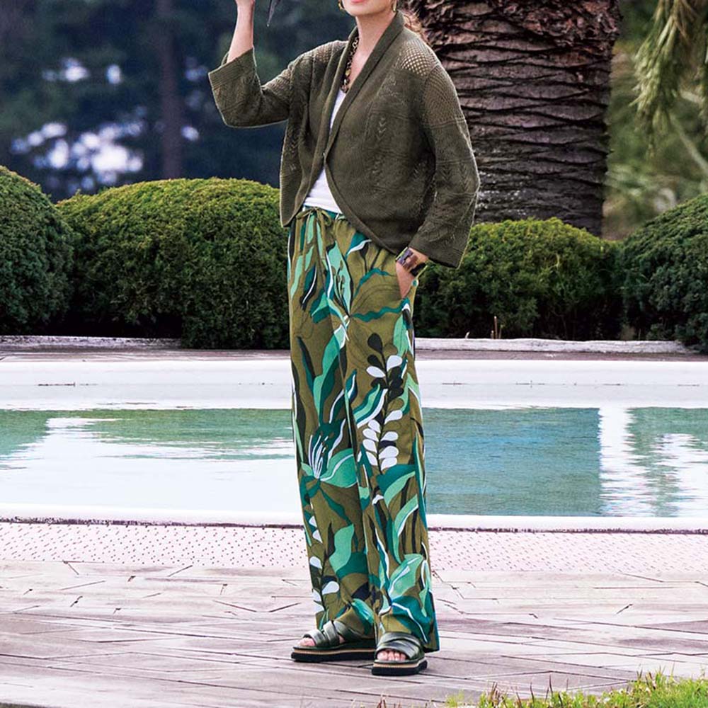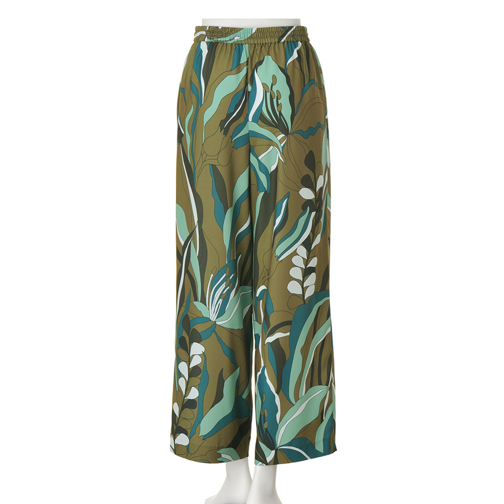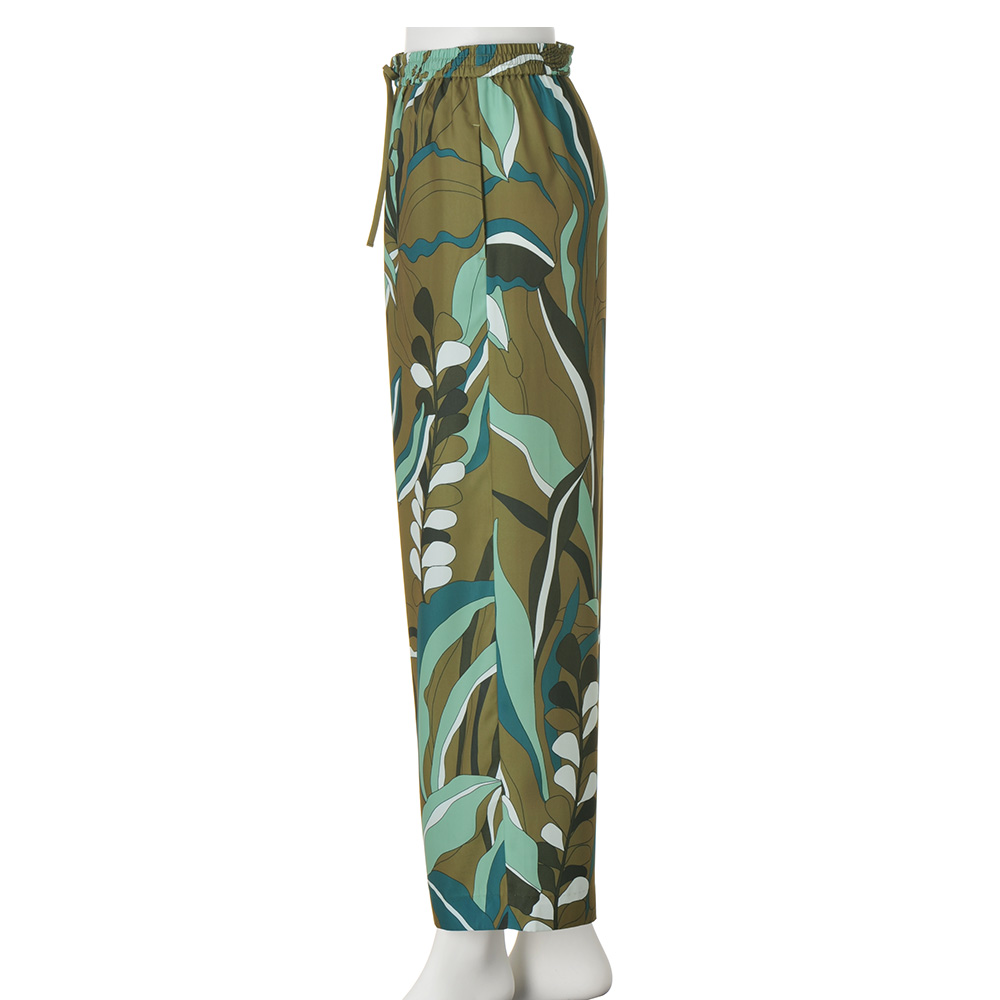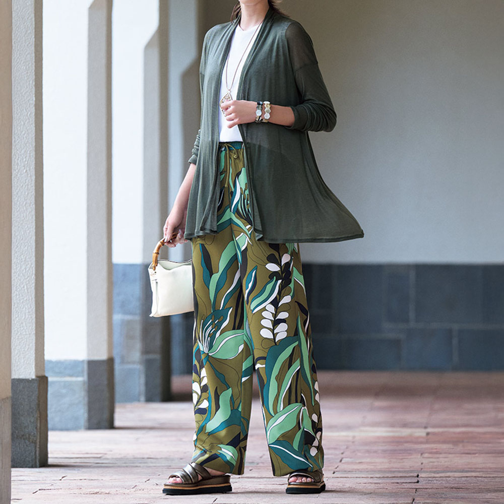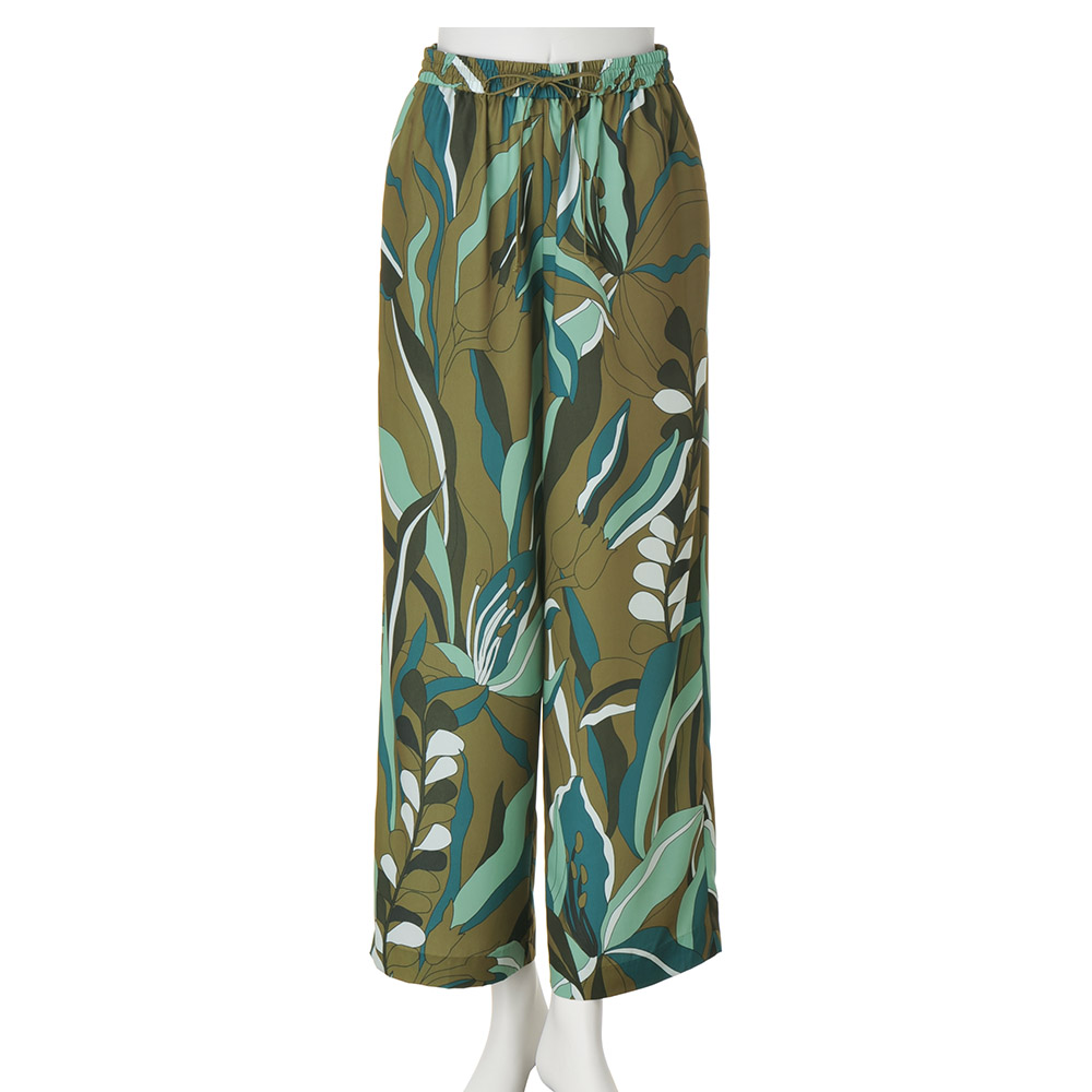 都会のセンスで着こなすシックトーン・リゾートカーキ、グリーン、ダークブラウン、ホワイトで描いたボタニカルリーフ柄のプリントパンツ。柔らかく、ハリのある生地を活かして一枚仕立てで肌離れのいいワイドシルエットのプルオンタイプを完成させました。リラックス感はあるけれどクールな配色だから、もちろん、街スタイルにもぴったり。≫ POINTウエストはオールゴム仕様にドロスト付きのプルオンタイプ。