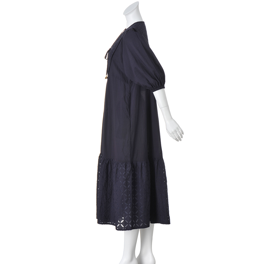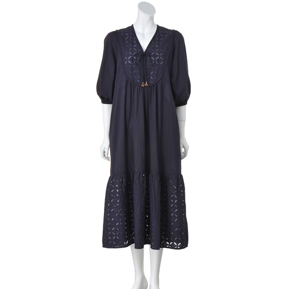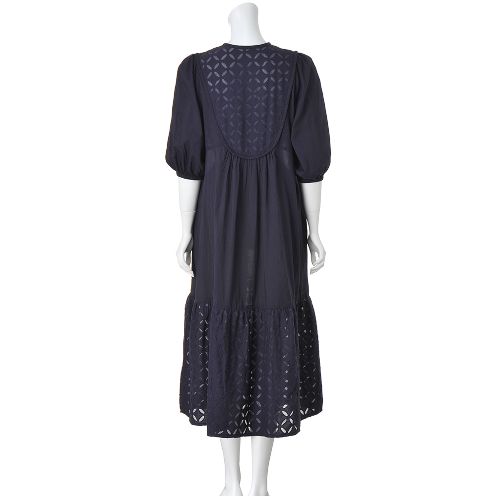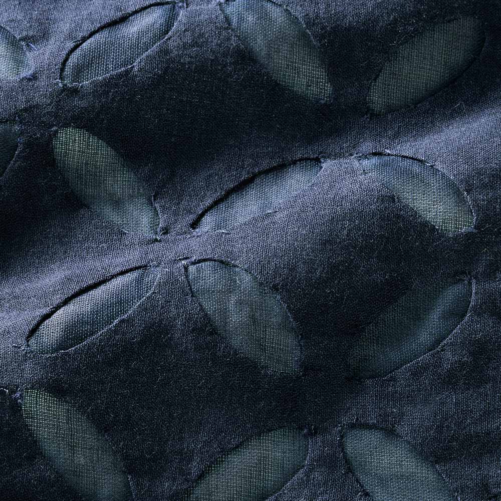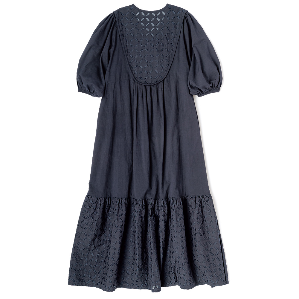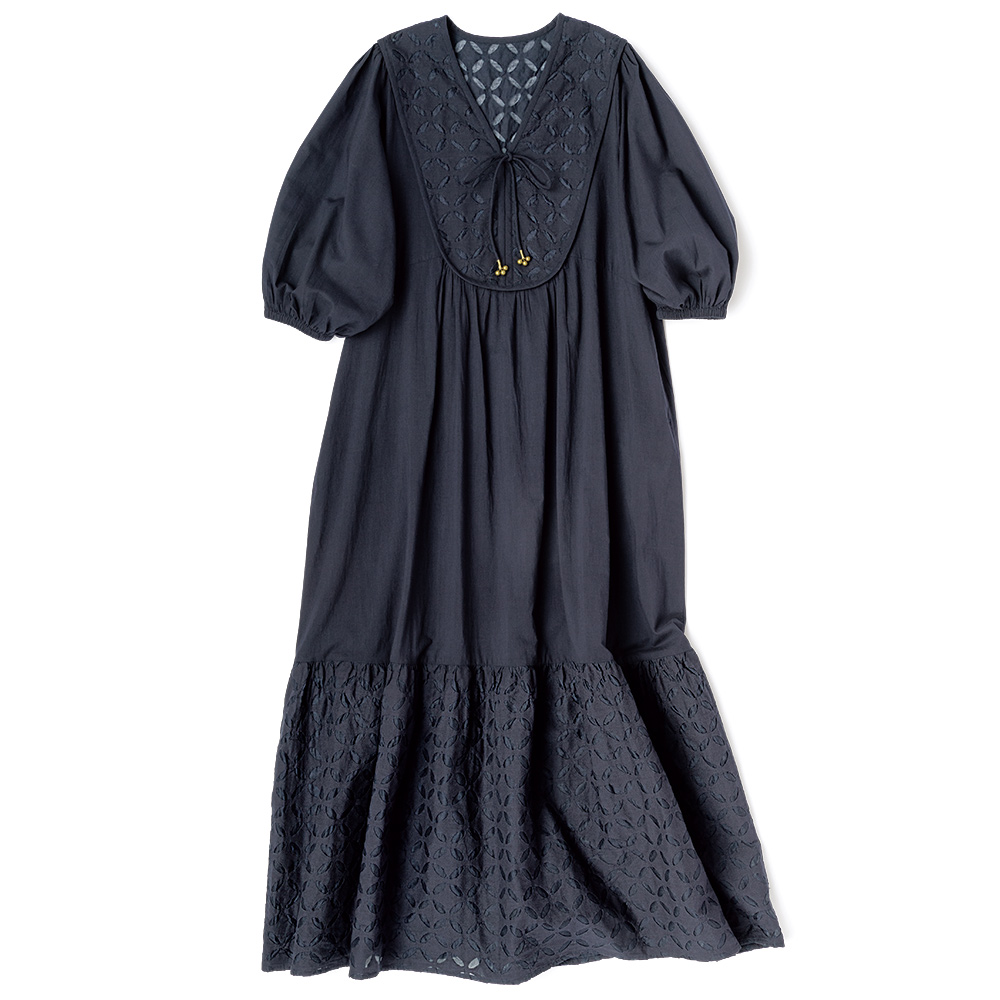 エキゾチシズムをスパイスにして異国情緒薫る“リバースアップリケ”を、ふわりと優雅なワンピースに。ブザム風の切り替えに小さなモチーフを潤沢にあしらって、気負いなくも存在感ある一着に仕上げています。シルエットは身体を解放するドレーピーなフレアーライン。前後のブザム部分に立体的な縁取りを入れることで、クラシカルな趣を引き立てて、全方位華やかな印象です。また丸やかなパフスリーブ、明るいネイビーが大人の可愛さを感じさせる理由に。フロントに揺れる金のチャームもエキゾチック。≫ POINT袖と身頃は軽やかな無地コットンを使用。