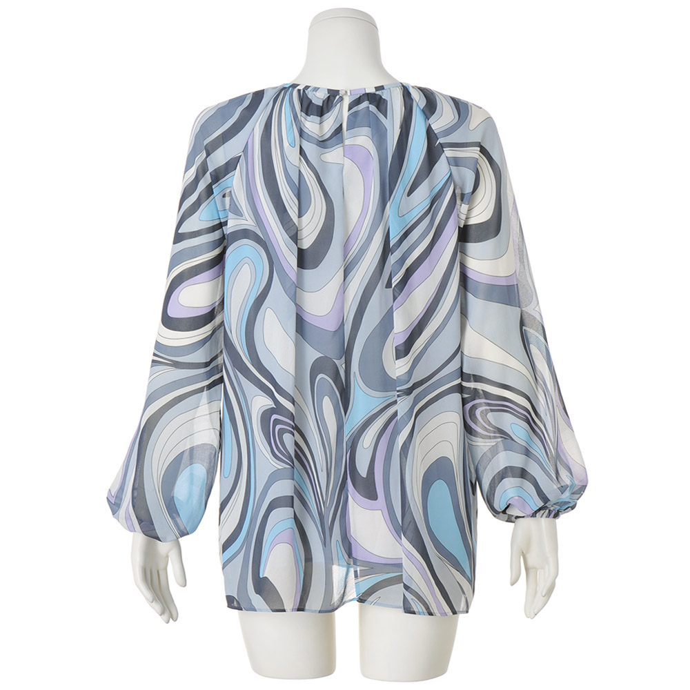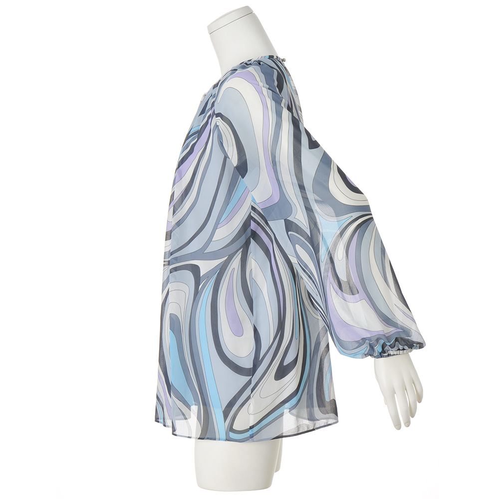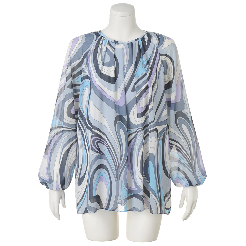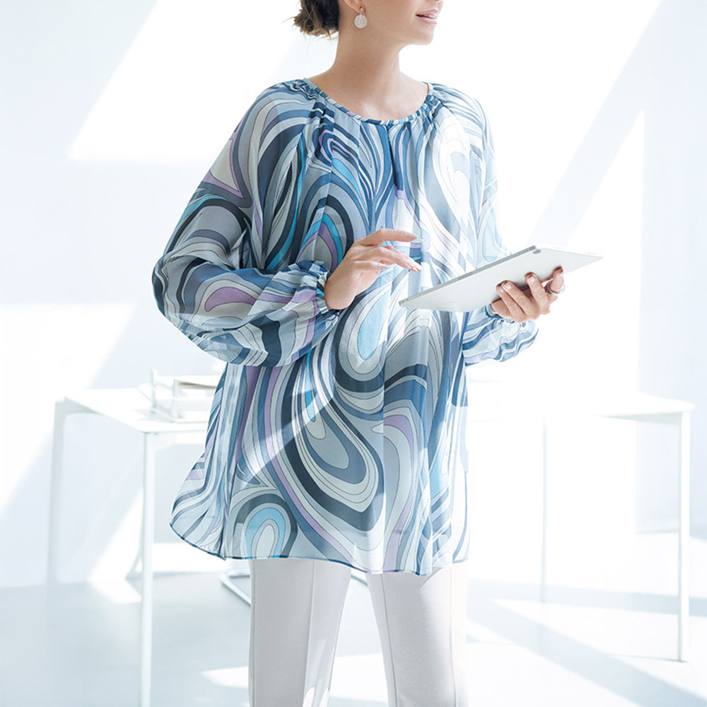 この柄・素材感なら纏うだけでたおやかファンの多いDAMAコレクションオリジナルの流線柄を、グレーの濃淡にライトブルーやライラックをきかせた、清涼感と落ち着いた女性らしさが混ざり合った配色で。シフォンジョーゼットのエアリーなテクスチャーを活かし、前後のネックラインにタックギャザーを寄せたふんわりブラウスに仕上げました。優雅なドレープによる体型カバー力、手洗いできるイージーケアで、汗ばむ季節も美しく。裏地は身頃のみ、一枚仕立てのパフスリーブからはほんのりと肌が透けて上品な色香が漂います。