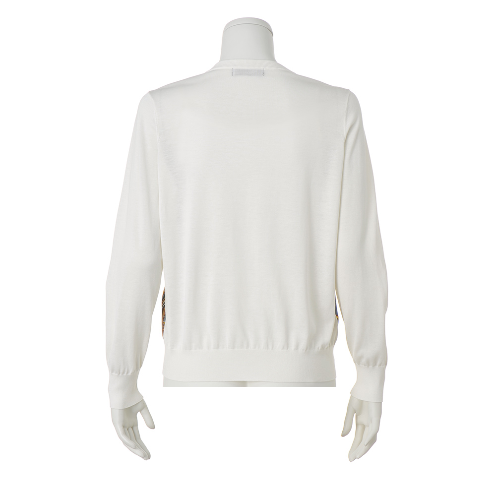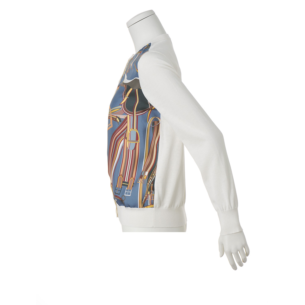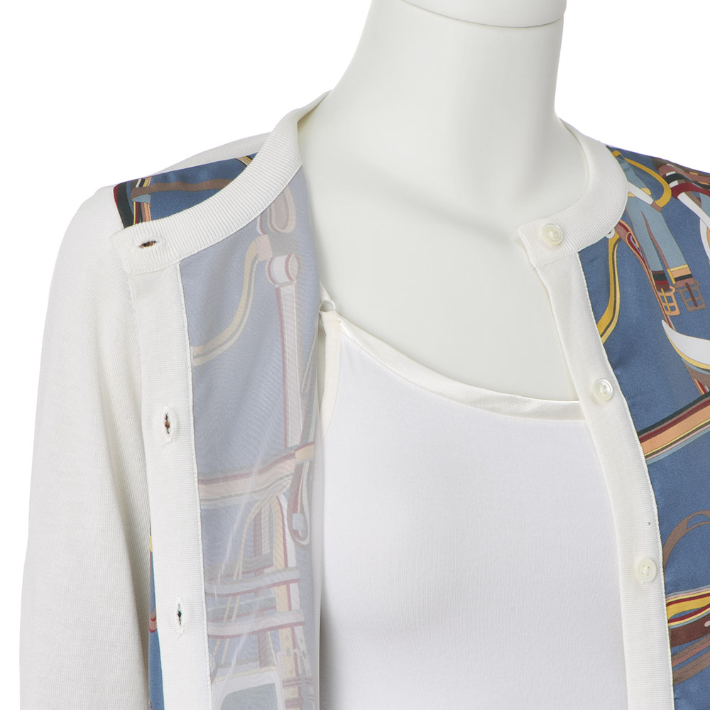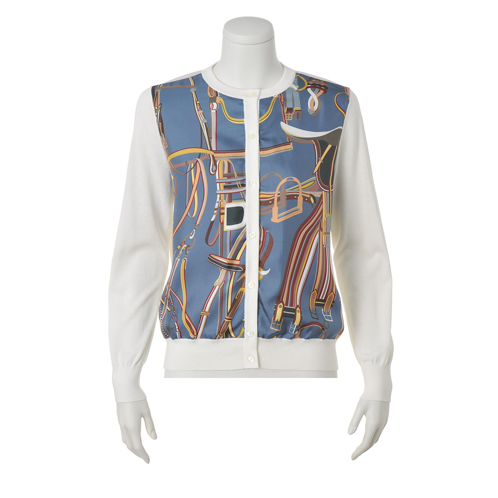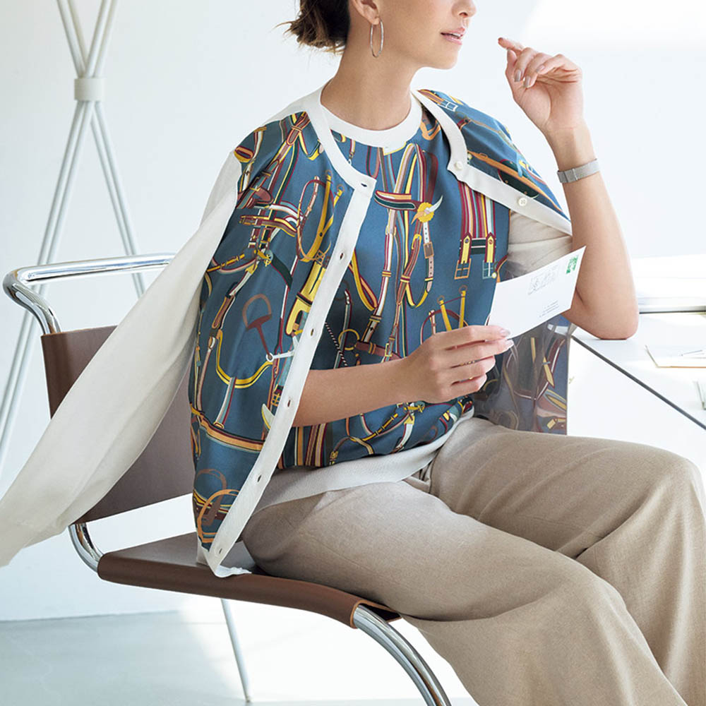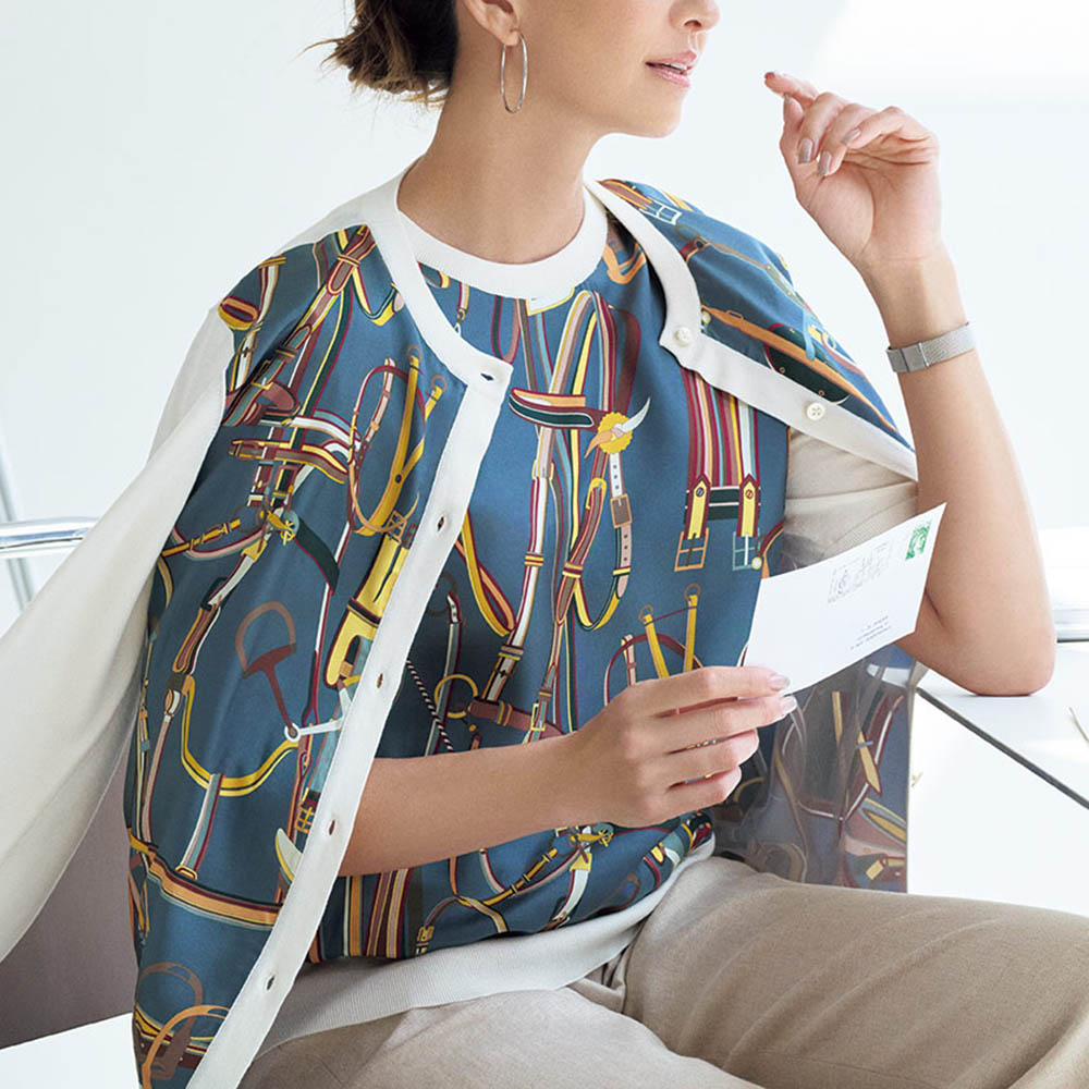 プリント×ニットの競演が職場に相応しい女性らしさシルクスカーフのエレガンスとニットの伸びやかな着心地を併せ持ったアンサンブルは、大人の女性が愛して止まない人気シリーズ。イタリア「RATTI」社製シルクプリント生地は、グレイッシュブルー地に馬具モチーフが描かれたクラシカルなデザイン。ベースのしなやかなハイゲージニットはロングシーズン着回せるシルクコットン素材です。前身頃に配されたプリント生地の裏側にはチュールを充てて、肌離れの良さも配慮。