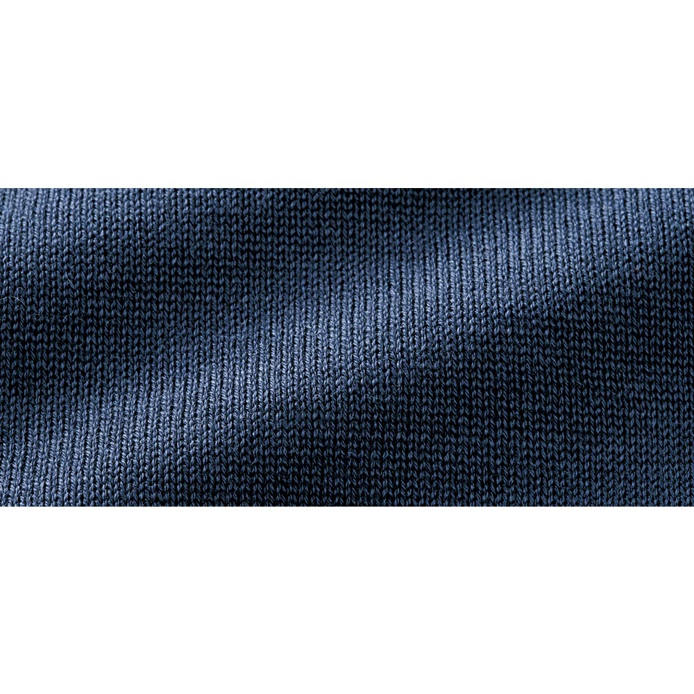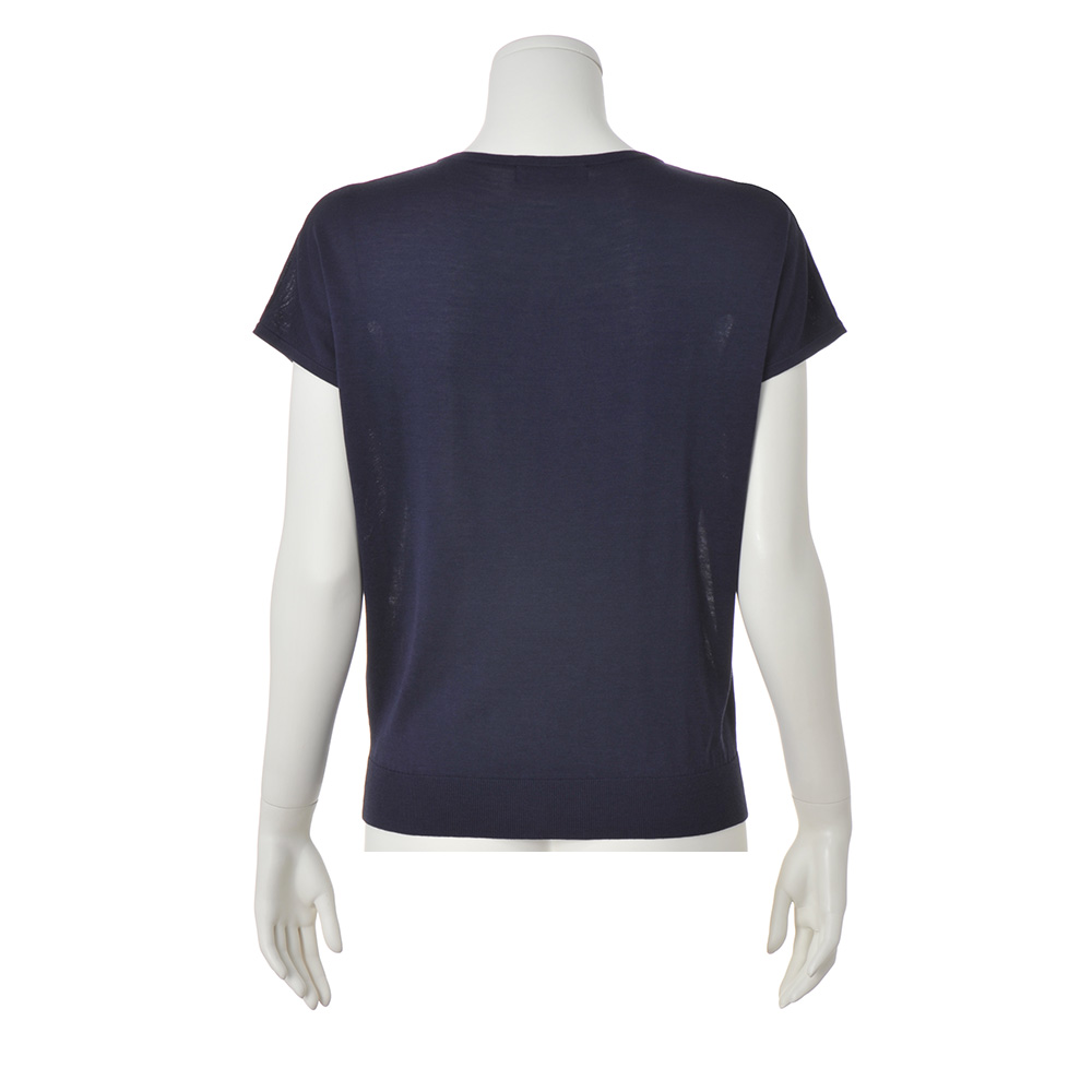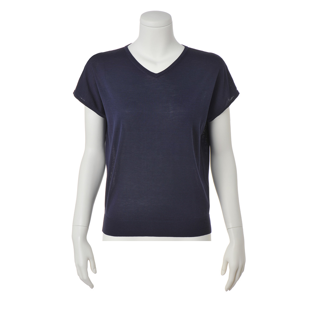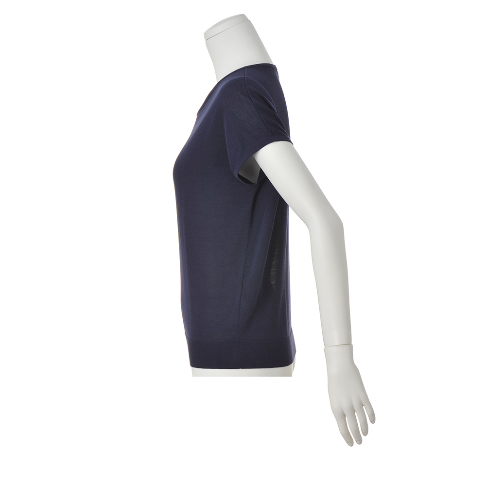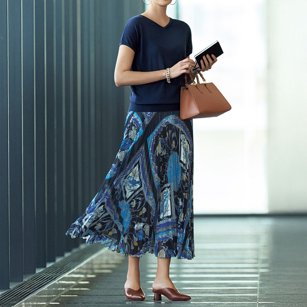 スカーフ柄の投入でネイビーが一気に華やぐネイビーベースと印象的なプリントで華やかに知性を薫らせた、仕事シーンに相応しいフェミニンスタイル。トップスはほのかな艶感となめらかな肌触りが魅力のシルクコットン糸のハイゲージニットで、鎖骨がちらりと覗く浅めのVネック、ゆったりとした身幅、二の腕を隠すフレンチスリーブで華奢見えと着やすさを両立。裾のリブできれいにブラウジングできるのも、ボトムを選ばず着られる秘訣です。