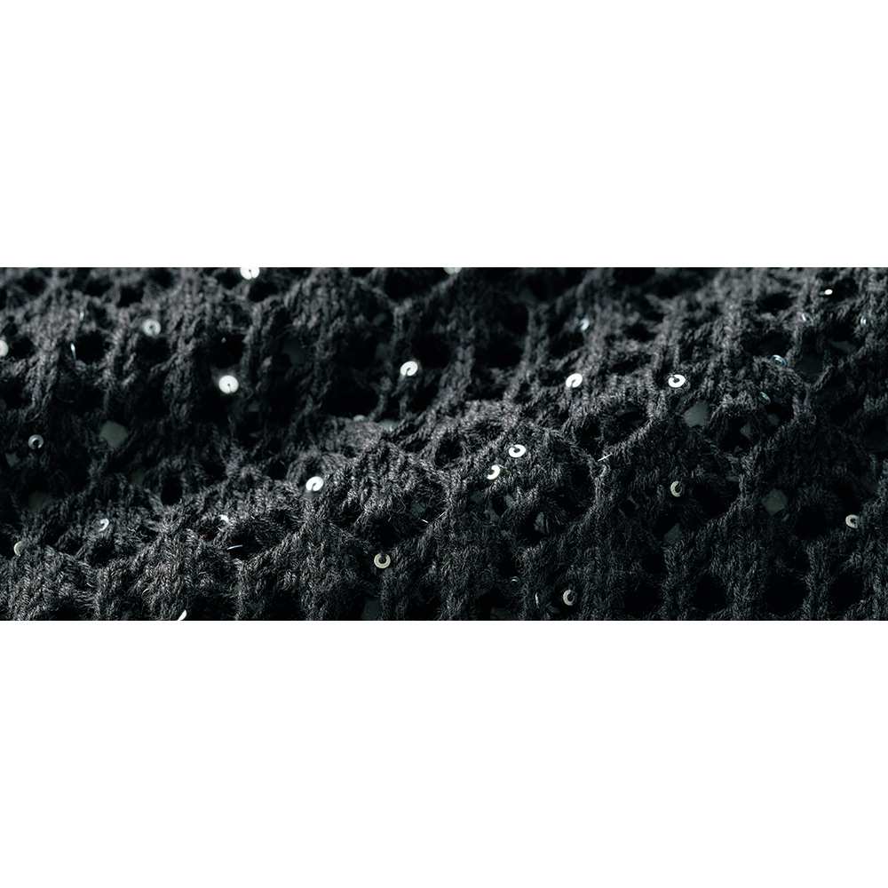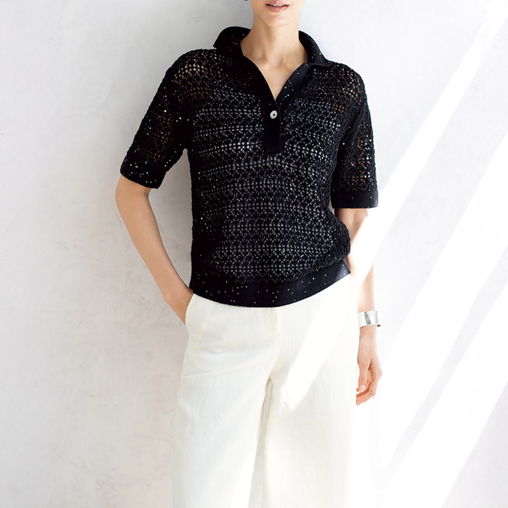 華やぎブラックは爽やかに楽しんでこそ着やすいポロシャツ型でいて、格段に魅せ上手なプルオーバーがこちら。素材は、さらりとしたリネンコットンに極小スパンコールを絡めたDAMAコレクションオリジナルの意匠糸です。きらきらと瞬くシルバーの光は糸の段階で引き揃えているため、奥深く上品な煌めき。ほんのり肌を透かすレーシーな編み柄にクールな存在感をプラスしています。スキッパー形の襟や袖口、裾はガーターでしっかり編んで、きりっとした表情に。貝ボタンを開けてインナーを覗かせてもサマになります。