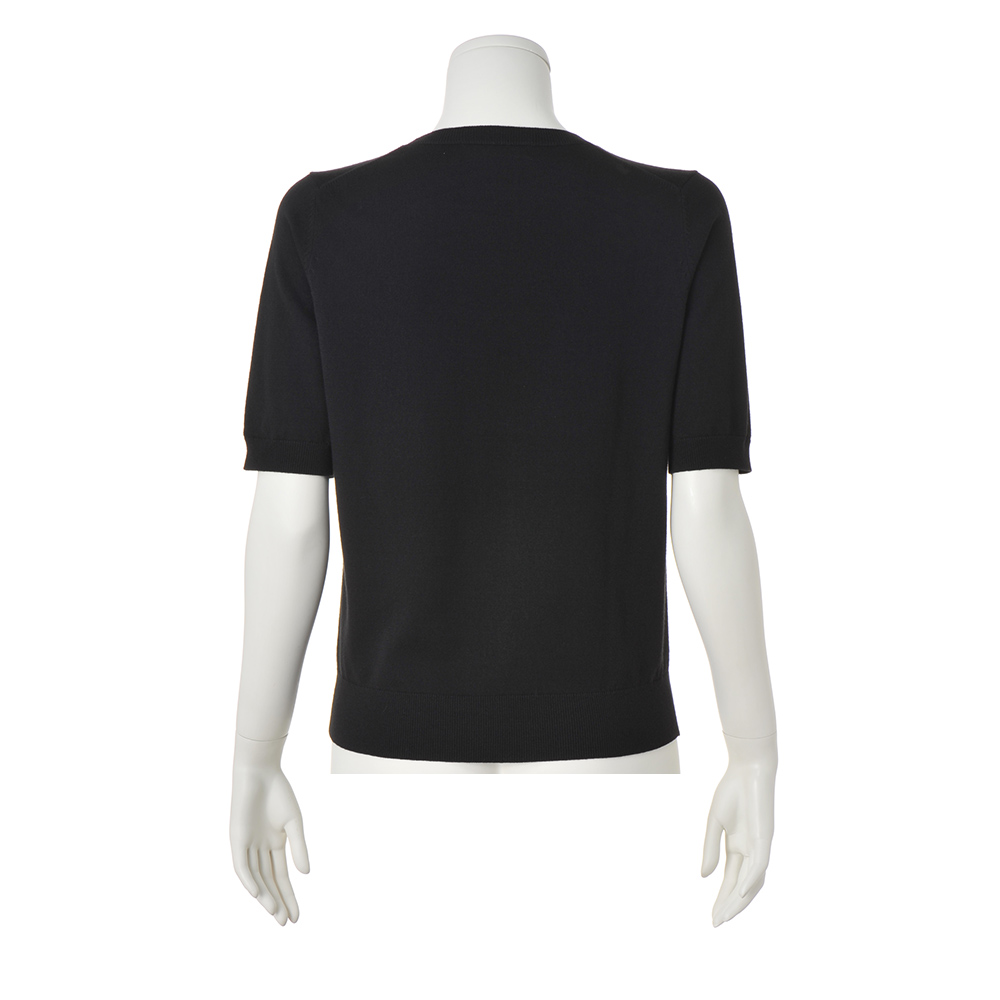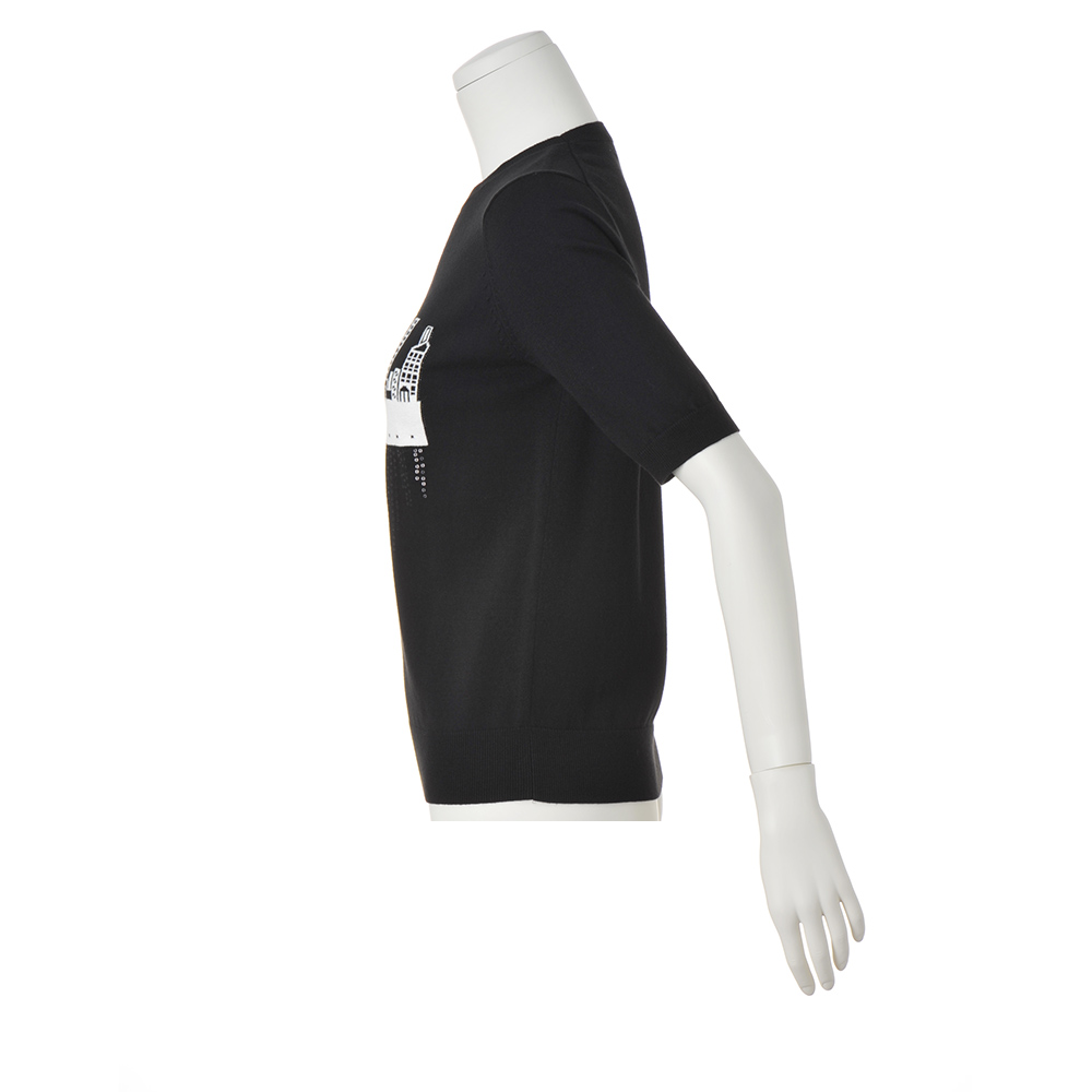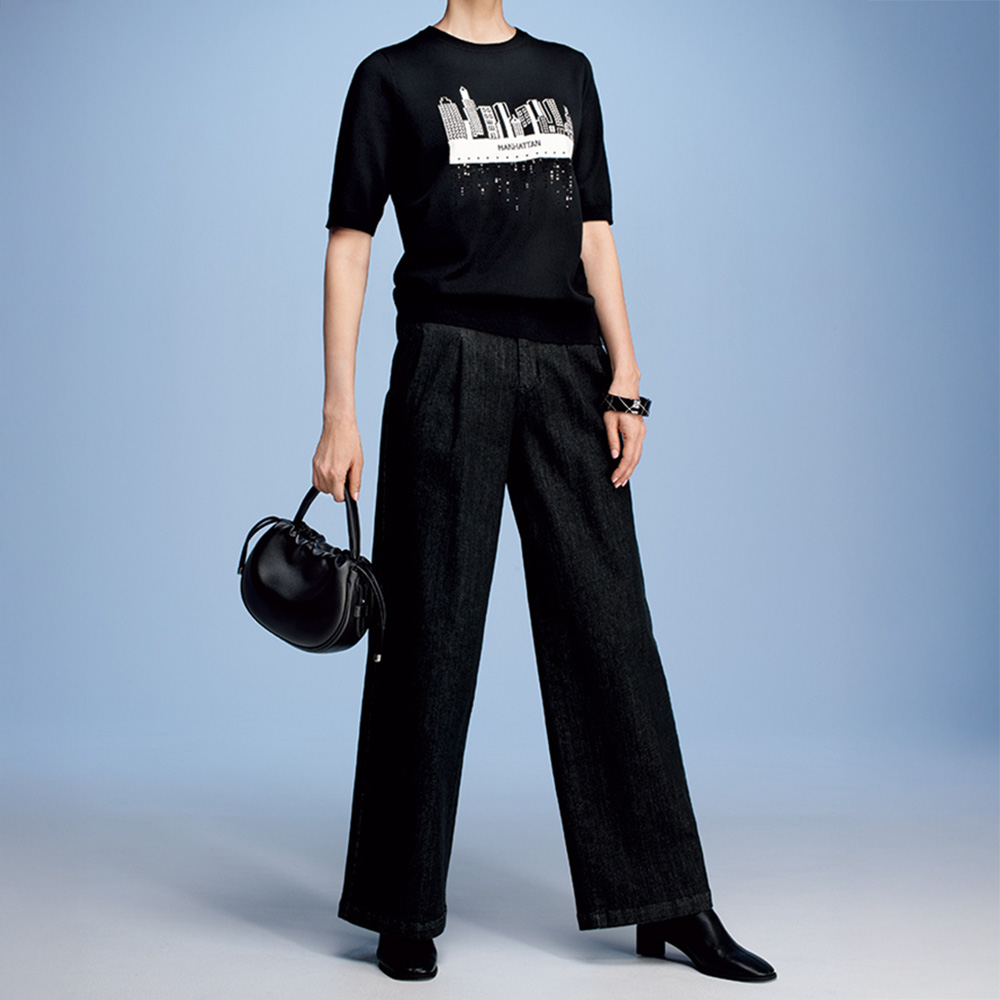 Tシャツではカジュアル過ぎる…、そんなときこそ手に取りたいニットプルオーバー空気を含んだリリヤーン形状のコットン糸を編み上げているから、膨らみ感があって軽やかな着心地。部分ジャカードで編み込んだマンハッタンの摩天楼モチーフと、ハドソン川に反射する明かりをイメージした黒スパンコールの輝きが、大人のリッチカジュアルを印象づけます。