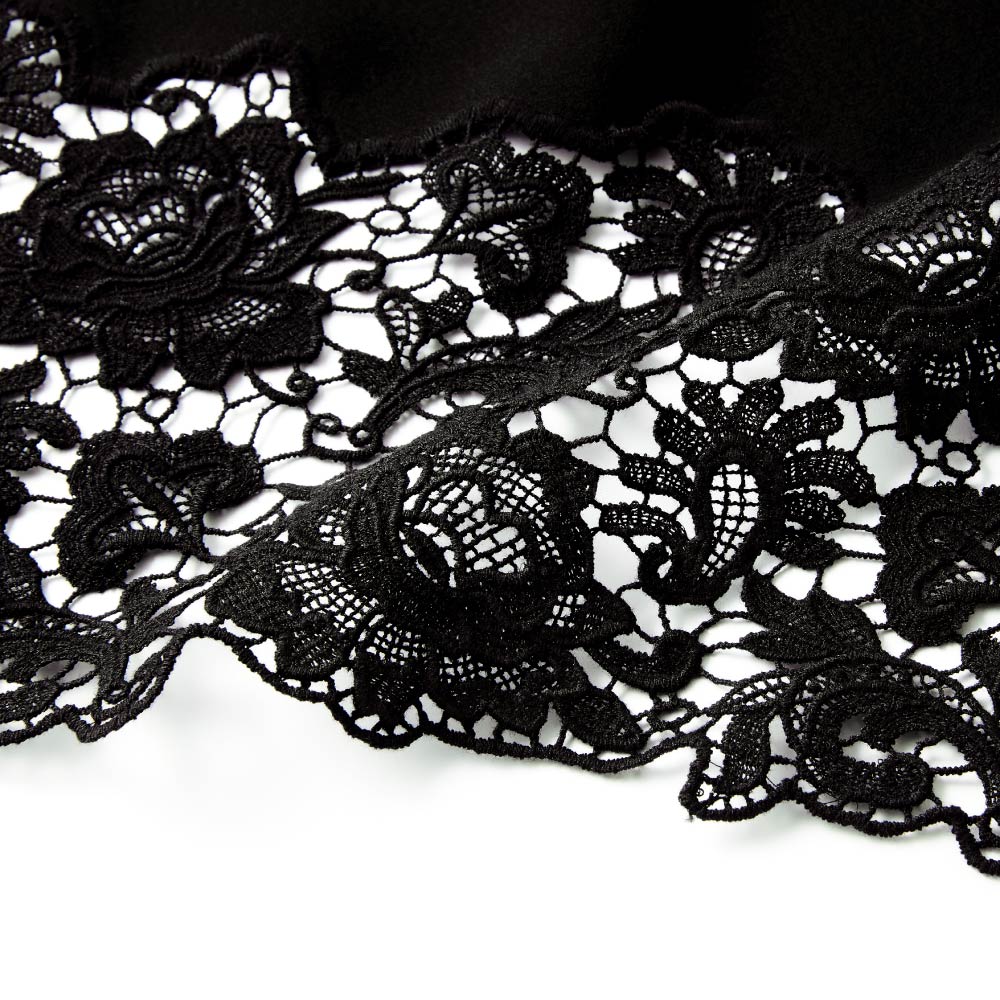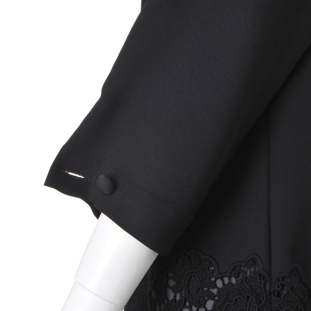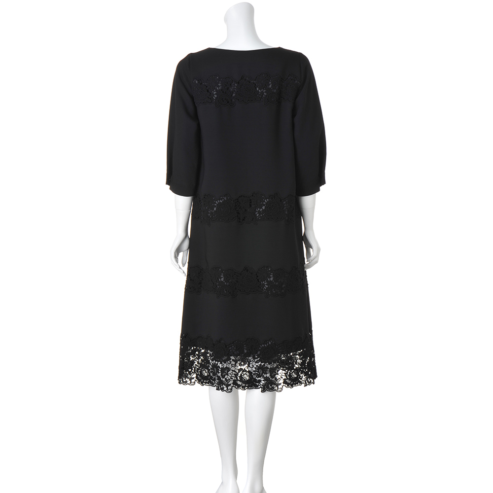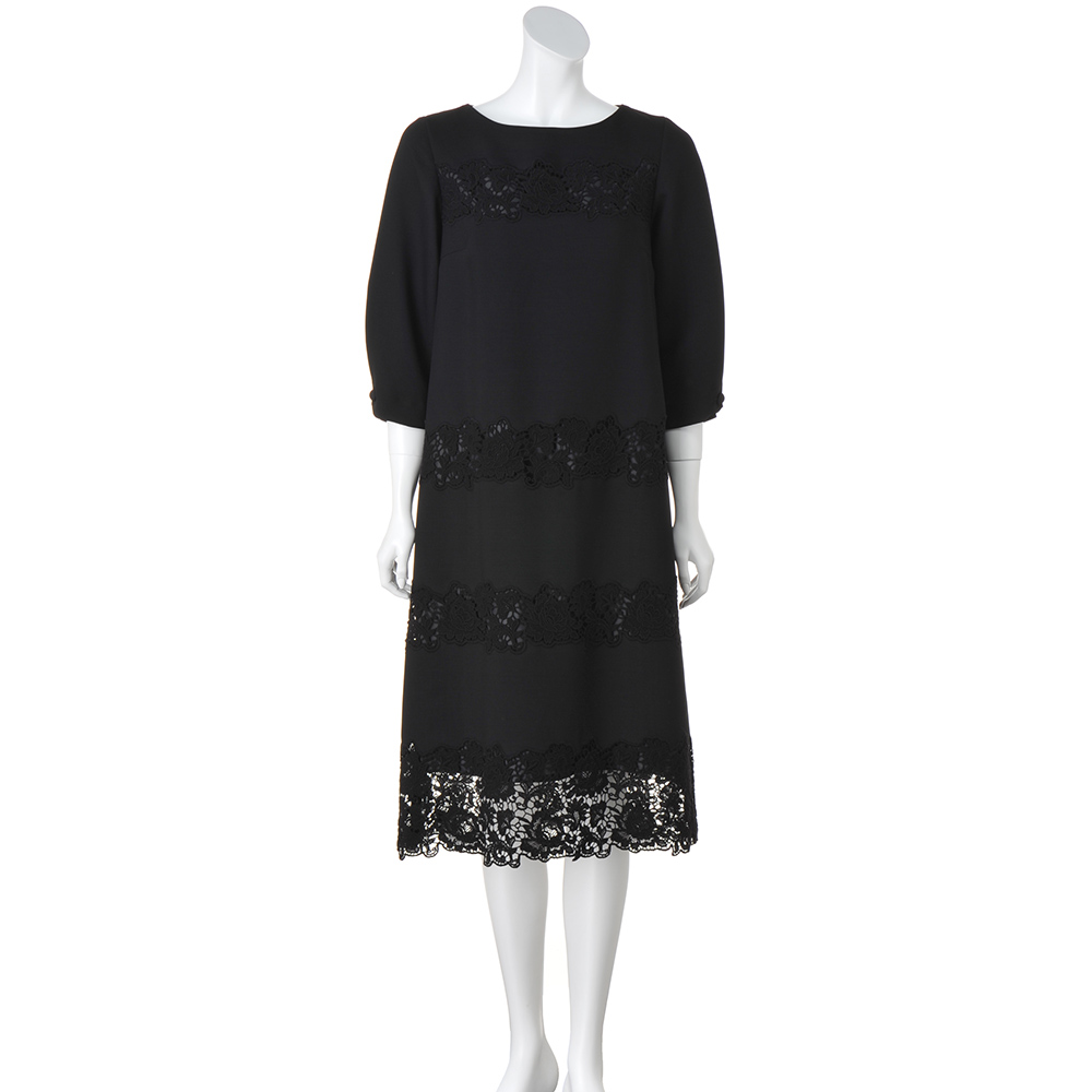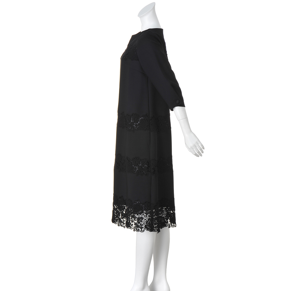 美しく装う喜びを誘う、麗しきレースワンピースどんな場でも自信をもって振舞える黒のワンピースは、マットな二重織りサテンに「敦賀繊維(株)」のバラモチーフのケミカルレースをボーダー状に刺しゅうして、生地部分はハンドカットした拘りのオリジナルテキスタイルを使用。素材に華がある分、顔周りはすっきりしたボートネックにし、デコルテとスカート部分にバランス良くレースを配しました。裾は、レース端のスカラップを贅沢に活かして優雅な色香が漂う佇まいに。袖は、手首がのぞく袖口にボタンをあしらったふんわりフォルムで上品シンプルに仕上げています。着やすさと上品なラグジュアリー感を両立させたデザインに、ぜひご注目ください。