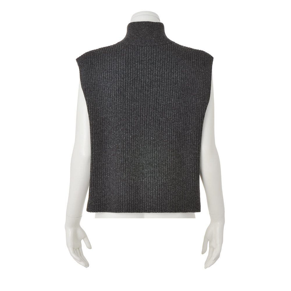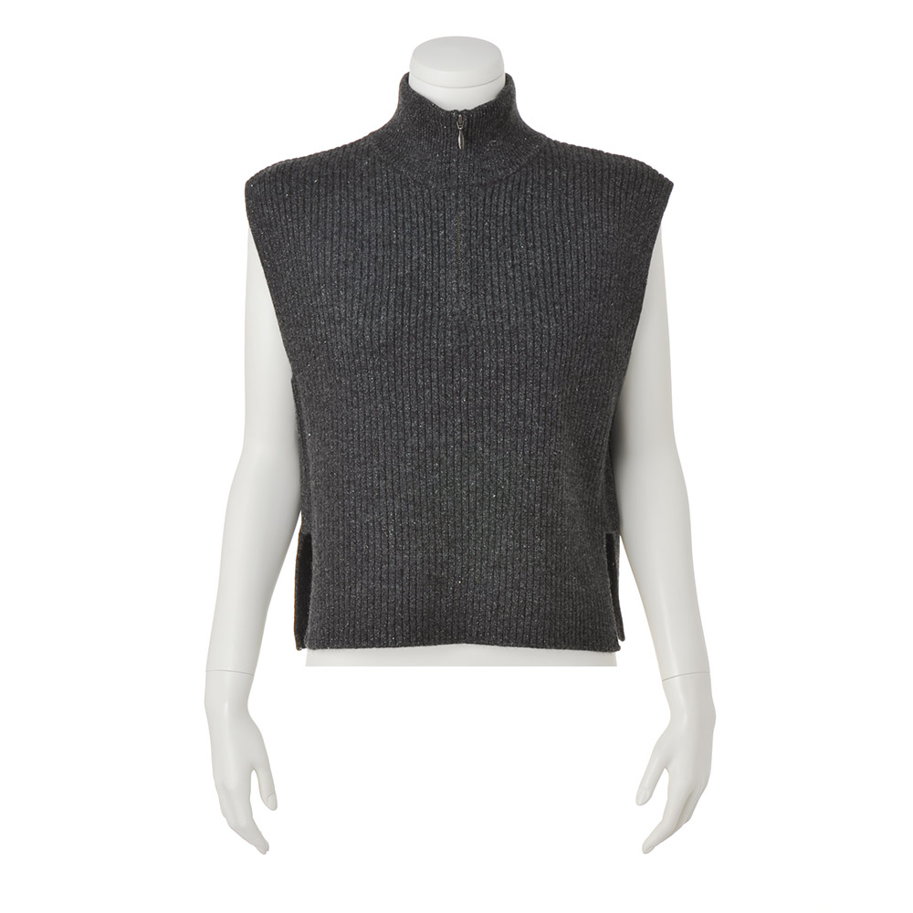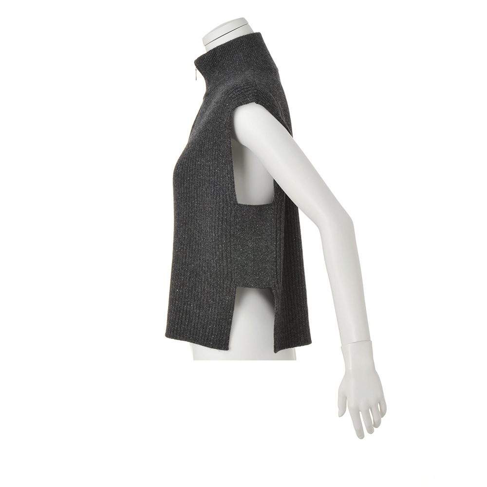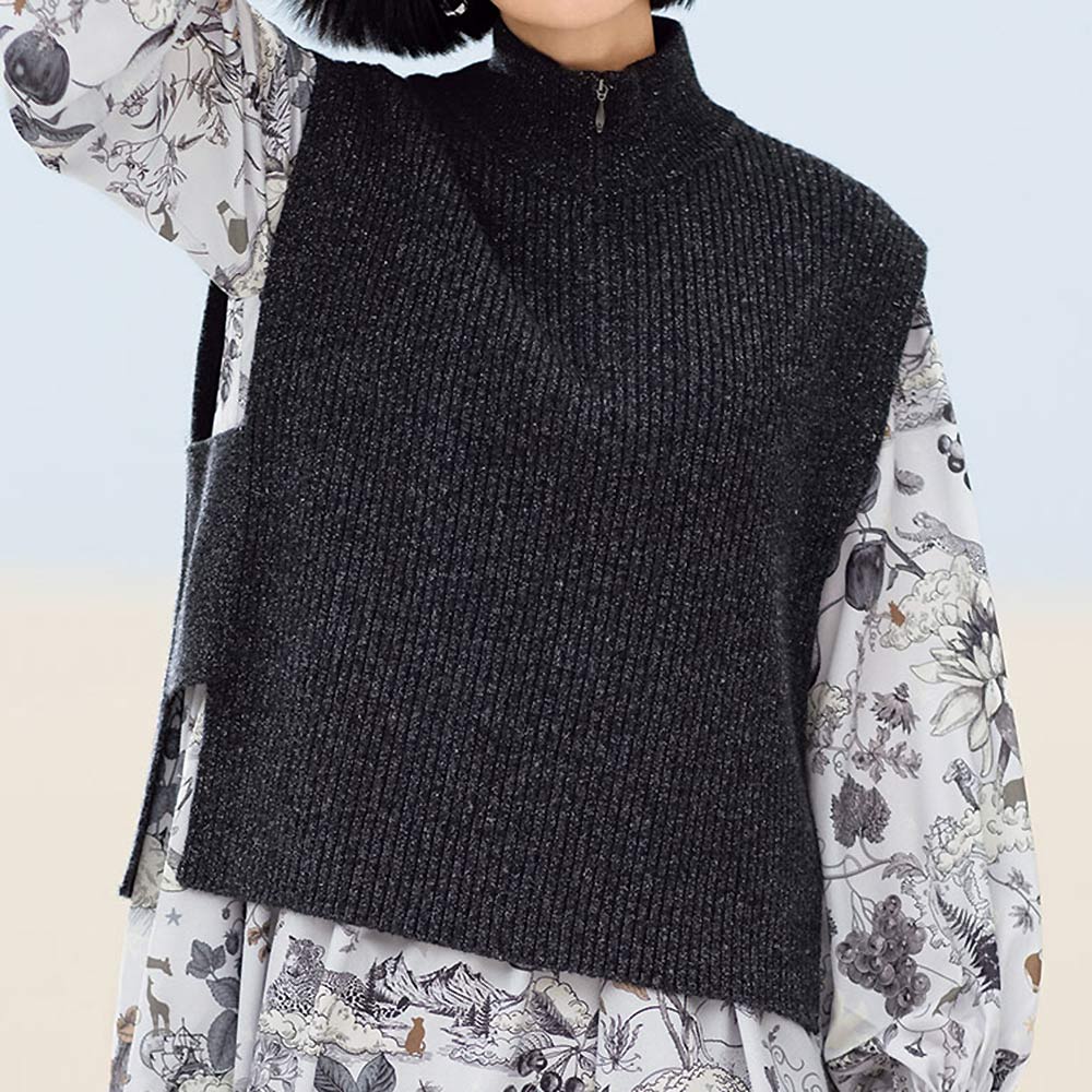 トレンド性と暖かさが共存するベストは、スタイルアップにいいショート丈でご用意。素材にシルバーラメが絡むウールカシミヤを使い、上品な光沢感の一着にしています。シンプルな作りですが、ジップ式のハイネックや脇マチのデザインが、モードライクな切れの良さを演出。アームホールがたっぷりあるため、インの袖型を選びません。POINT表情を作りやすいハーフジップ襟。程良い厚みなのでスリーシーズン活躍します。