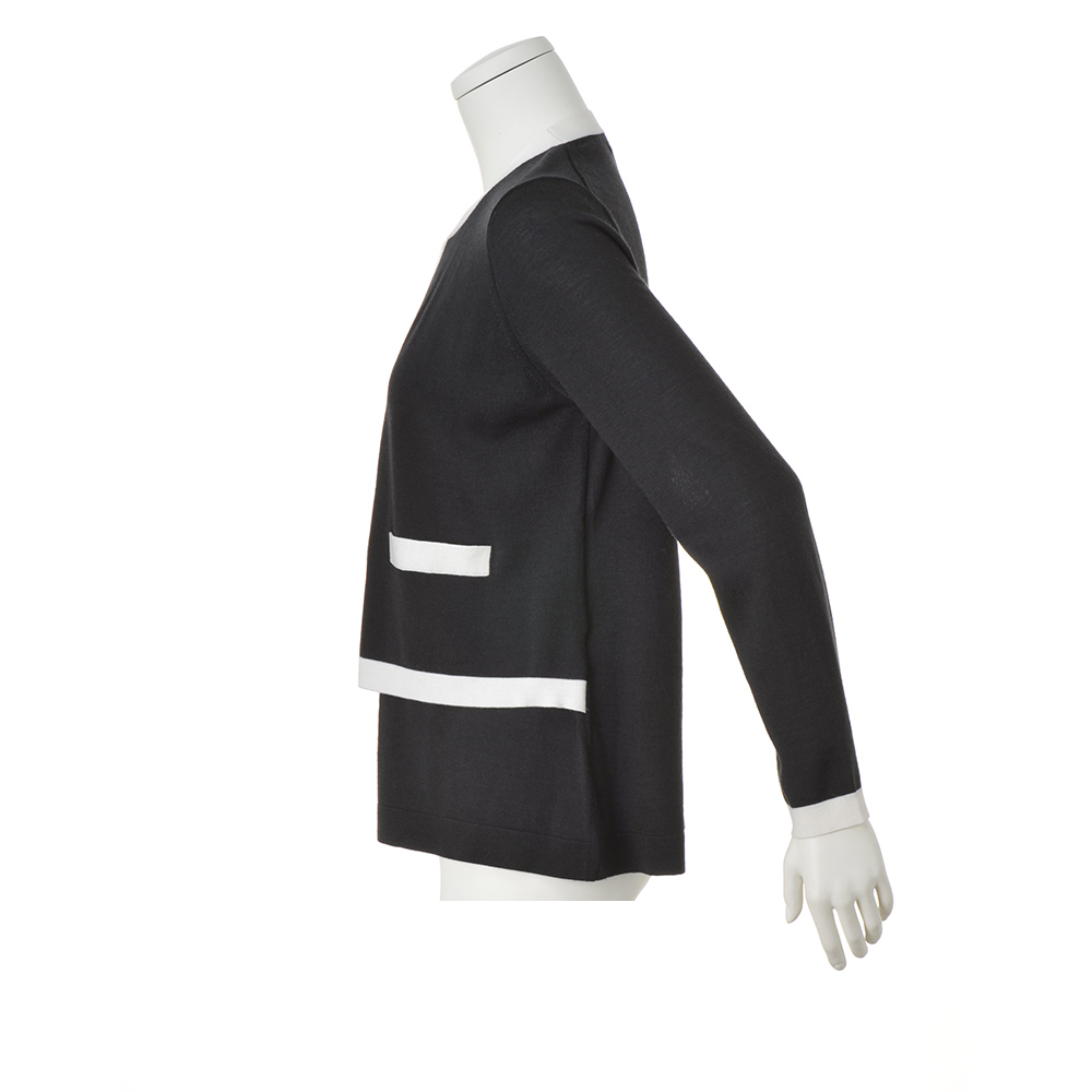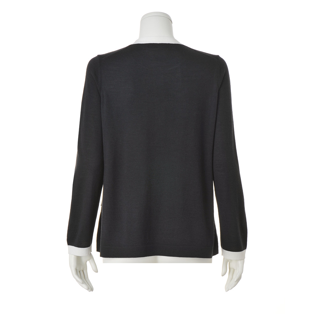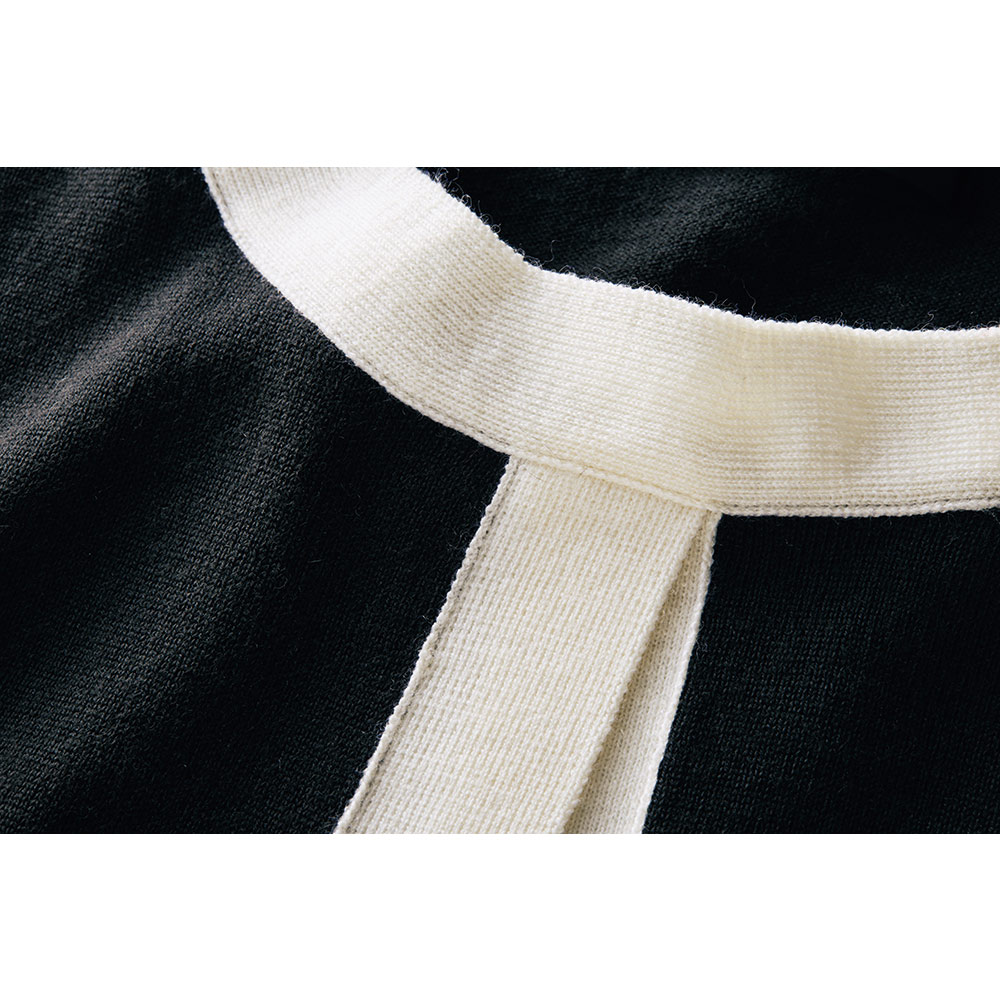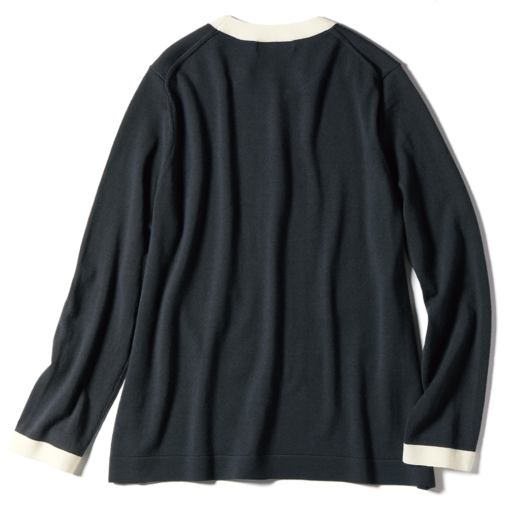 前身頃のみ編み地を重ねたフェイクレイヤードで、スタイルカバー力のあるやや長め丈。編み地は防縮加工が施された上質メリノウールのハイゲージ天竺。優しげなチャコールグレーにオフホワイトの配色使いで、爽やかな抜け感を演出しました。POINT前身頃は襟ぐりと脇線で接いだ二枚仕立て、後ろは一枚。フロントの配色ポケット口はフェイク仕様です。