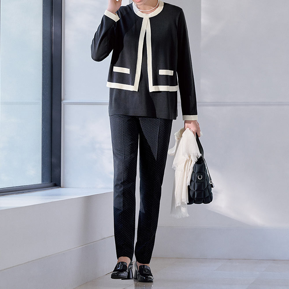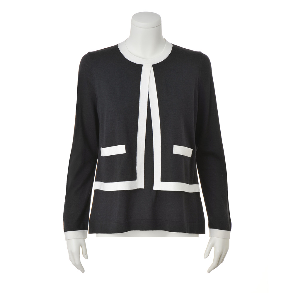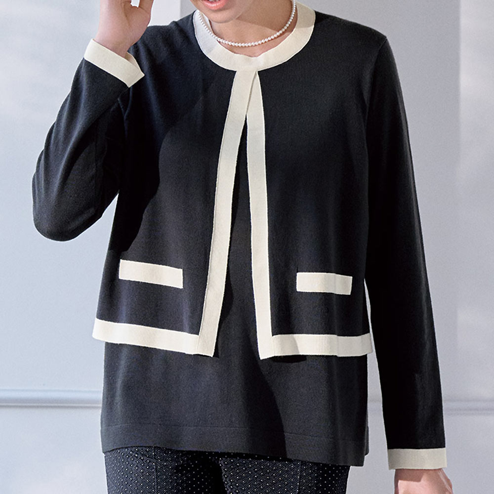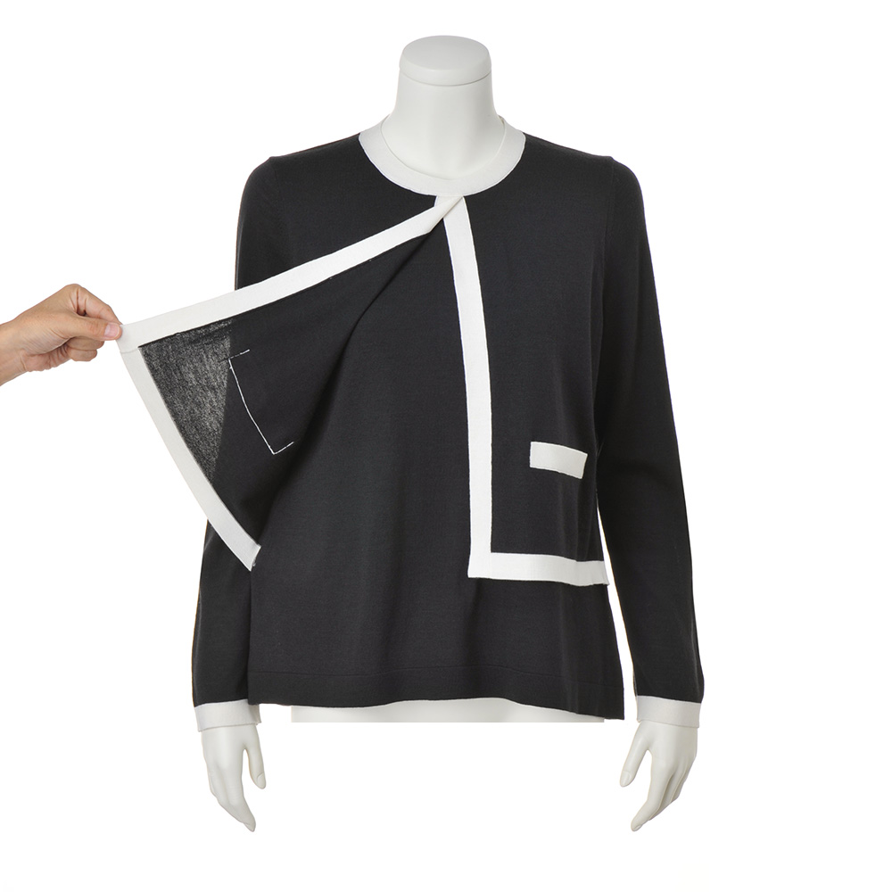 前身頃のみ編み地を重ねたフェイクレイヤードで、スタイルカバー力のあるやや長め丈。編み地は防縮加工が施された上質メリノウールのハイゲージ天竺。優しげなチャコールグレーにオフホワイトの配色使いで、爽やかな抜け感を演出しました。POINT前身頃は襟ぐりと脇線で接いだ二枚仕立て、後ろは一枚。フロントの配色ポケット口はフェイク仕様です。