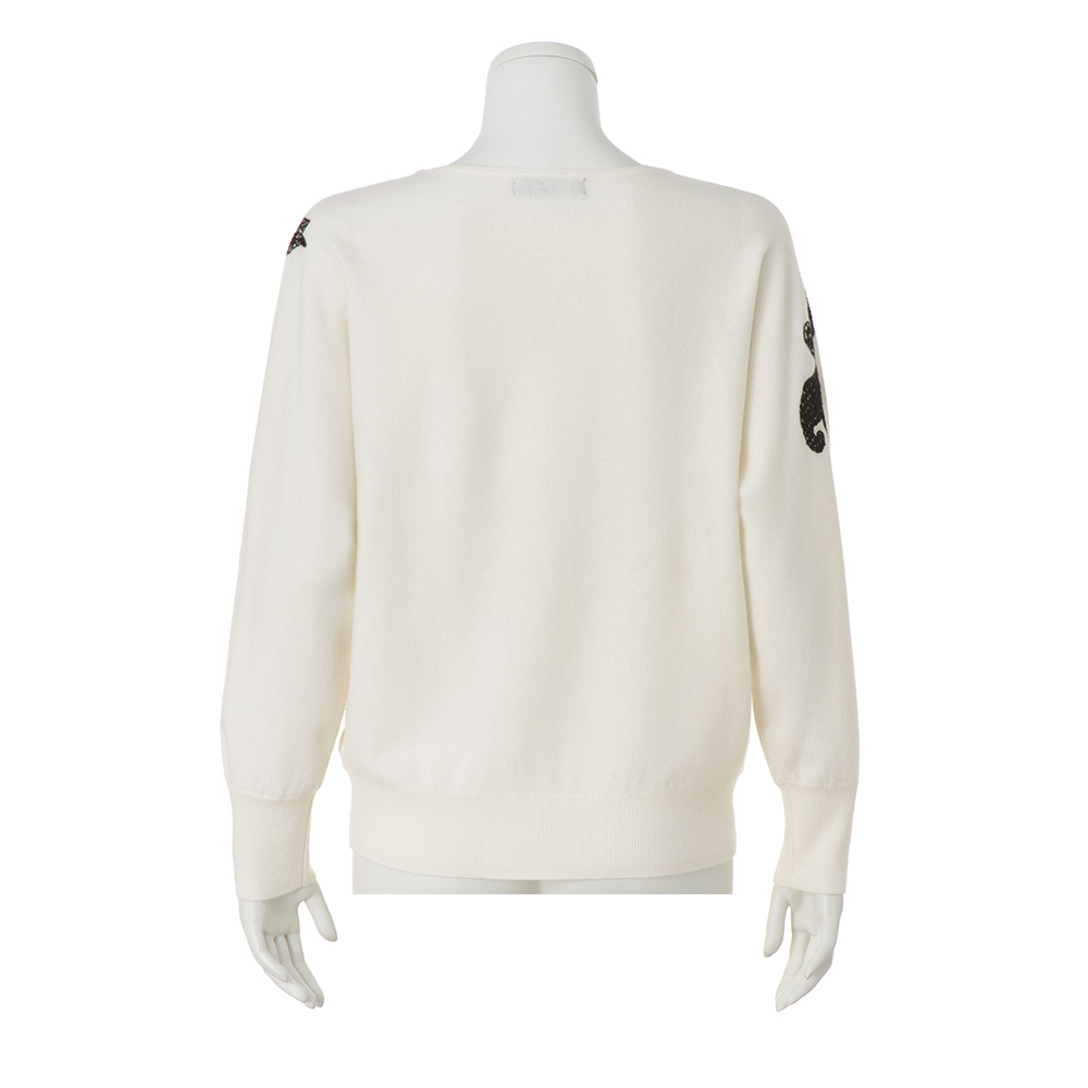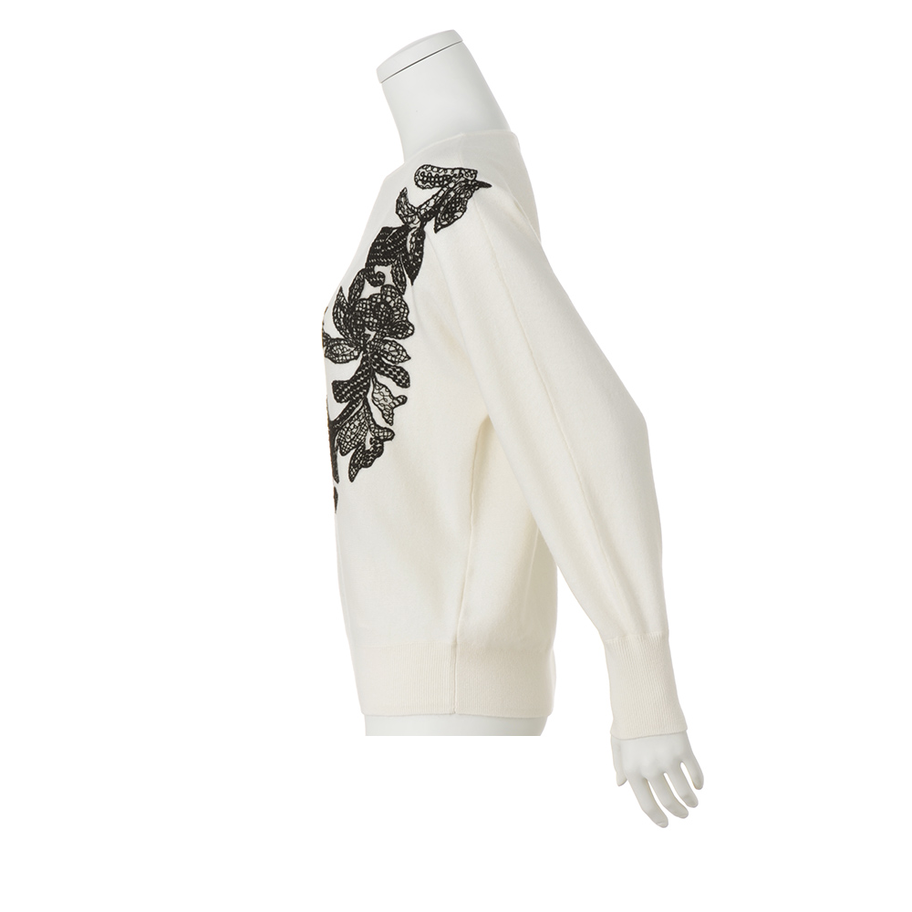 ホワイト&ブラックが奏でる緻密で暖かなコントラスト自然な膨らみ感と軽さ、暖かさのすべてを満たすニットは、繊細な原毛を厳選した撚糸を使用しているから。編み地はハイゲージの天竺横編みと華奢見えするように幅に拘ったリブ編みで、メリハリの効いたドルマンシルエットに仕上げています。DAMAコレクションらしい拘りは、クリスマスローズをモチーフにしたエンブロイダリーレースのあしらいにも。ふわりと立体感が出るウール混糸でさまざまなステッチを施したチュールレースを、身頃だけでなく左肩の後ろから右の二の腕裏まで、縦横無尽にあしらいました。どこから見ても艶やかな装飾が、着る人のエレガンスを代弁します。POINT華やぎとナチュラル感を表現するレース。計算されたアシンメトリーな配置にはスタイルアップ効果も。
