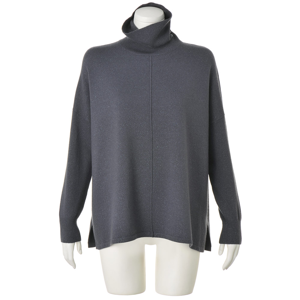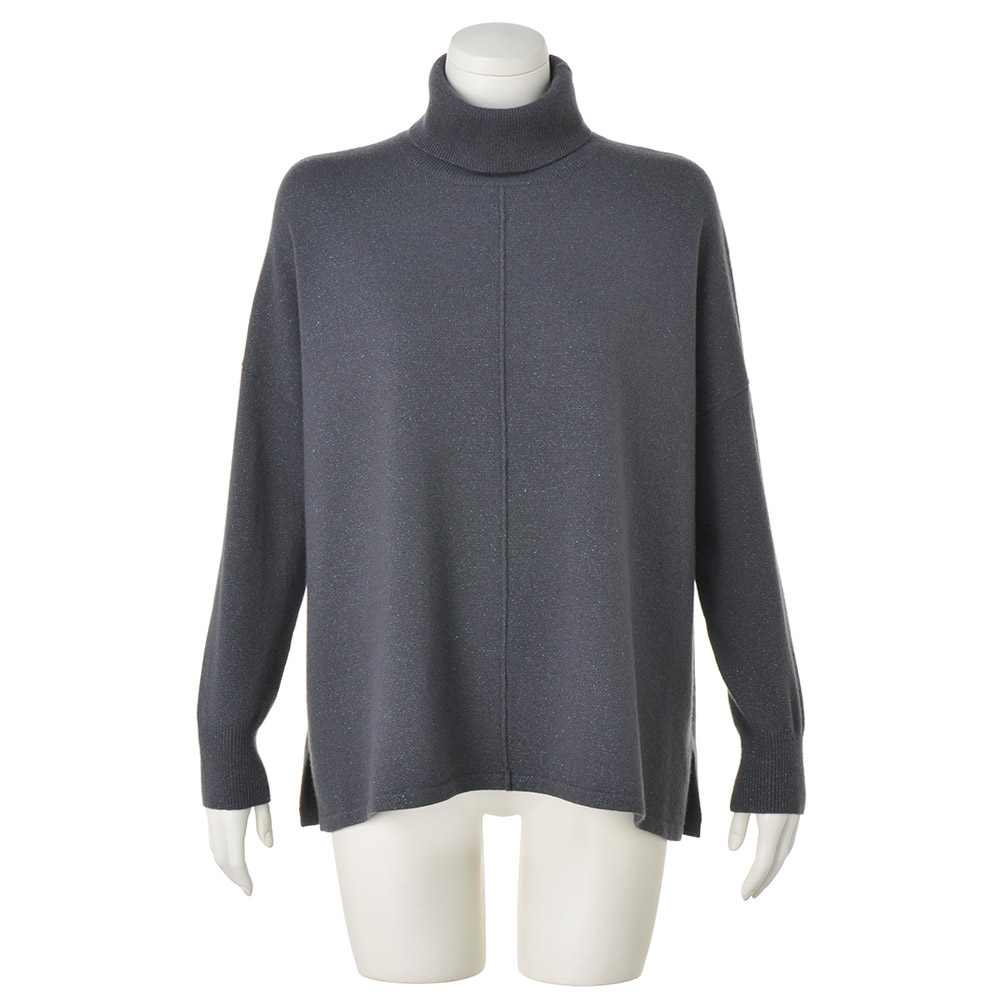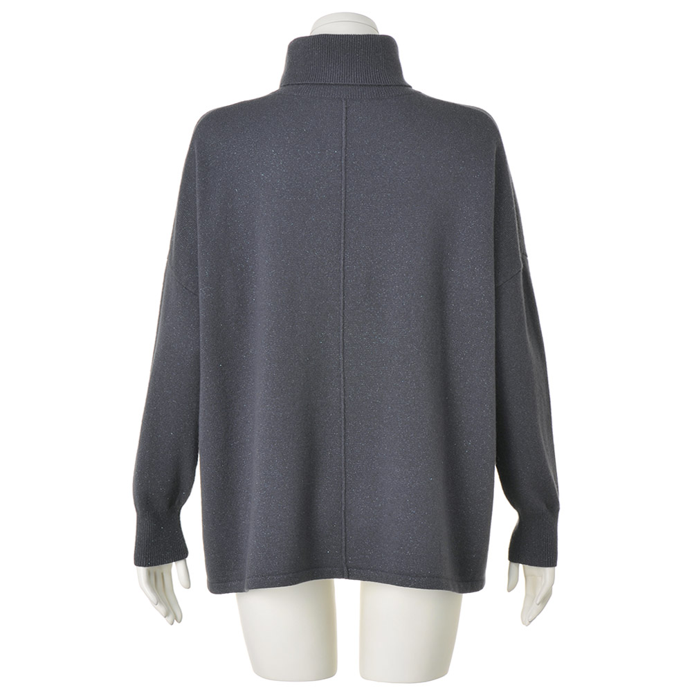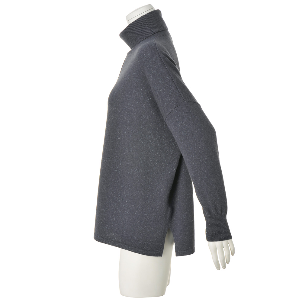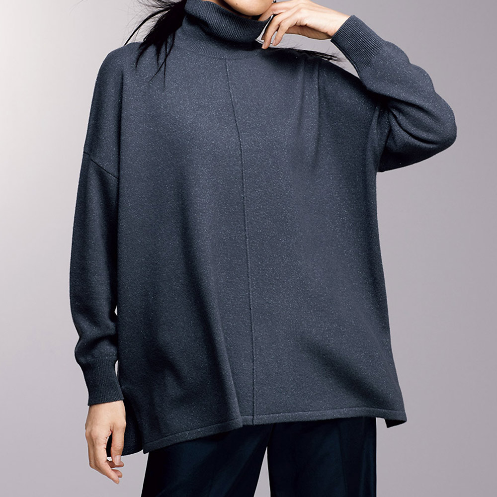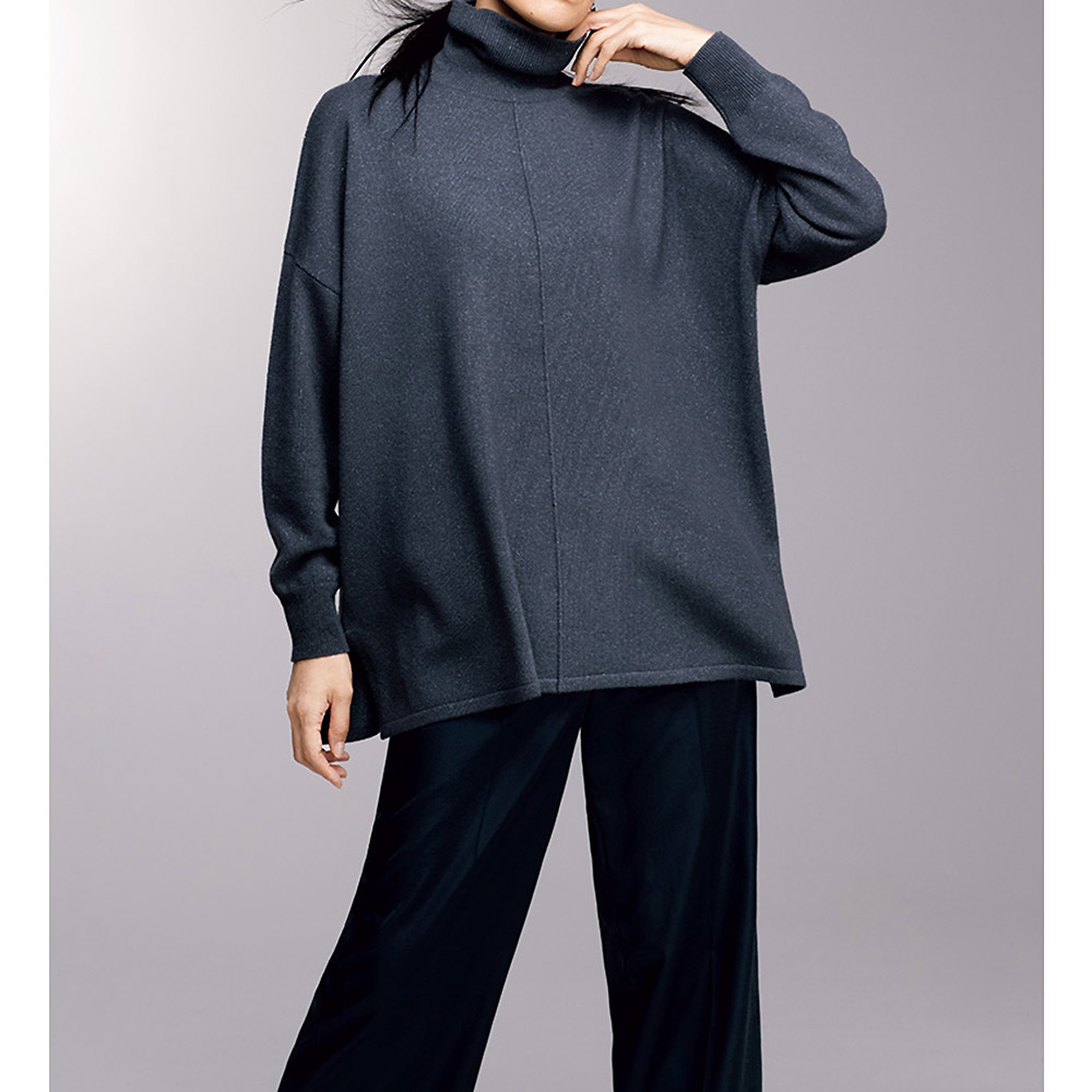 青の瞬きを閉じ込めたフルイドなニットチュニックハイゲージの天竺編みで、長方形に編み立てたスクエアフォルムのニットチュニックです。ポンチョのようなゆったりした着心地に洗練を与えるのは、カシミヤ混ウール糸に撚り合わせたシルバーとブルーのラメ糸。静かな輝きのニュアンスがデイリーエレガンスの奥行きを広げます。ゆったりしたタートルネック、身頃のセンターに入れたシームには、すらりと着映えする視覚効果も。また、ゆとりある身幅はヘムラインの動きに変化を生み、両サイドのスリットは軽やかな抜け感を演出します。ドロップショルダーから続く袖幅はあえて細くすることで華奢な印象になり、すっきりしたバランスで着こなせます。POINTモード感が漂うリラクシーなタートルネックと身幅。動く度にニュアンスが香るフォルムがすっきり見えの秘密。