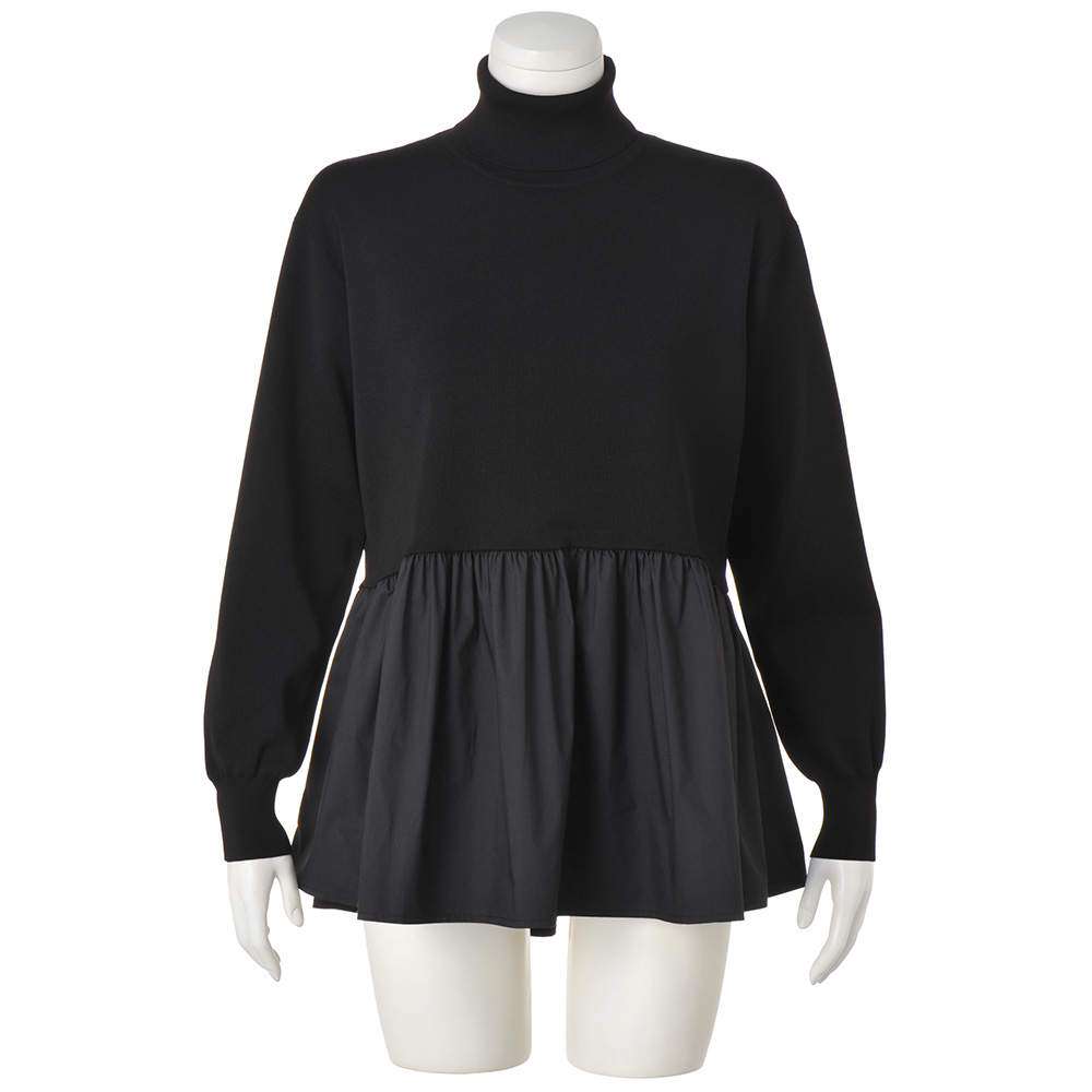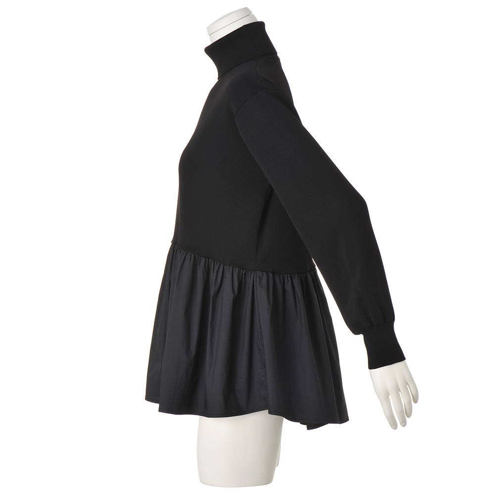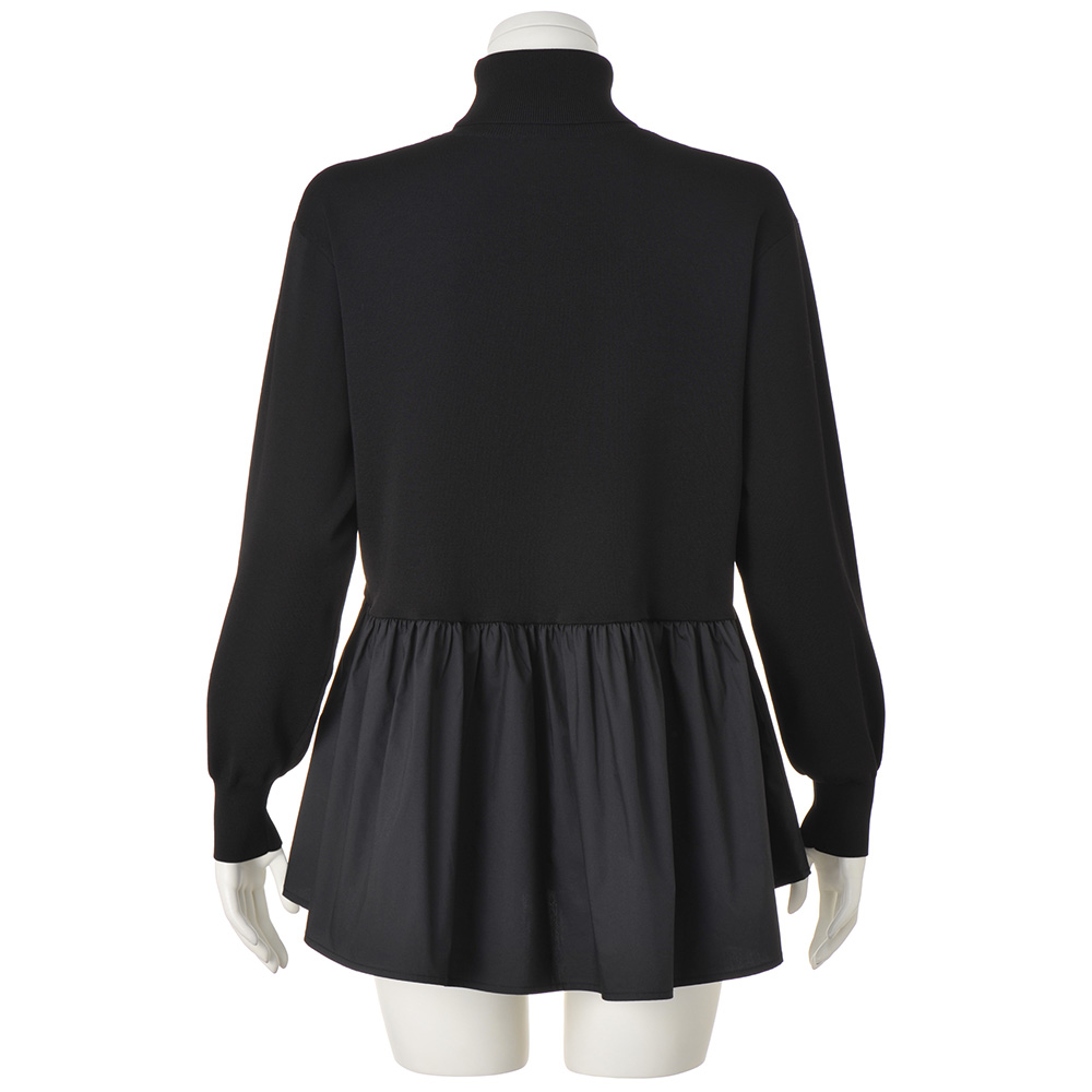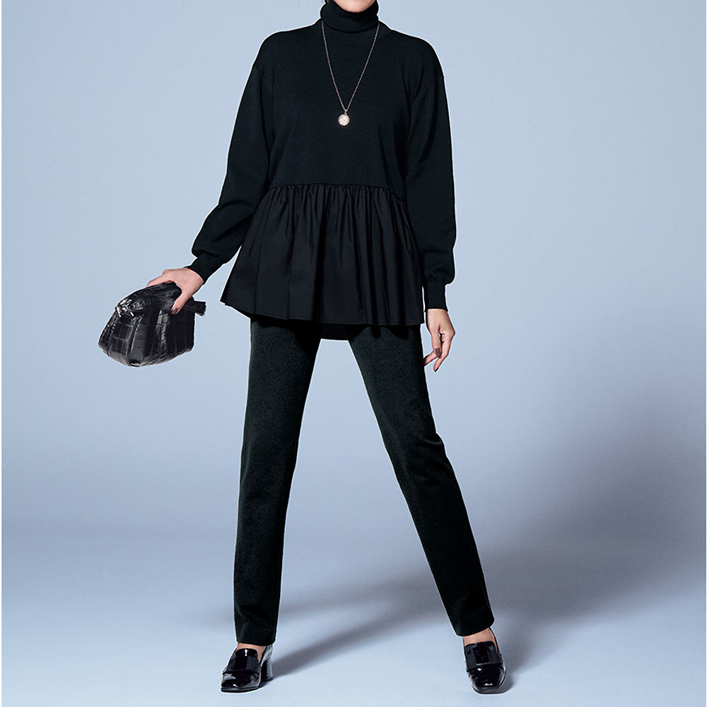フェミニンな魅力をふりまくトレンドのペプラムタートルニットのウエストから下に布帛をあしらった、トレンドのペプラムチュニックです。ハリのあるフォルムのために、ニットはウールの芯糸にポリエステルを巻きつけたカバーリング糸の総針編み、布帛はポリエステルコットンのタイプライターと、どちらもハイブリッドな素材を選びました。大人のバランスに拘って、ペプラムの切り替えの前中央を少し高くしたカーブラインで脚長効果を狙いつつ、後ろはやや低めのウエスト位置にストレートなラインをつなげて、落ち着いた印象に仕上げています。
