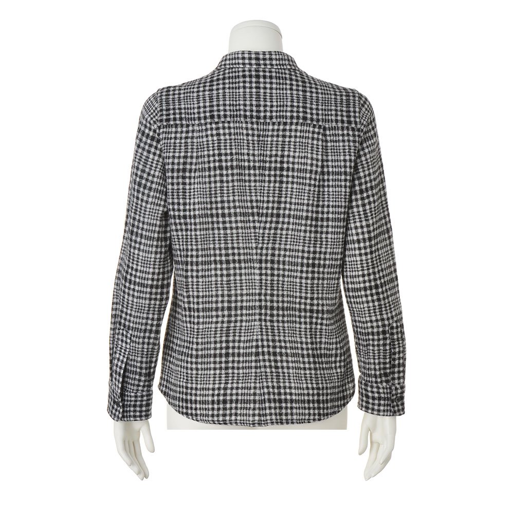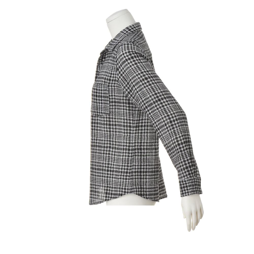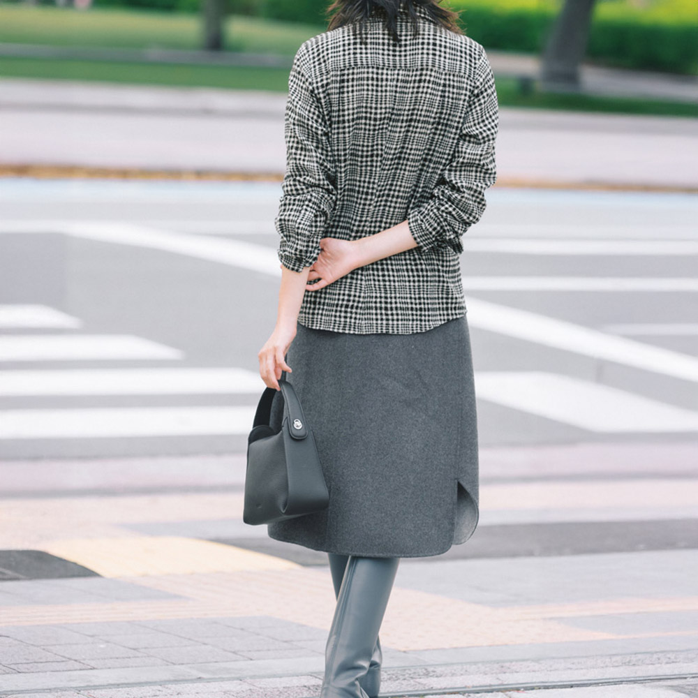 尾州産ウールガーゼならではの上質な風合いと心地よさに包まれて尾州産のウールガーゼを使用。ウール100%の梳毛を平織りにし、タンブラーウォッシャー加工をほどこしたふんわり甘めの織りで、柔らかく軽やかな風合いが魅力です。ウエストを適度に絞ったシルエットの美しさもポイント。一着でもタートル合わせでもエレガントに決まります。