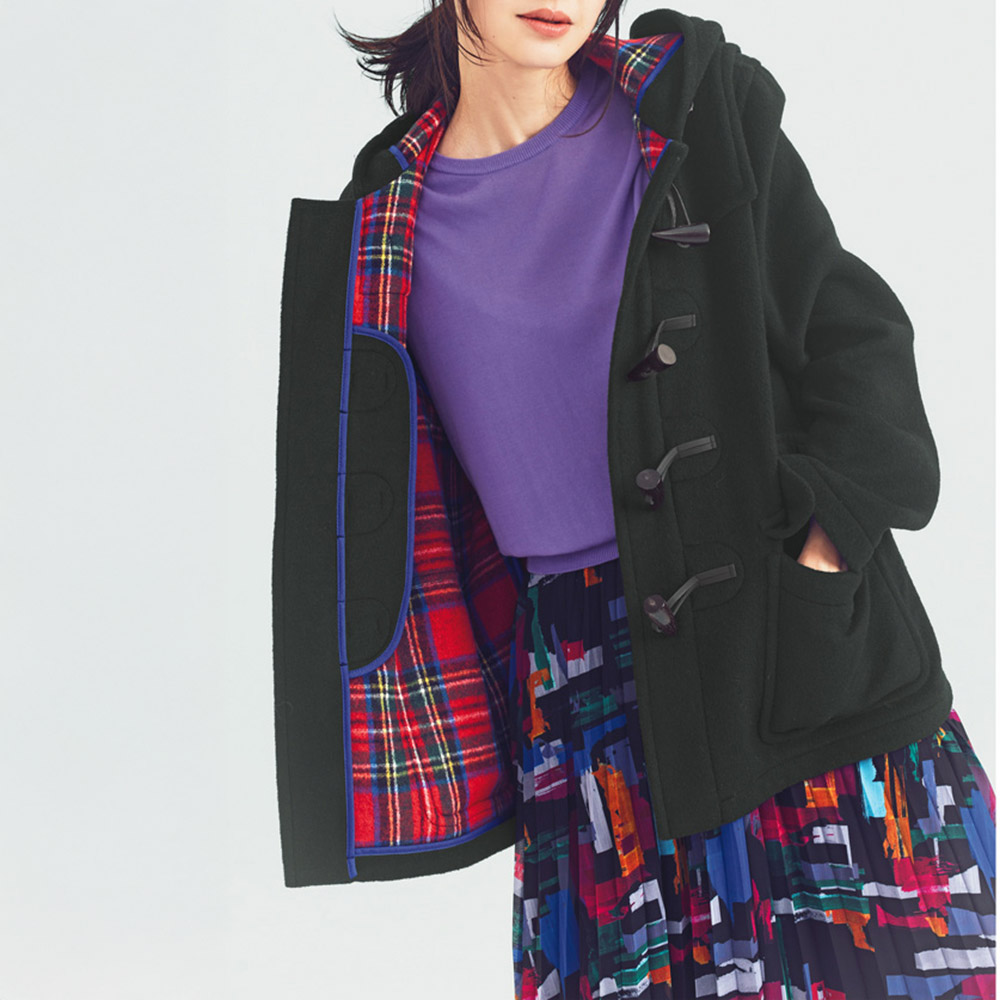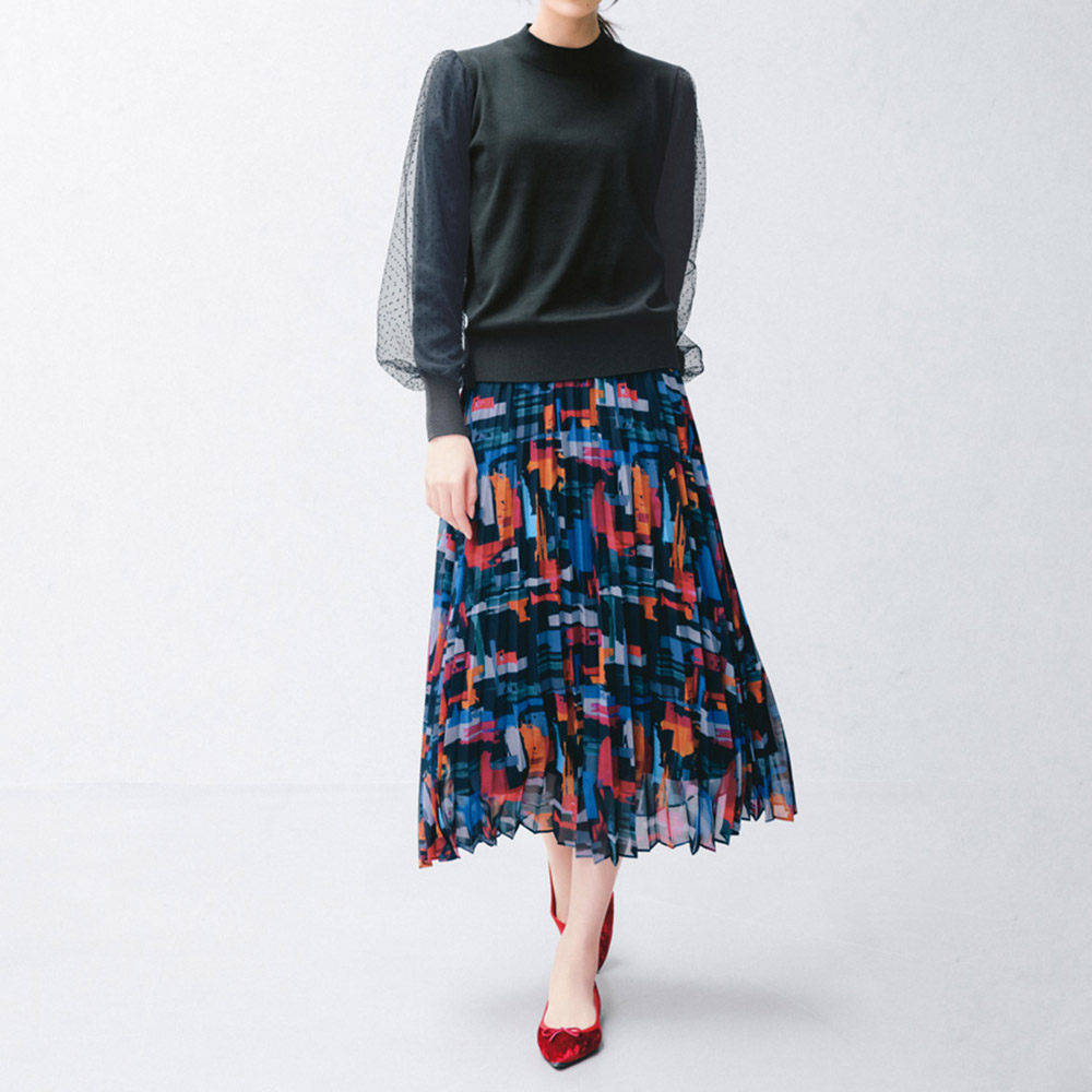 私らしく装う ロマンティックLADYオレンジ、ブルー、レッドなどを手描き風に組み合わせたプリントは、So close,オリジナル。ベースが黒なので合わせやすいのも魅力です。腰まわりは細めのプリーツで、裾に向かって徐々にプリーツ幅を広げることですっきりと見せる技ありのデザイン。