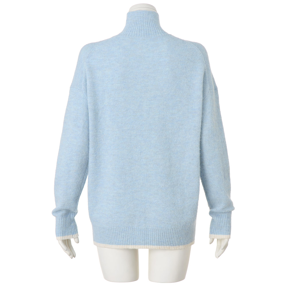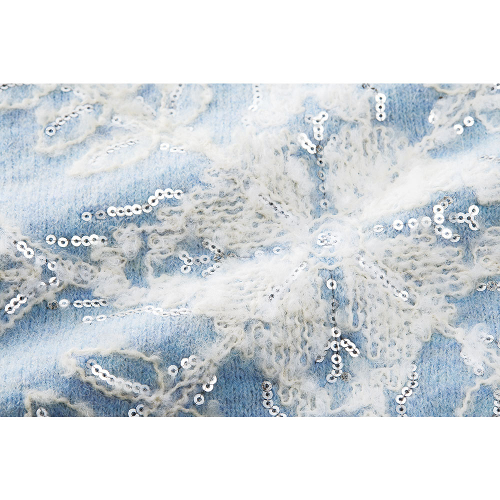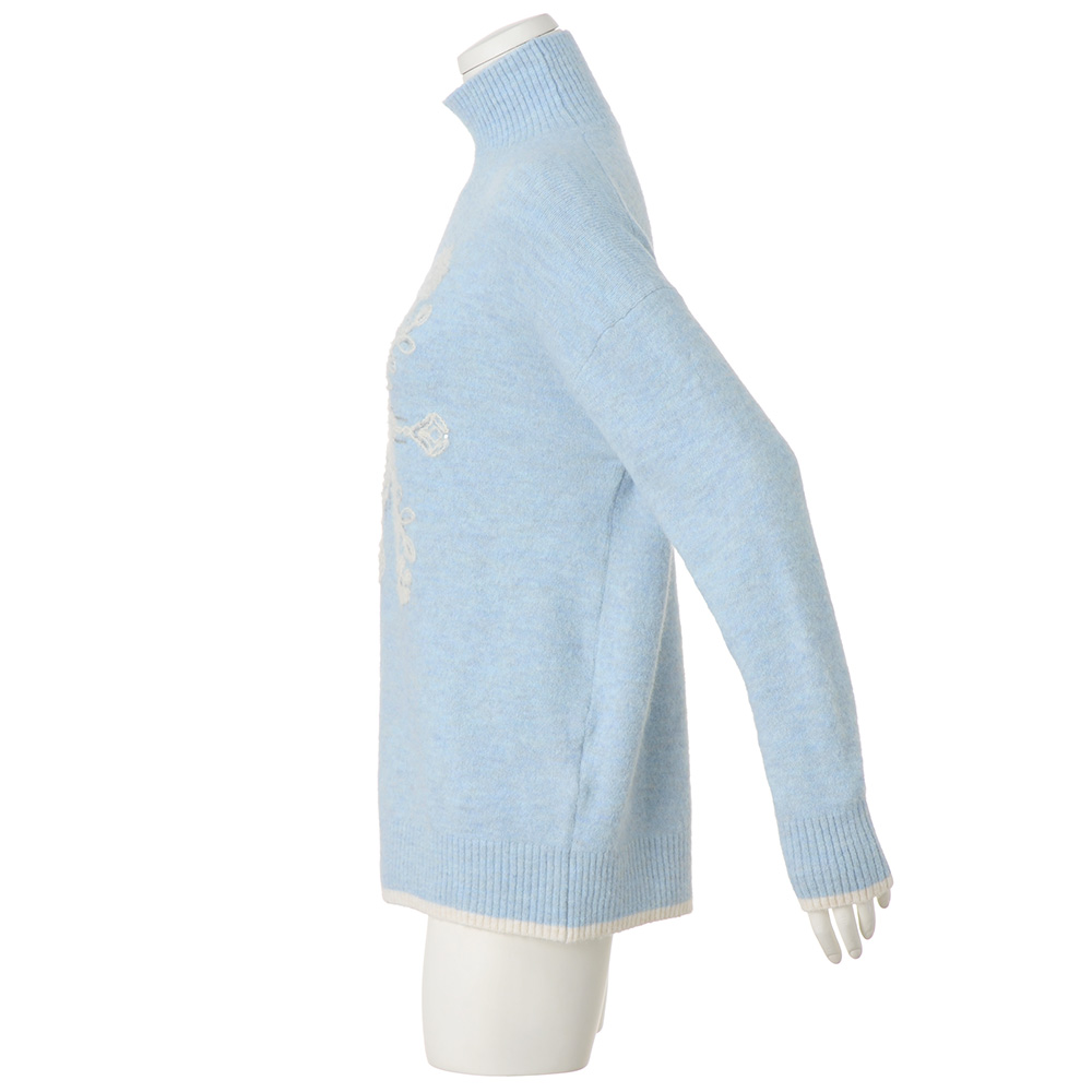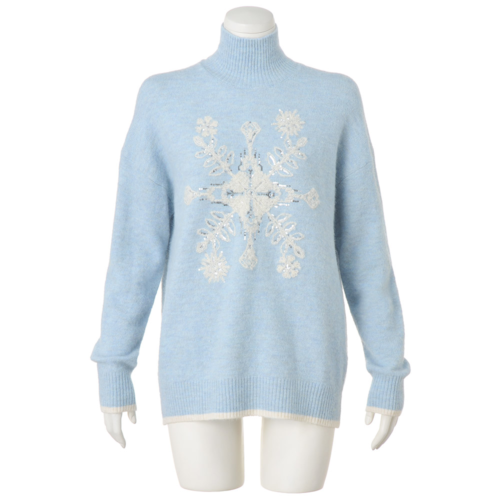 透明感溢れる雪の日のモチーフ前中心に雪の華やぎを刺しゅうしたみずみずしい一着がお目見えします。メランジをたたえたサックスの編み地は、スーパーファインアルパカを含む上質イタリア糸。空隙の多い繊維構造ゆえ、ふわっと軽くじんわりと暖かです。そこに、わた雪のようにふわふわしたウール100%の糸で純白のモチーフをオン。シルバーの極小スパンコールをちりばめて、繊細さを引立てています。デザインは腰周りを優しくカバーするチュニック丈にし、袖口と裾にクリーンな配色を効かせました。POINT枝葉を交えた可憐な結晶柄。緩めのハイネック、ドロップショルダーが今どき。