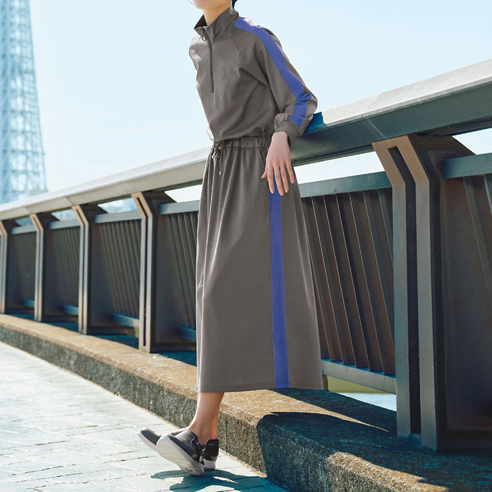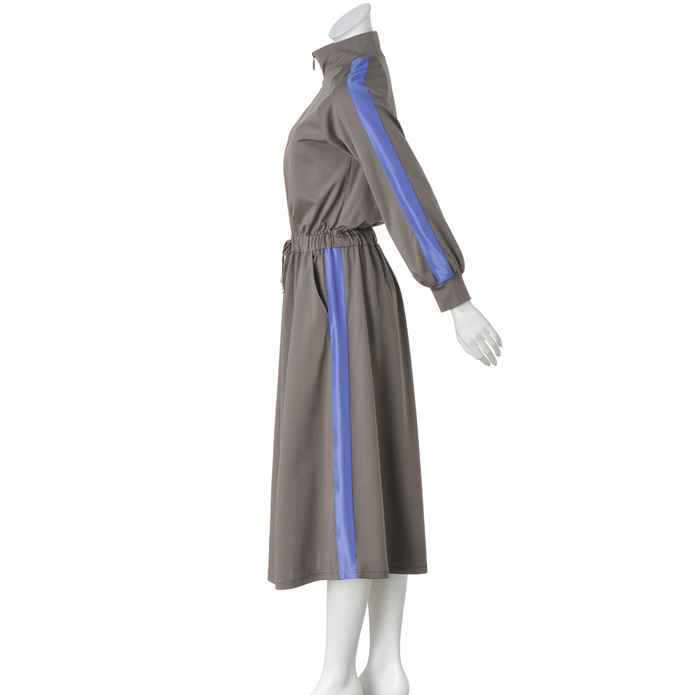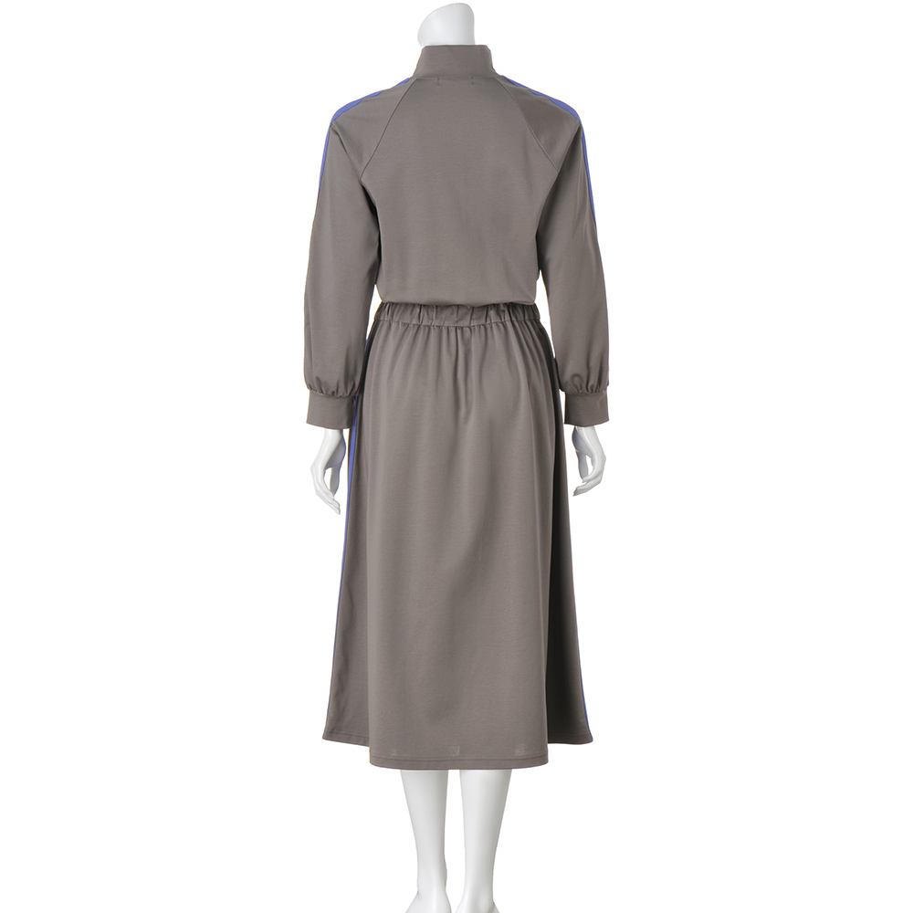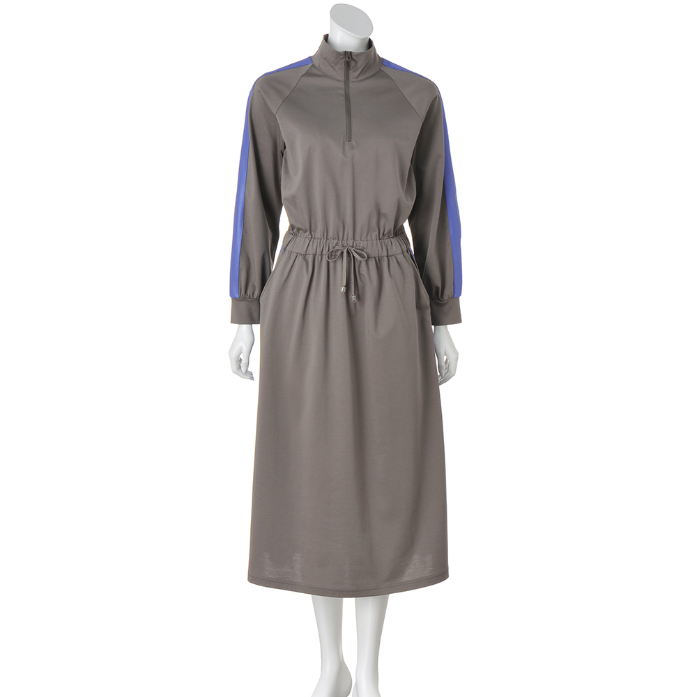ウエストマークでメリハリのあるボディラインを演出さらっと軽やかに着こなせる、コットンジャージーワンピース。肩〜袖山と、スカート部分両脇にあしらった配色ニットテープ&ハーフジップデザインがスポーティムードを盛り上げます。素材はコットンをハイゲージに編み上げたポンチジャージー。特殊加工で生まれたほのかなツヤとハリ感が、大人の品格を引き上げます。シルエットはウエストをマークしたフィット&フレア。スポーティながら女性らしさも薫る一枚です。