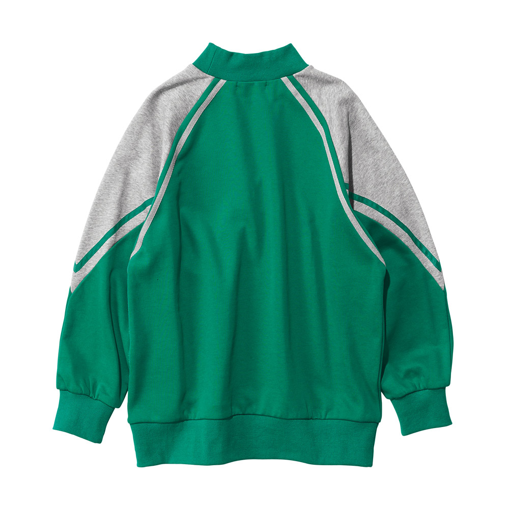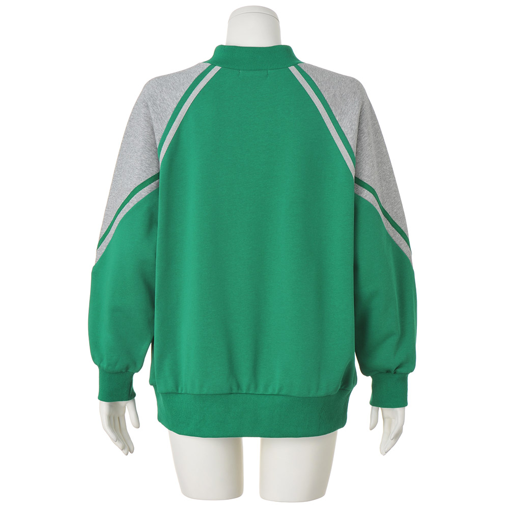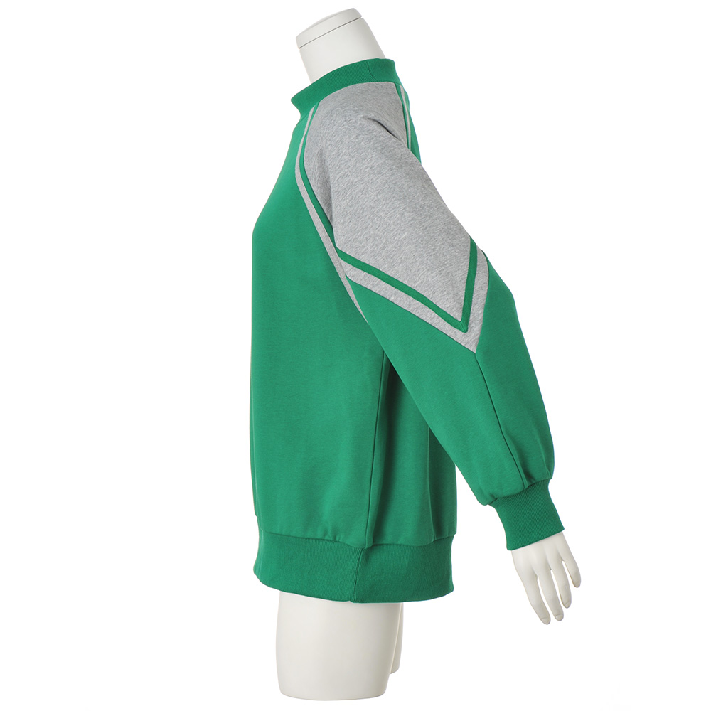 鮮やかなグリーンが目を惹く主役トップス冴えたグリーン×グレーの配色、テープ使いのライン、ラグランスリーブなど、スポーティ要素満載のスウェットプルオーバー。重ね着せずとも決まる絶妙な高さのハイネックや程よいゆとりのゆるシルエットが、出番の多さを予感させます。裾のリブはテンションを緩めに仕上げてあるので、きゅっとすぼまりすぎず、着るだけでリラックス感のある雰囲気に。