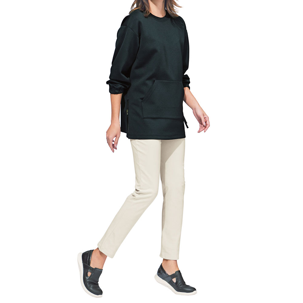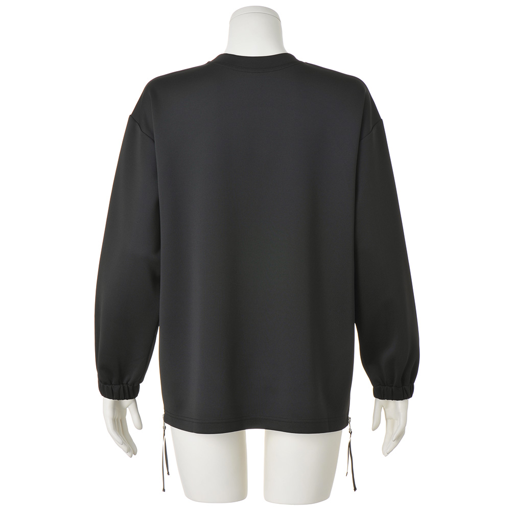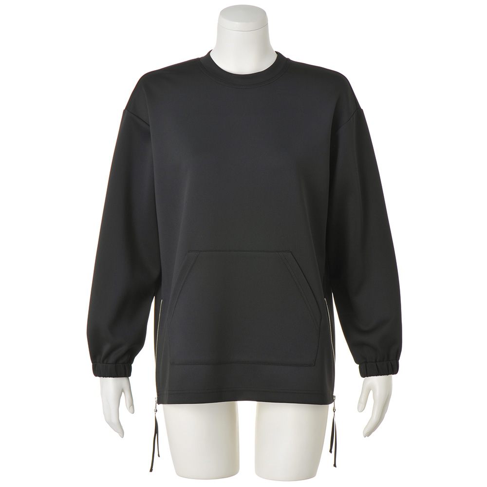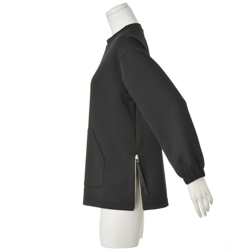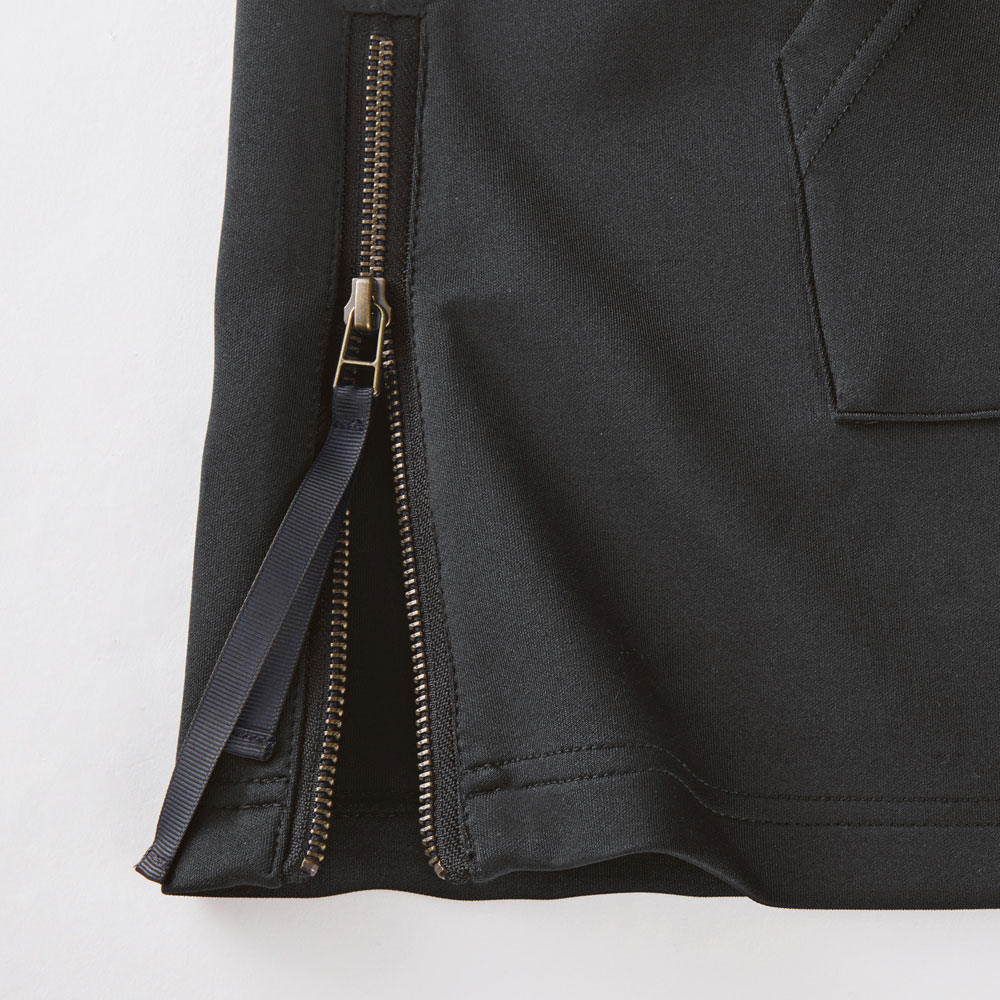 ファスナー開閉で変わる形を楽しんでふんわりとした膨らみとストレッチ性を備えたダンボールジャージーを使用。カンガルーポケットが付いたスポーティなデザインながら、生地のきれいな表面感とぷるんとしたタッチが、洗練されたモードな雰囲気を漂わせます。裾の両脇にはファスナーをあしらったスリットを配してデザインポイントに。ボクシーからAラインまで、ファスナーの開閉でシルエット変化を楽しめます。