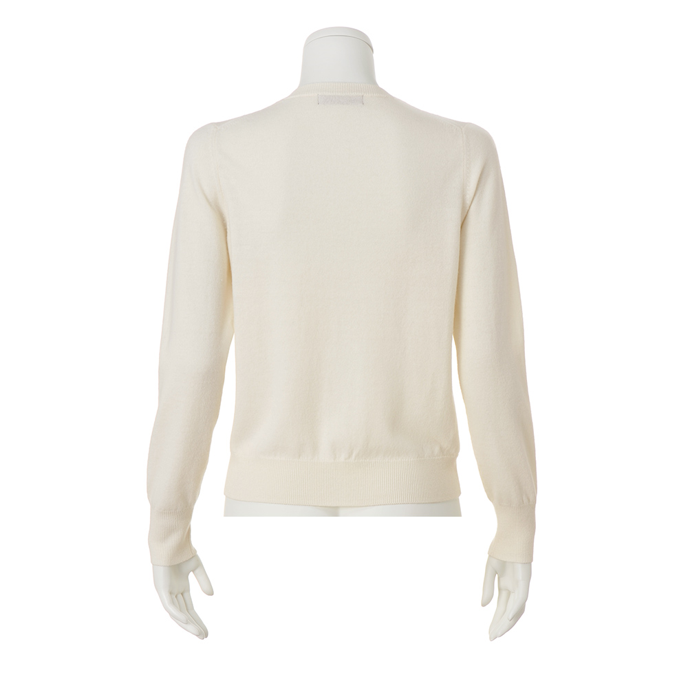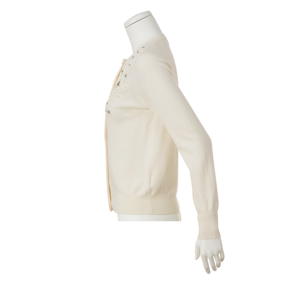 座り姿は上半身が勝負!ロマンティックな白胸元にビーズ刺しゅうをふんだんにあしらった、特別感のあるカーディガン。刺しゅうはニットと同じ糸を使っているのでふっくら立体的、さらにパールホワイト、シルバー、クリアのビーズやスパンコールを刺して、ロマンティックな雪の結晶柄を表現しました。編み地は上質ウールのなめらかなセミ梳毛と暖かな紡毛をブレンドした、バルキーで軽い着心地のハイゲージ天竺。着回しの利くベーシックな形だから、インナーを合わせて軽く羽織っても、プルオーバー感覚で一枚で着こなしても。POINT刺しゅうにはニットと同じ糸を使っているのでふっくら立体的。ボタンは本体と同色のマットなタイプを使用し、胸元の刺しゅうを際立たせました。
