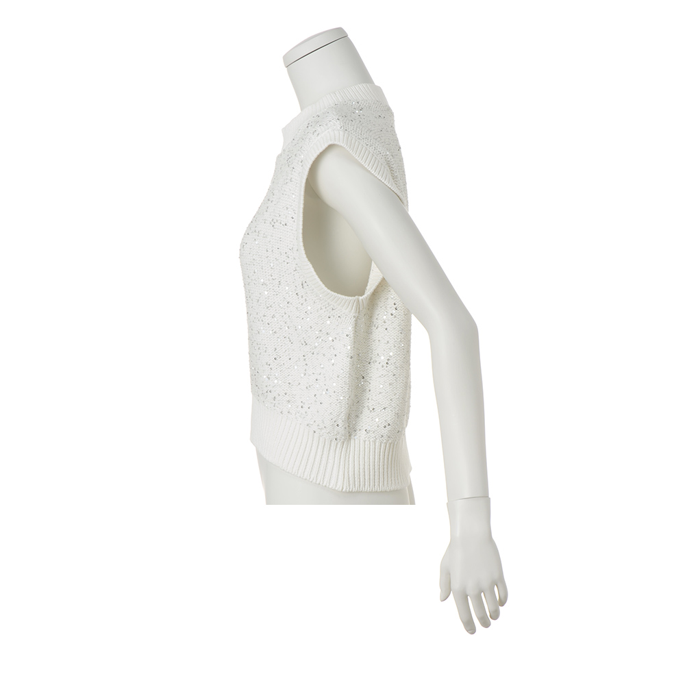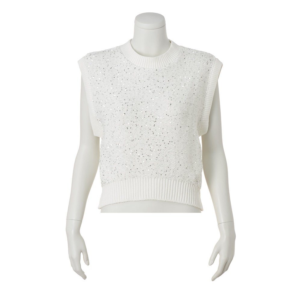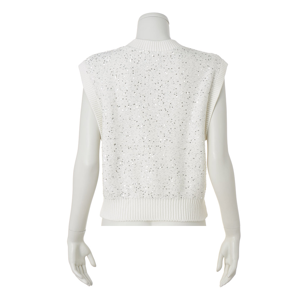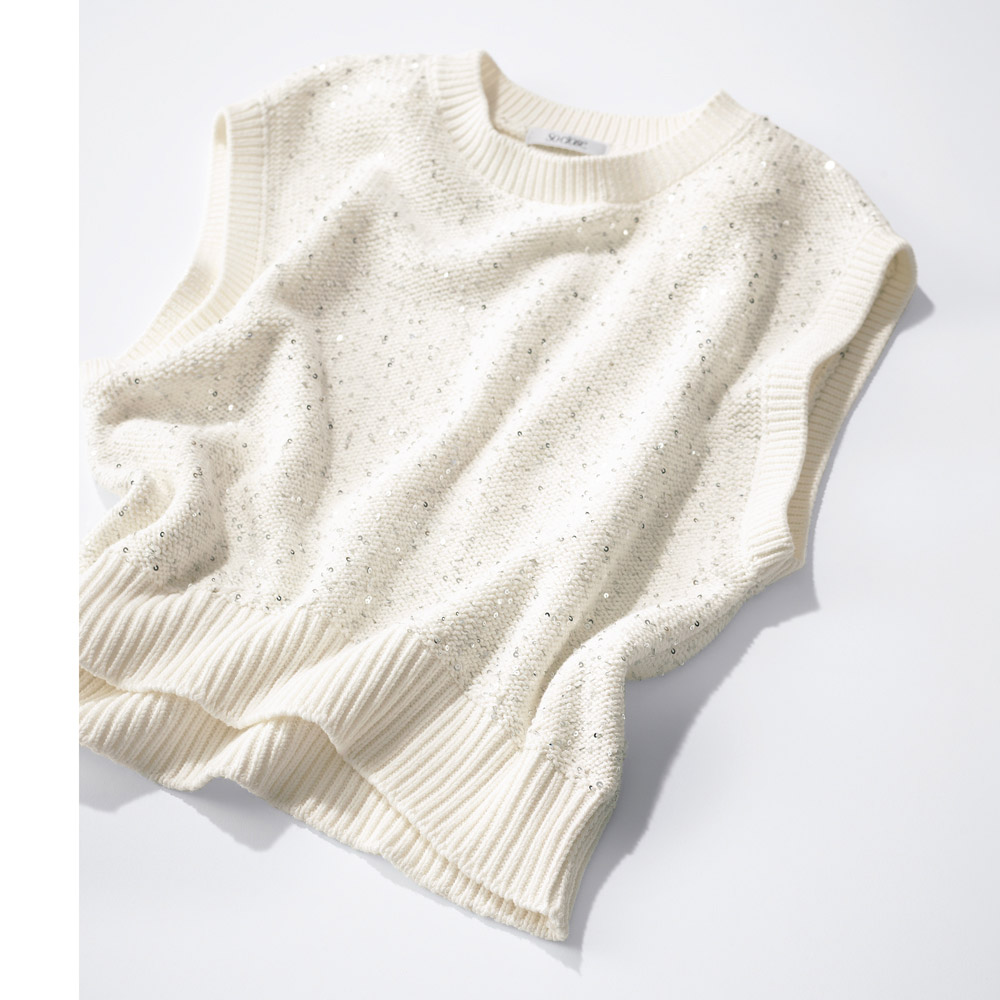 動くたびに光をきらりと反射しどんなスタイリングにも映える動くたび煌めくスパンコールの輝きが存在感を放つニットベスト。重ね着も楽しめるようアームホールは大きめにとっているので、一枚でノースリーブトップスとして、Tシャツやブラウスに合わせたりと、ロングシーズン楽しめます。