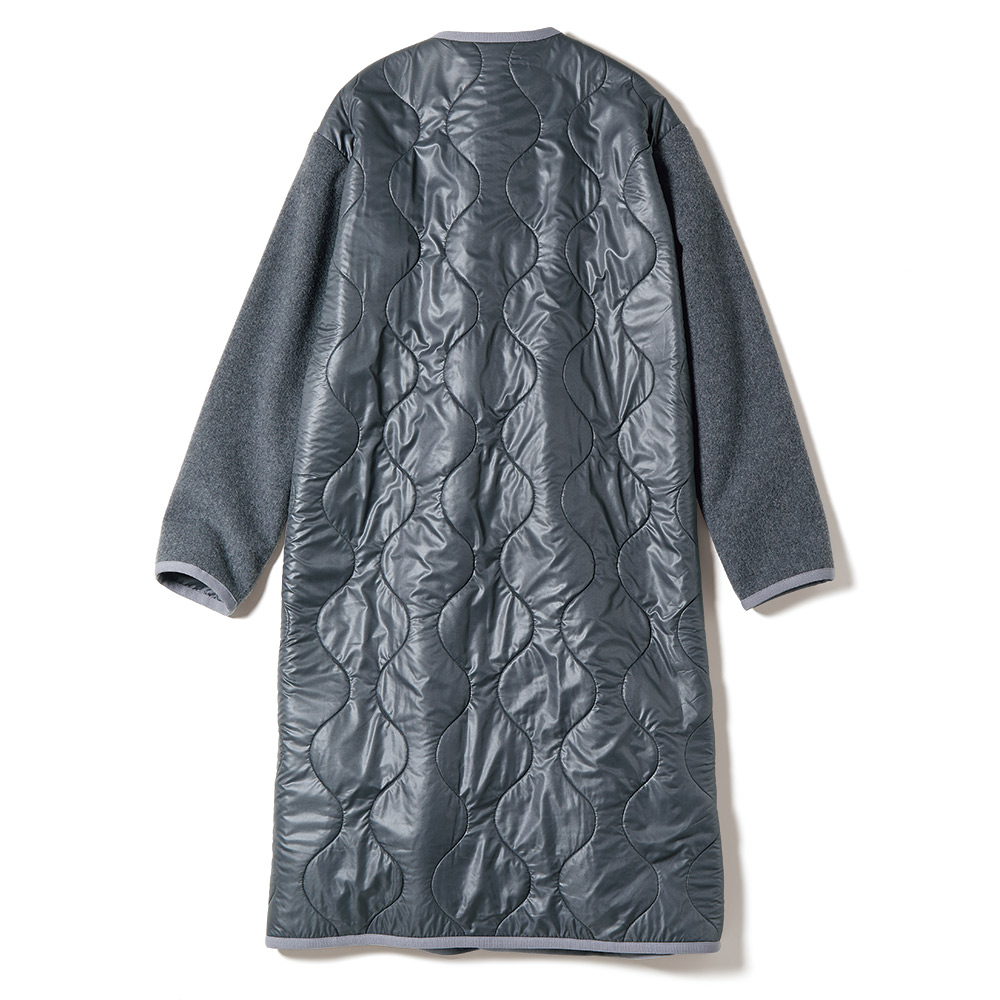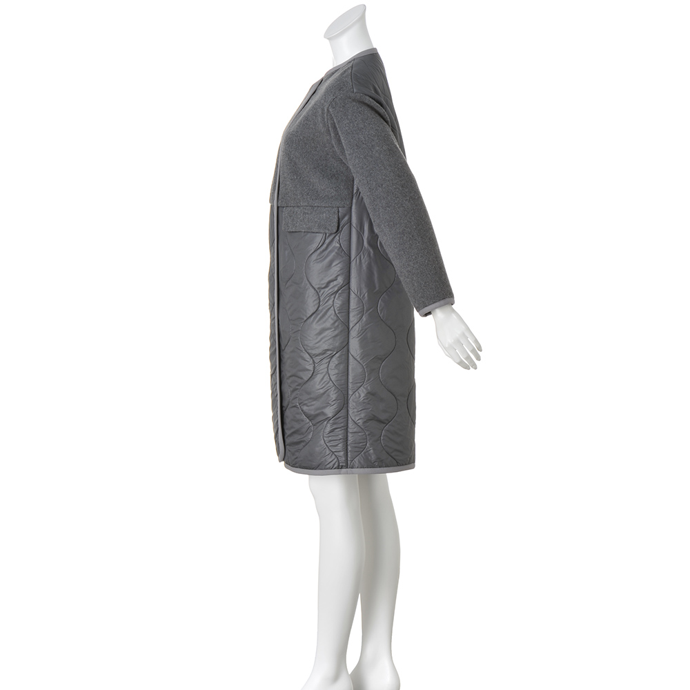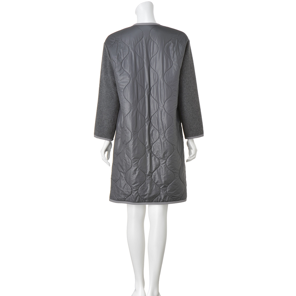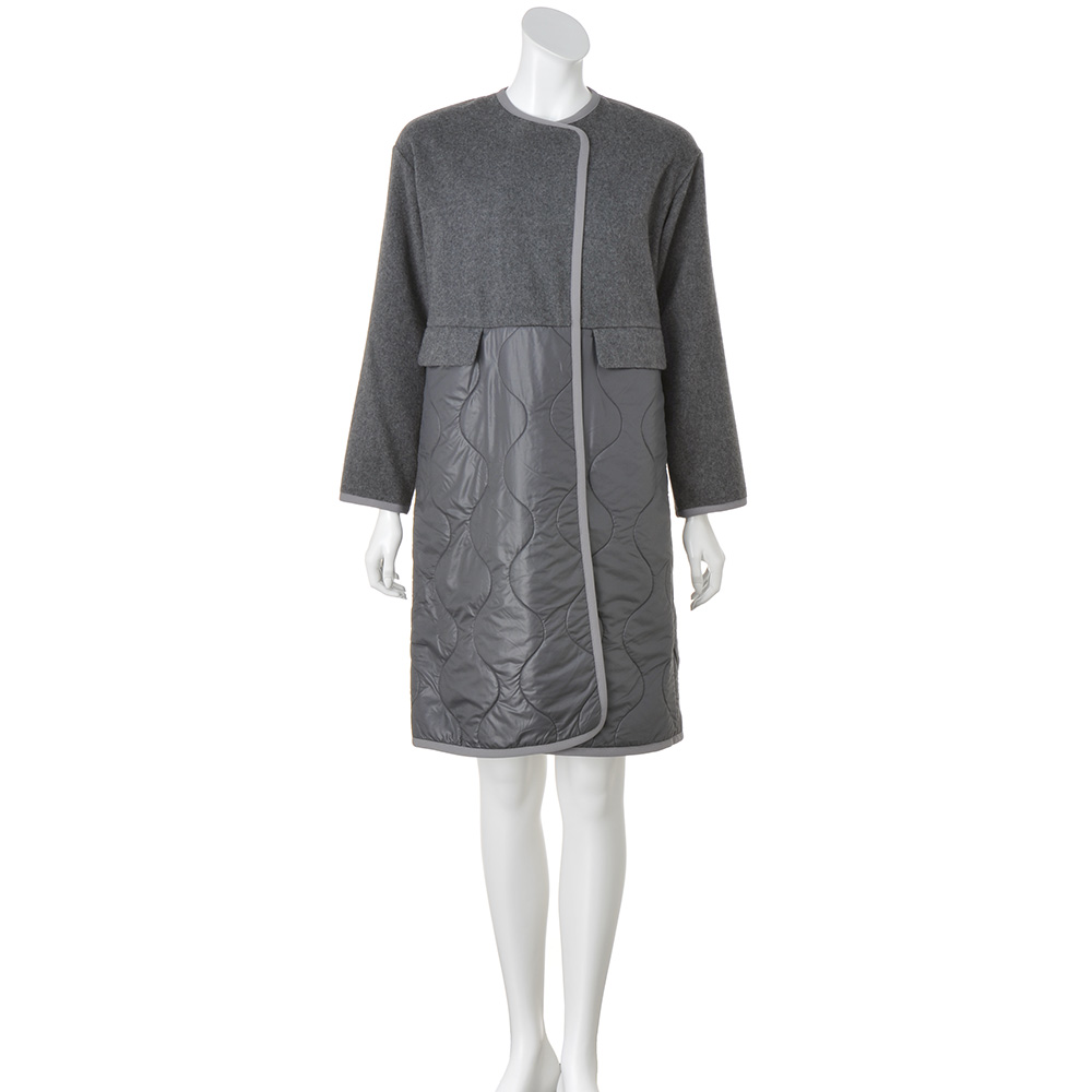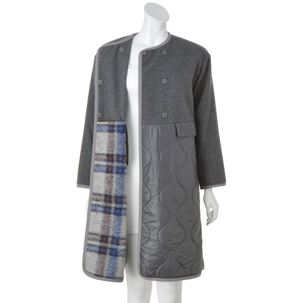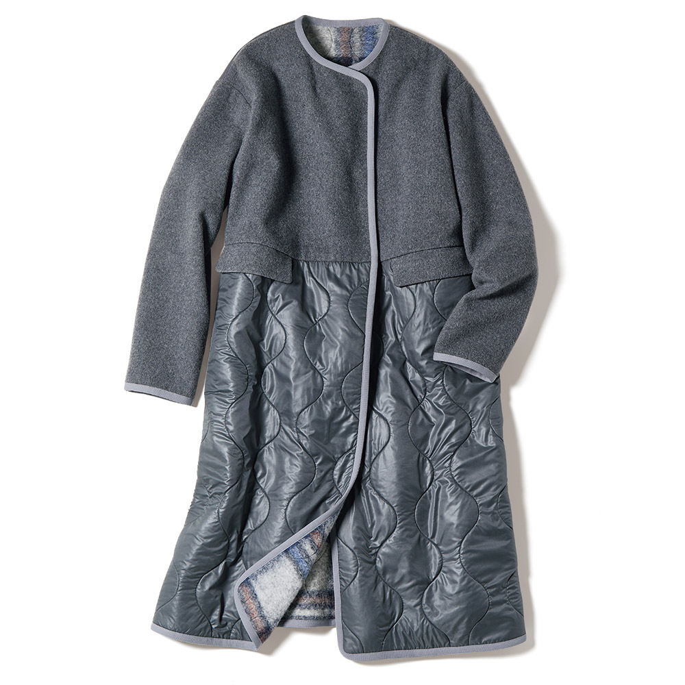 タウンで目を惹く、洗練カジュアルカジュアルの条件は、ベーシック性と心地よさ。そこに美的なエッセンスを加えたひとつ上のカジュアルスタイルです。アクティブに過ごす方達に向けて軽快な異素材コンビのコートを作りました。前上身頃〜袖はウール混メルトン素材でコートとしての品格を主張。前下と後ろ身頃に使ったキルト生地は、イタリア「TEXAPEL」社のポリエステルタフタのキルティングの裏にスライバーを合わせたDAMAコレクションオリジナル。装いに合わせやすい優しげなグレーの裏側には、イタリアらしいレッドとブルーを入れた洗練配色のチェック柄が覗いて、洒落感上々。手放せなくなる暖かさも叶えます。ハイウエストの切り替え、視線を上げるフラップポケット、モダンなパイピング仕様など細部まで拘りました。≫ POINT裏地はトラッドなチェック柄。ミリタリー由来のオニオンキルトも秀麗。
