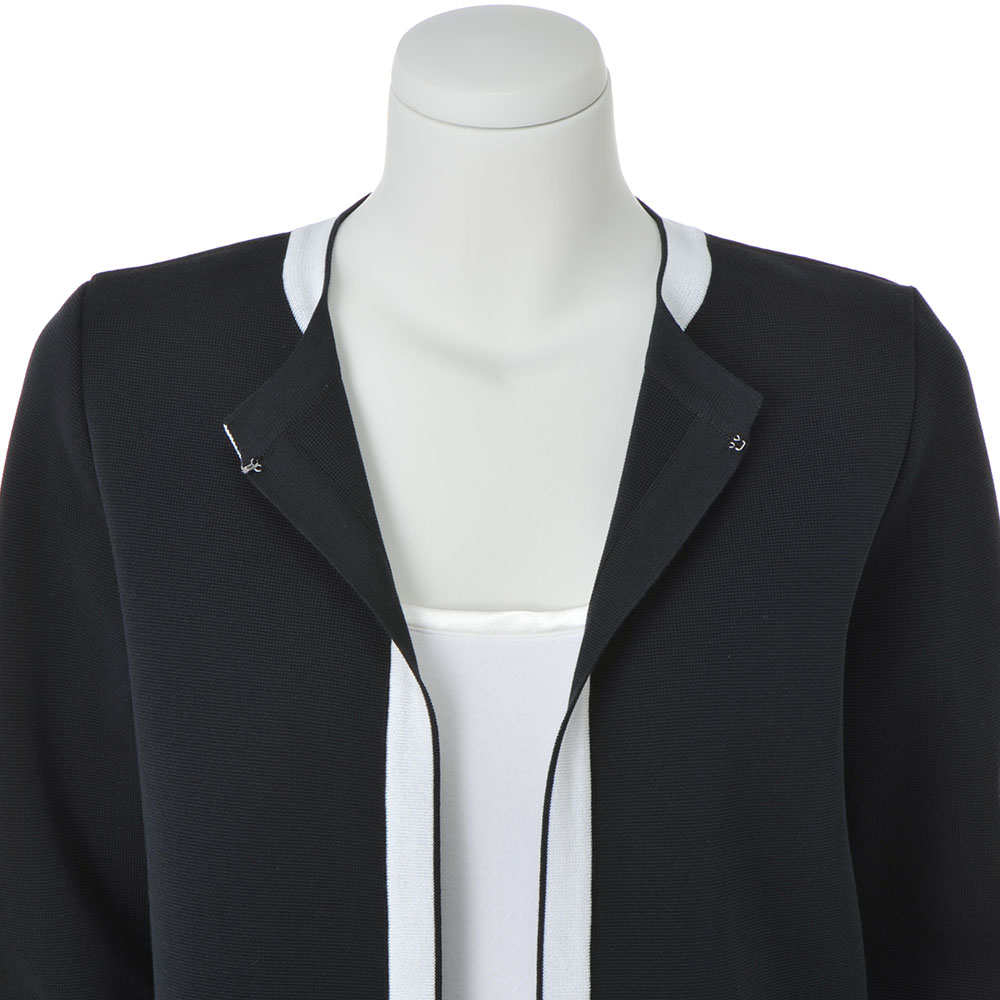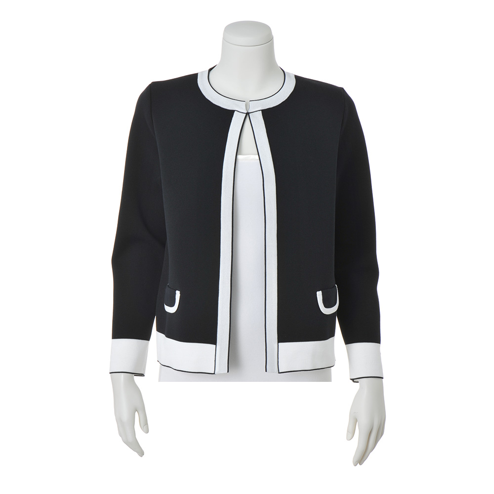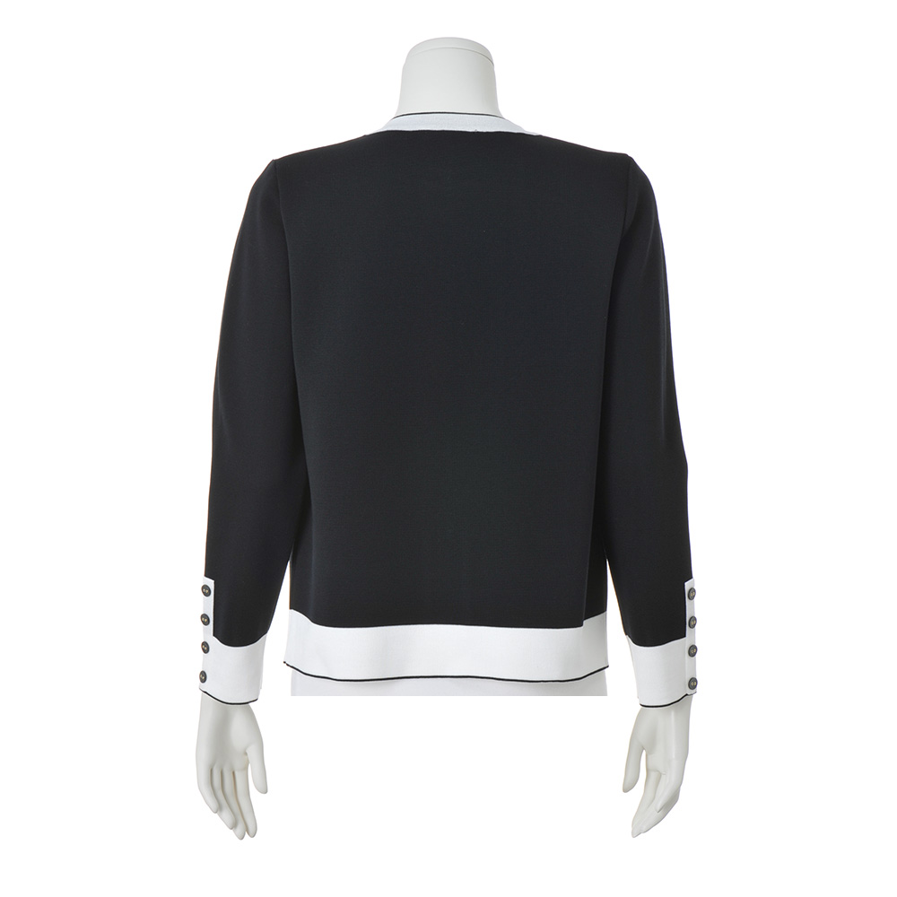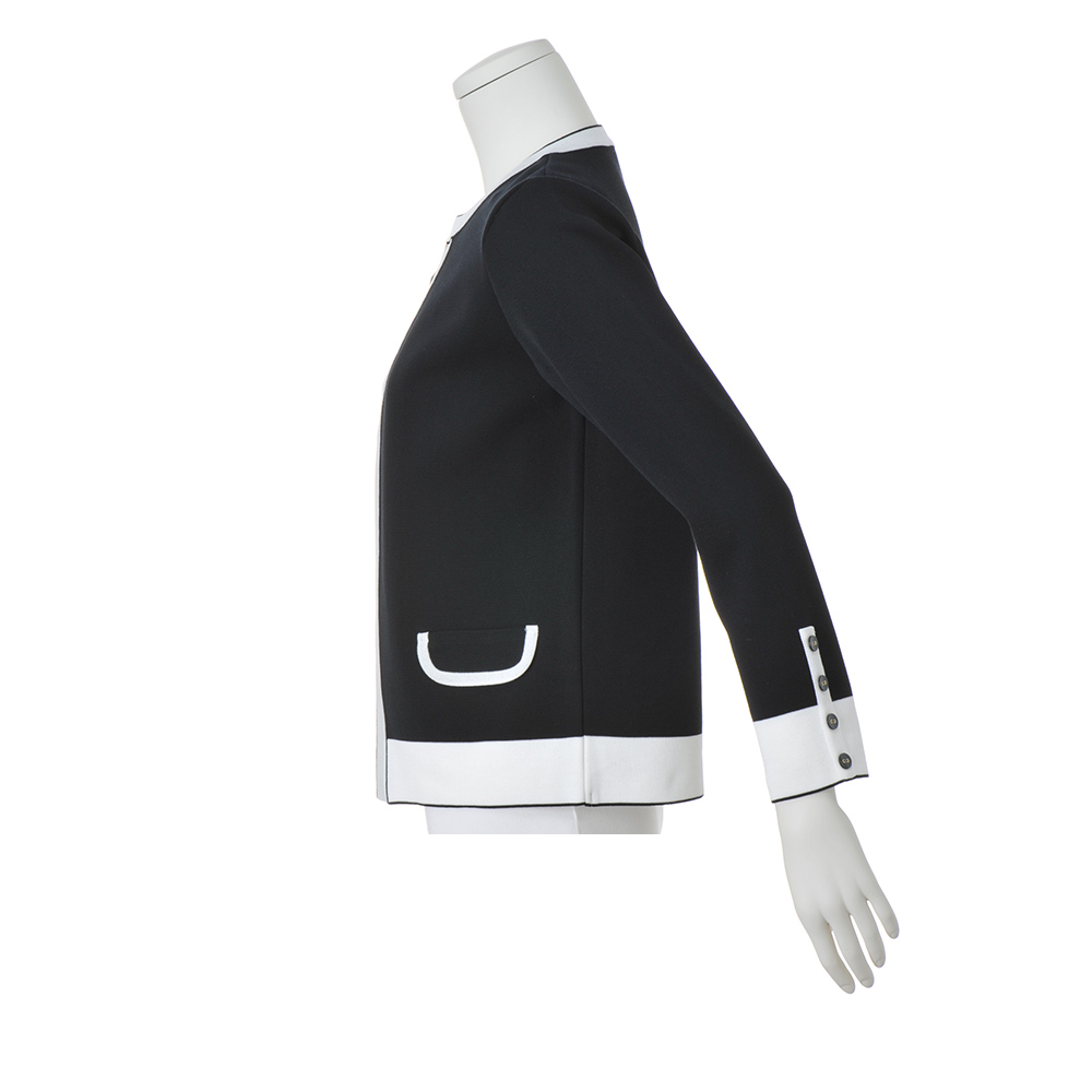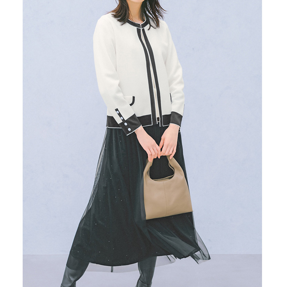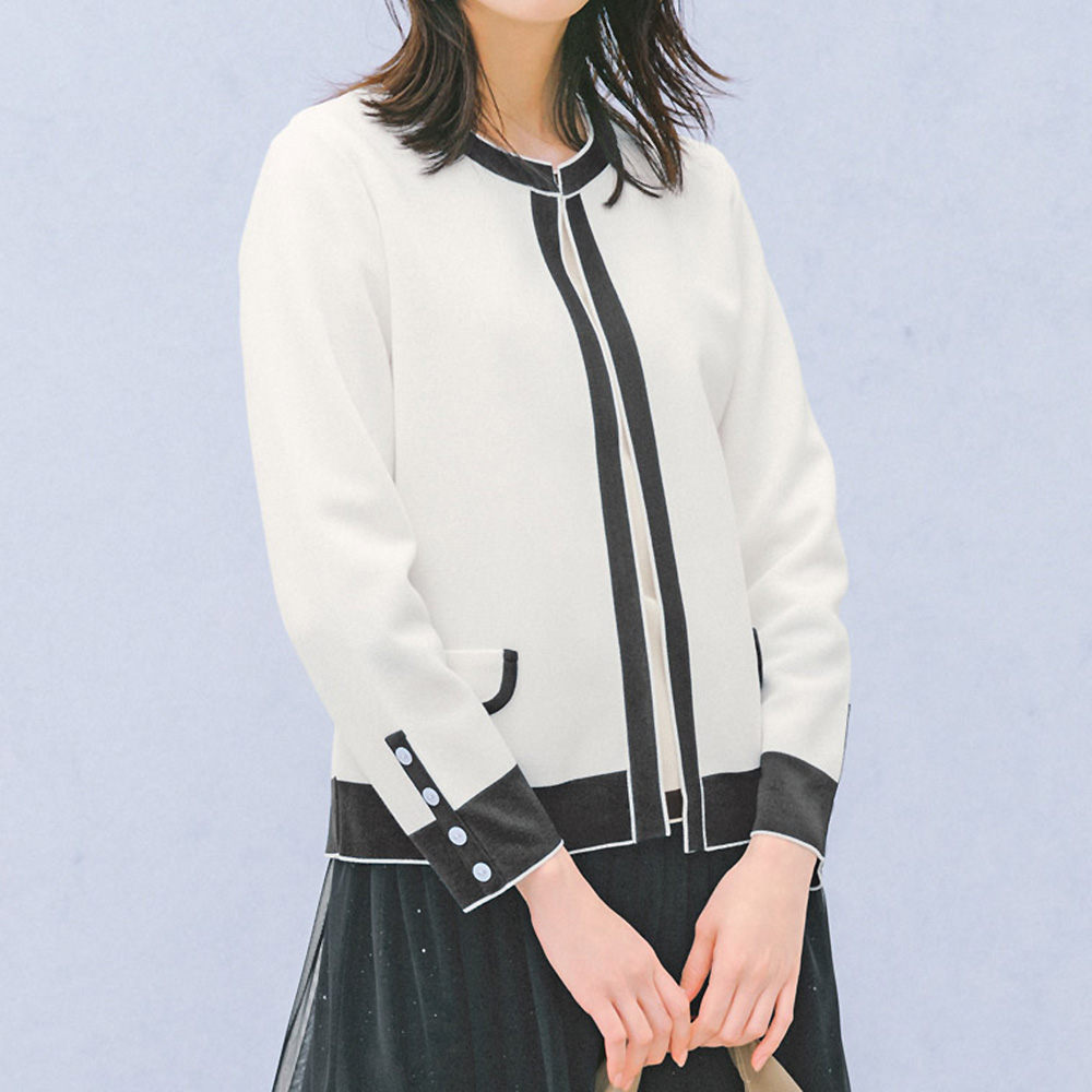 きれいめもカジュアルも大人のおしゃれはMONOTONEで。どこか洗練されたムードが漂うモノトーンの装い。活躍必至のアイテムに注目。カジュアルにも好相性なモノトーン配色ニットの着心地のよさはそのままに、ミラノリブのハリのある編み地で仕立てたカーディガン。飾りフラップポケットつきでジャケット見えもするので、エレガントにもカジュアルにも着回せます。襟や裾に細く縁取りがほどこされた配色もポイント。