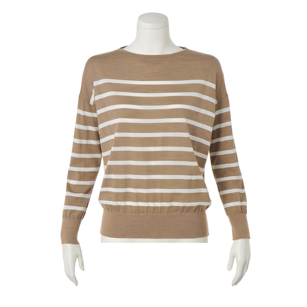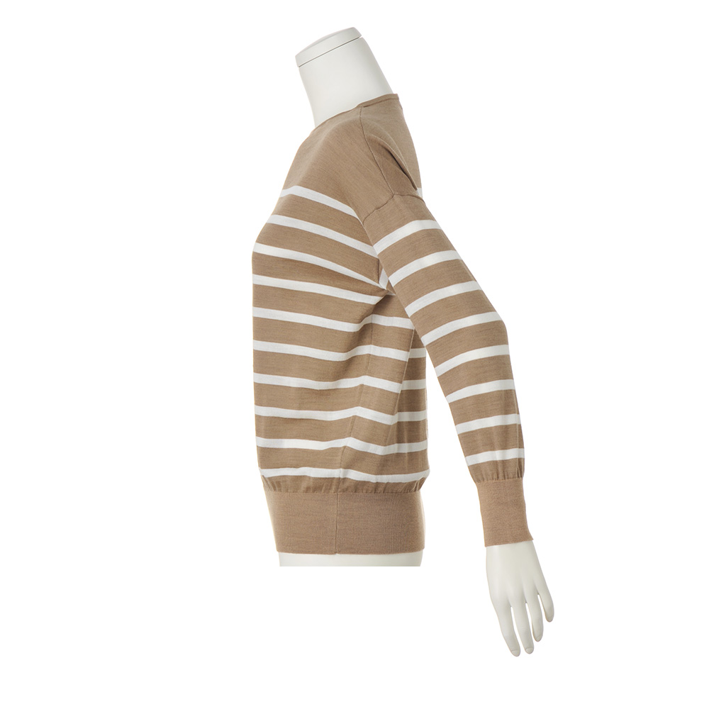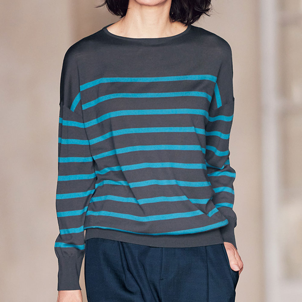程良いデコルテラインのボートネックにゆったりとしたシルエット。気品漂うしなやかなプルオーバーは、イタリアの老舗糸メーカー「Botto Giuseppe」社の梳毛ウール糸を使用。スーパーファインメリノの細番手糸のなめらかな天竺編みは、着心地の虜になる一着です。イタリアらしいニュアンスカラーをパネルボーダーに編み立てて、気負いのない遊び心を取り入れました。≫ POINTダークグレー地にはターコイズ調のブルー、キャメル地にはエクリュのボーダーを配色。細番手のスーパーエクストラファインメリノ糸のハイゲージ天竺編みで、目面美しく編み上げました。