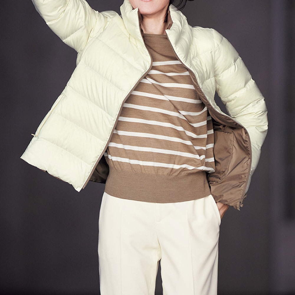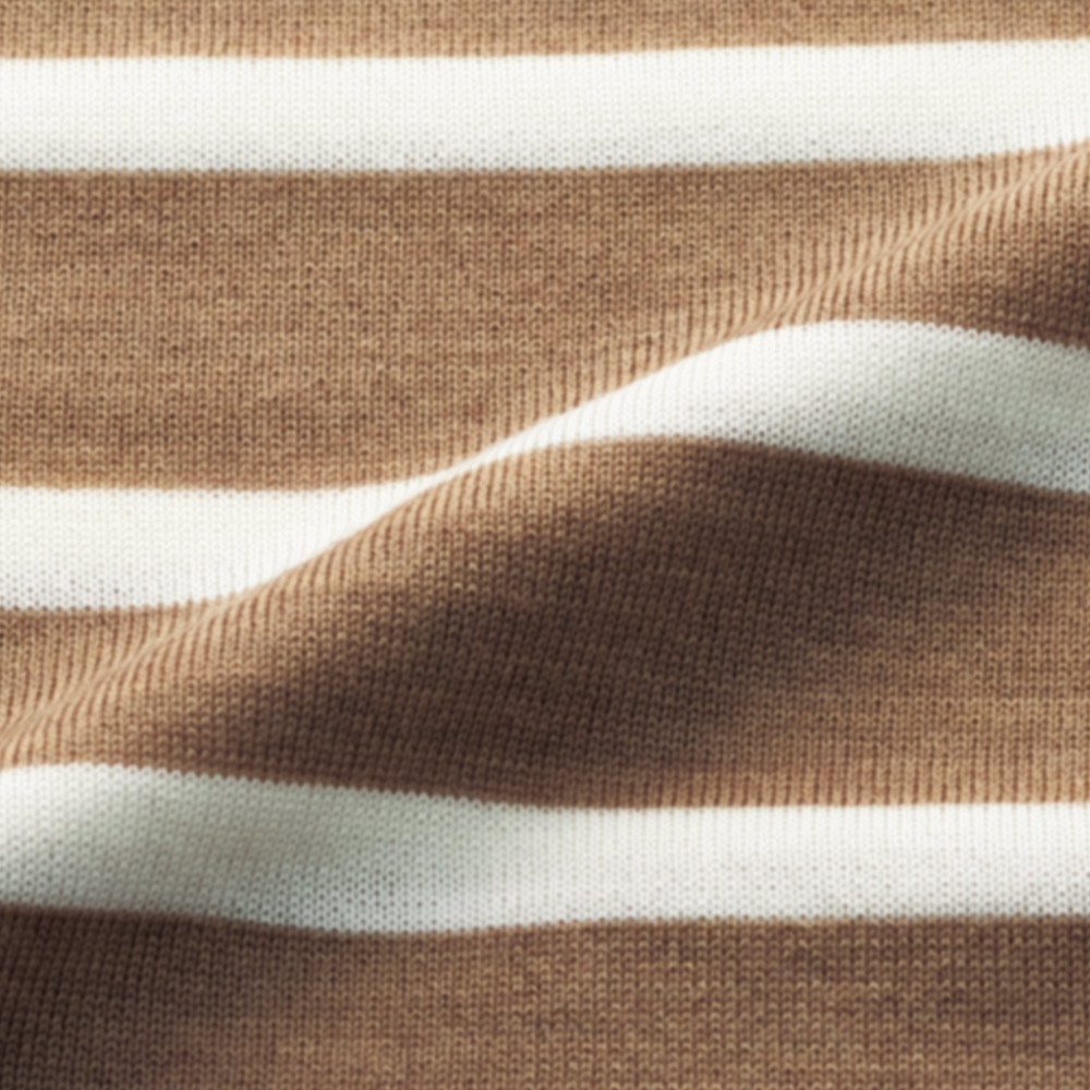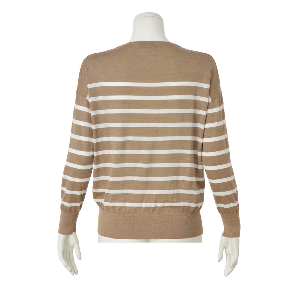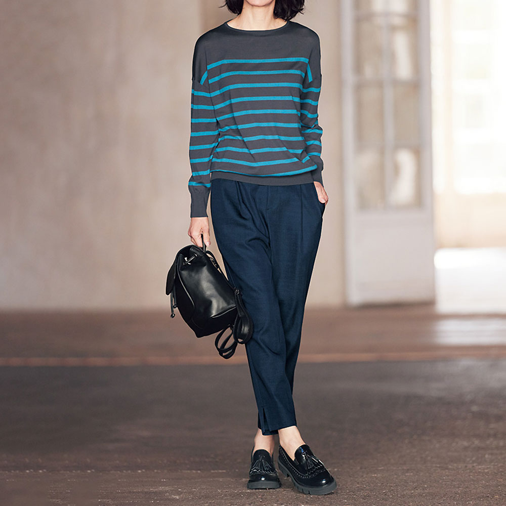 程良いデコルテラインのボートネックにゆったりとしたシルエット。気品漂うしなやかなプルオーバーは、イタリアの老舗糸メーカー「Botto Giuseppe」社の梳毛ウール糸を使用。スーパーファインメリノの細番手糸のなめらかな天竺編みは、着心地の虜になる一着です。イタリアらしいニュアンスカラーをパネルボーダーに編み立てて、気負いのない遊び心を取り入れました。≫ POINTダークグレー地にはターコイズ調のブルー、キャメル地にはエクリュのボーダーを配色。細番手のスーパーエクストラファインメリノ糸のハイゲージ天竺編みで、目面美しく編み上げました。