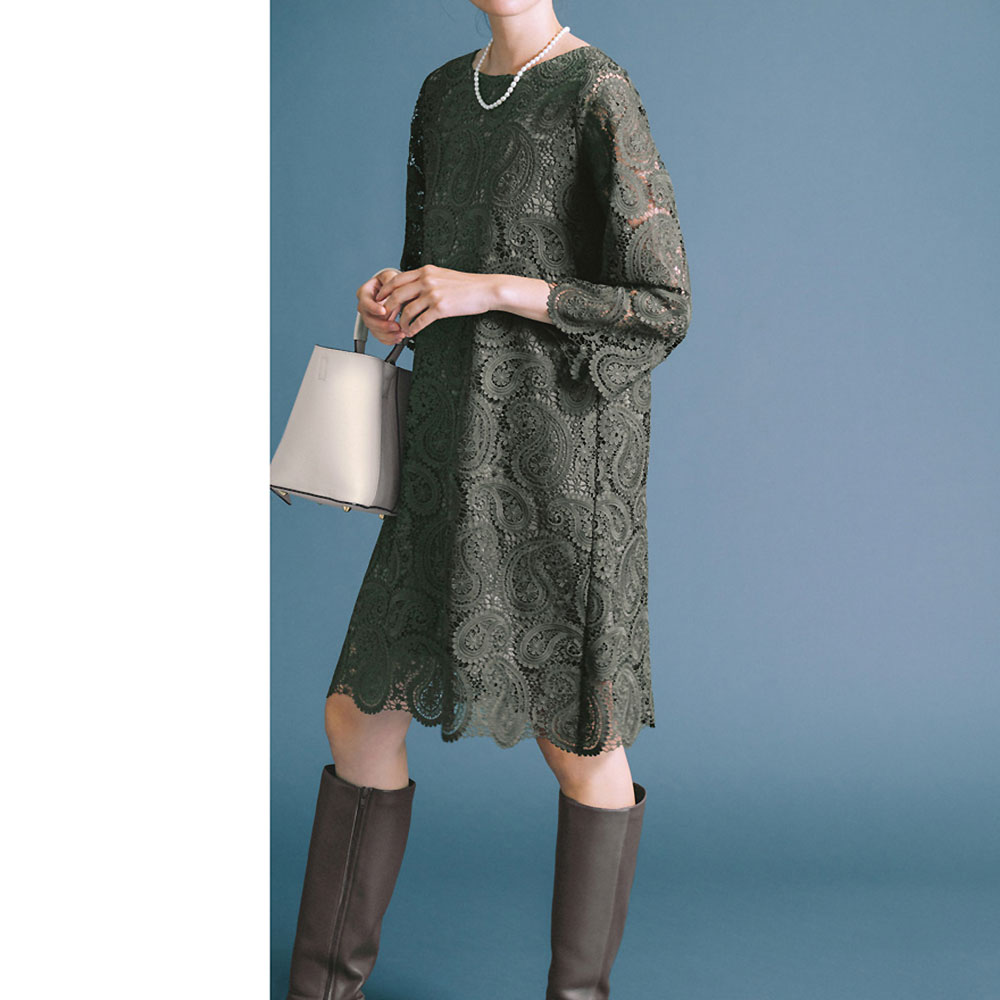 毎日のおしゃれを楽しむ 艶めく華やかスタイルさりげない華やぎを添えて、女性らしい大人の魅力が高まる日常服をご紹介。個性派素材を気負わず楽しむ大ぶりのペイズリーをモチーフにしたレースワンピースは、レースを活かした袖の肌見せ、裾と袖口のスカラップなど、可憐な表情で華やかな席にも活躍する一着。程よい開きのボートネックと、シンプルなAラインのシルエットなのでパンツと合わせてチュニックとしての着こなしも素敵です。