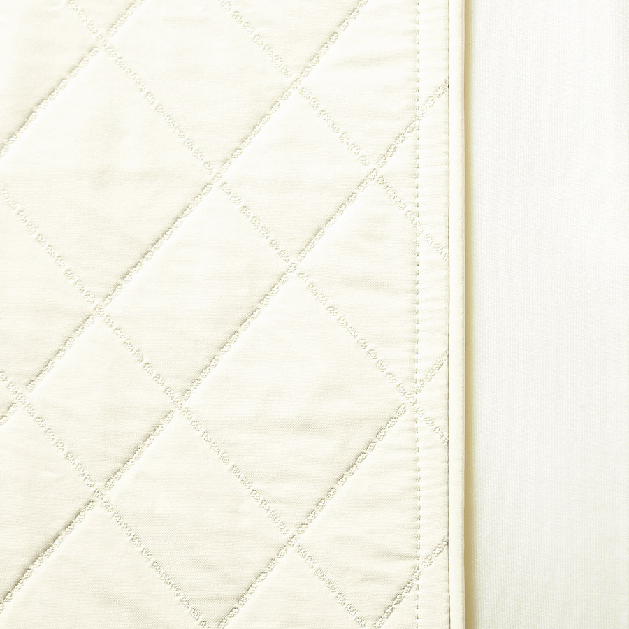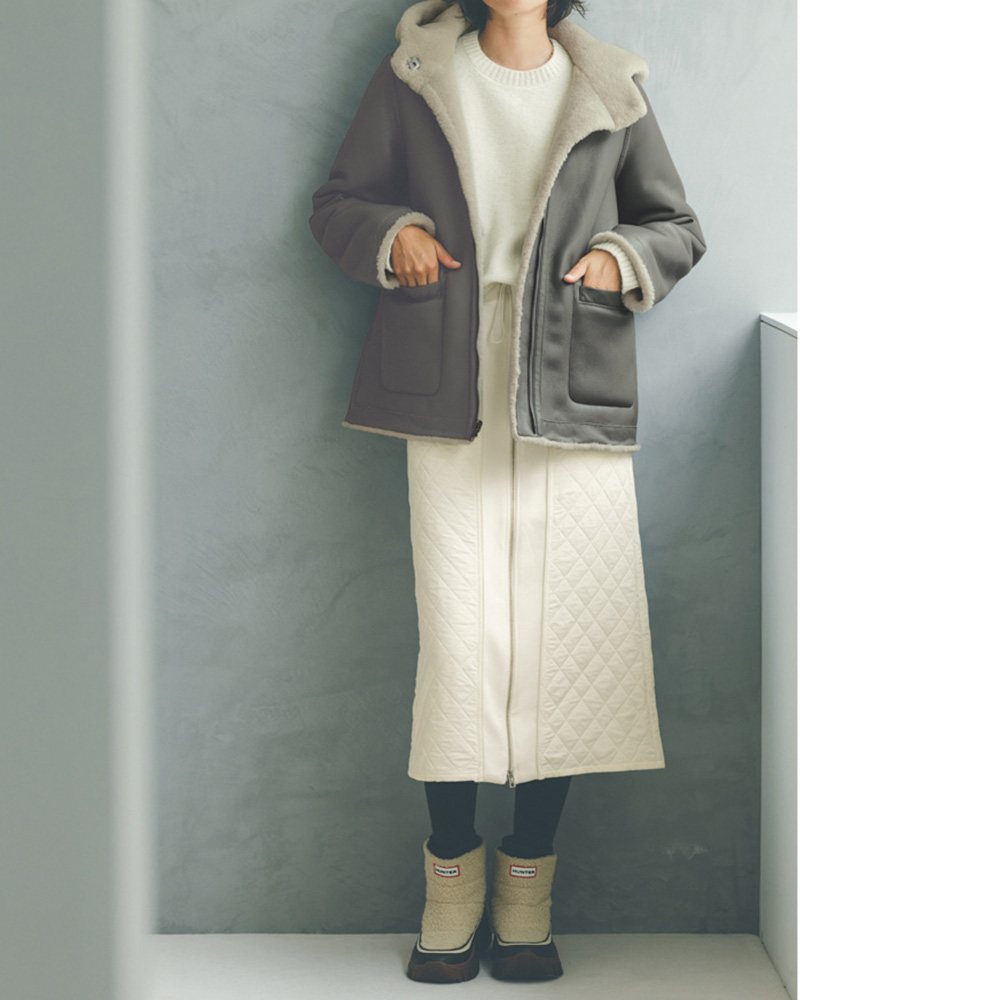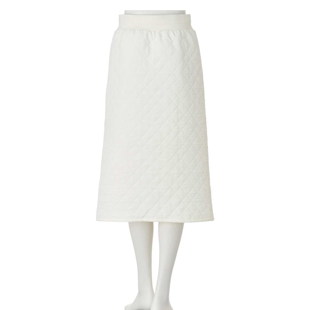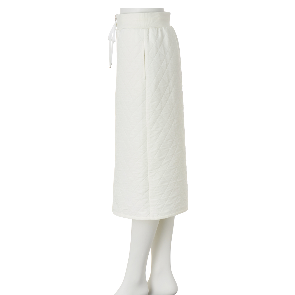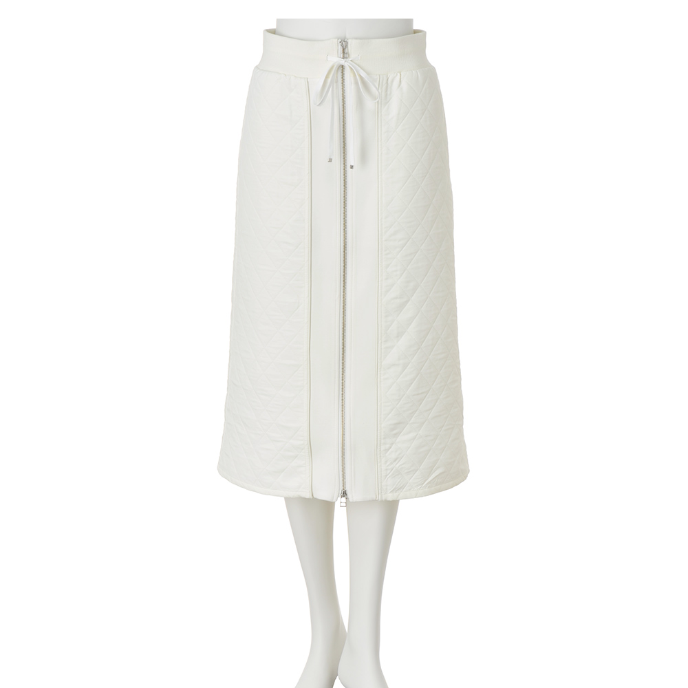 定番素材をシックなカラーで洗練させる。クリーンなオフホワイトのキルト素材が装いにぴったりなスカート。センターフロントにジャージー素材を挟み込み、ファスナーを配して縦ラインを強調しスタイルよく。ダブルファスナーなのでスリット風のアレンジも可能です。POINTベースのキルト生地とセンターフロントの無地ジャージーの間に、レザー調のパイピングを挟み込んだ凝ったデザイン。ウエストは幅広のリブとドローストリング仕様で、程よくカジュアルさをプラス。