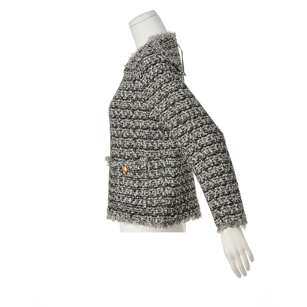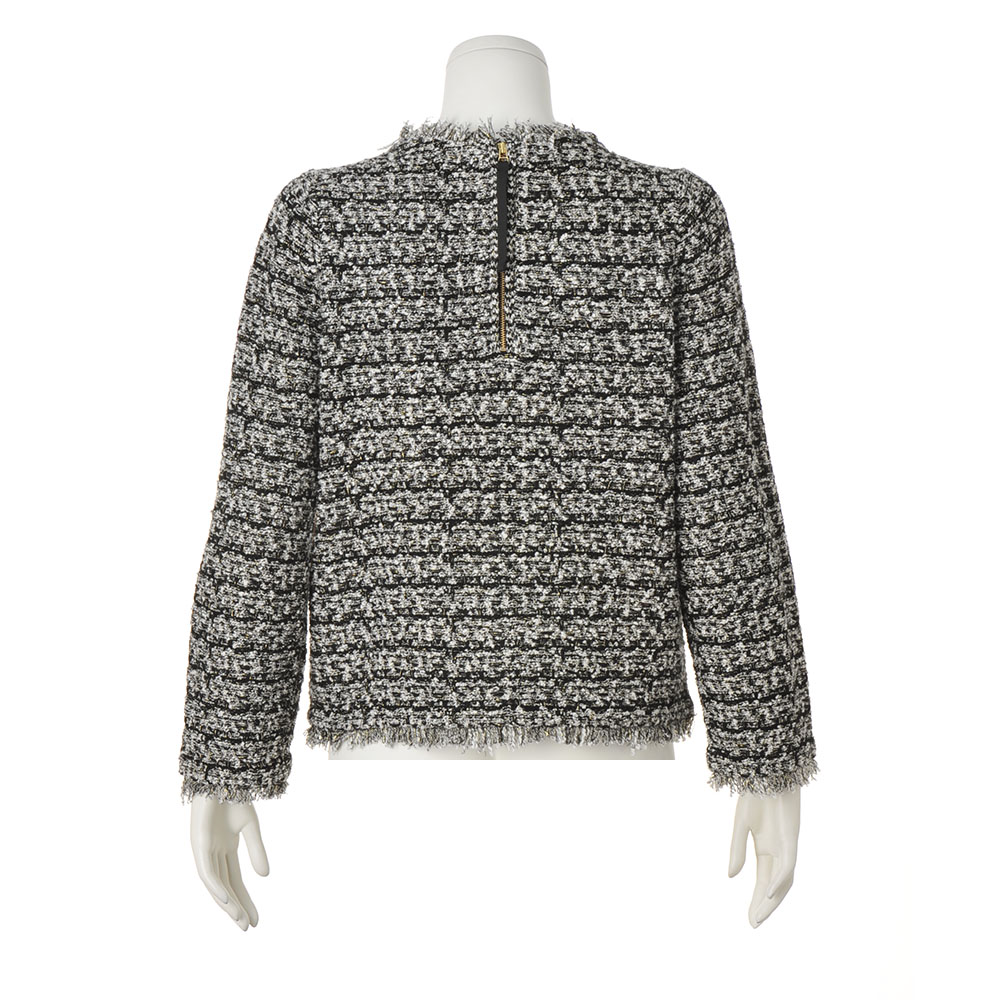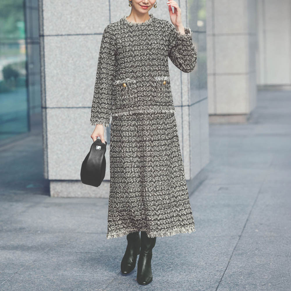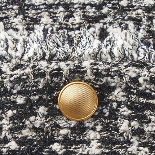 纏うだけで自信が持てる 私を輝かせる毎日服伸びのよいツイード調ニット生地がこなれ感満載のセットアップ。編み地に樹脂加工をほどこし、ひじやひざが出にくいのが特徴。プルオーバーのポケットは高めの位置にすることでスタイルアップを叶えます。単品でもスカート(商品番号PC5846)とセットアップでも楽しめます。POINTモノトーン配色のツイードに繊細でキラキラ輝くゴールドのラメ糸をプラス。ポケットに配したゴールドボタンが華やか。部分的にフリンジを入れ、カジュアルな抜け感をプラス。