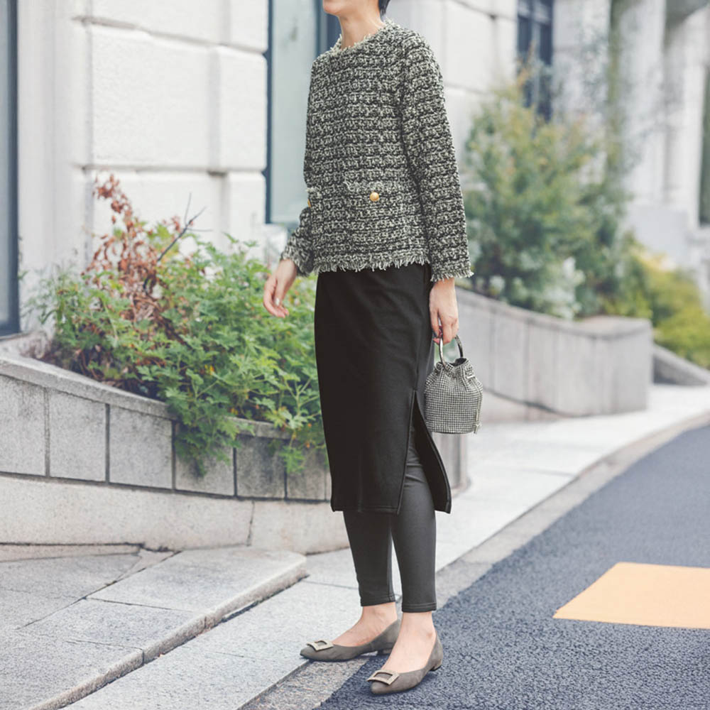 黒の小物で引き締めて今どきムードに格上げ 日常使いはもちろんフォーマルにも決まるシックなセットアップで着映え上手 コーディネート例