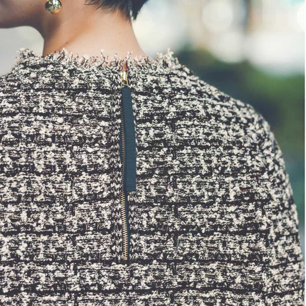 デザイン性のある後ろのメタルファスナーがワンポイント。グログランリボンを配し、デザイン性と着脱のしやすさを兼備。 コーディネート例