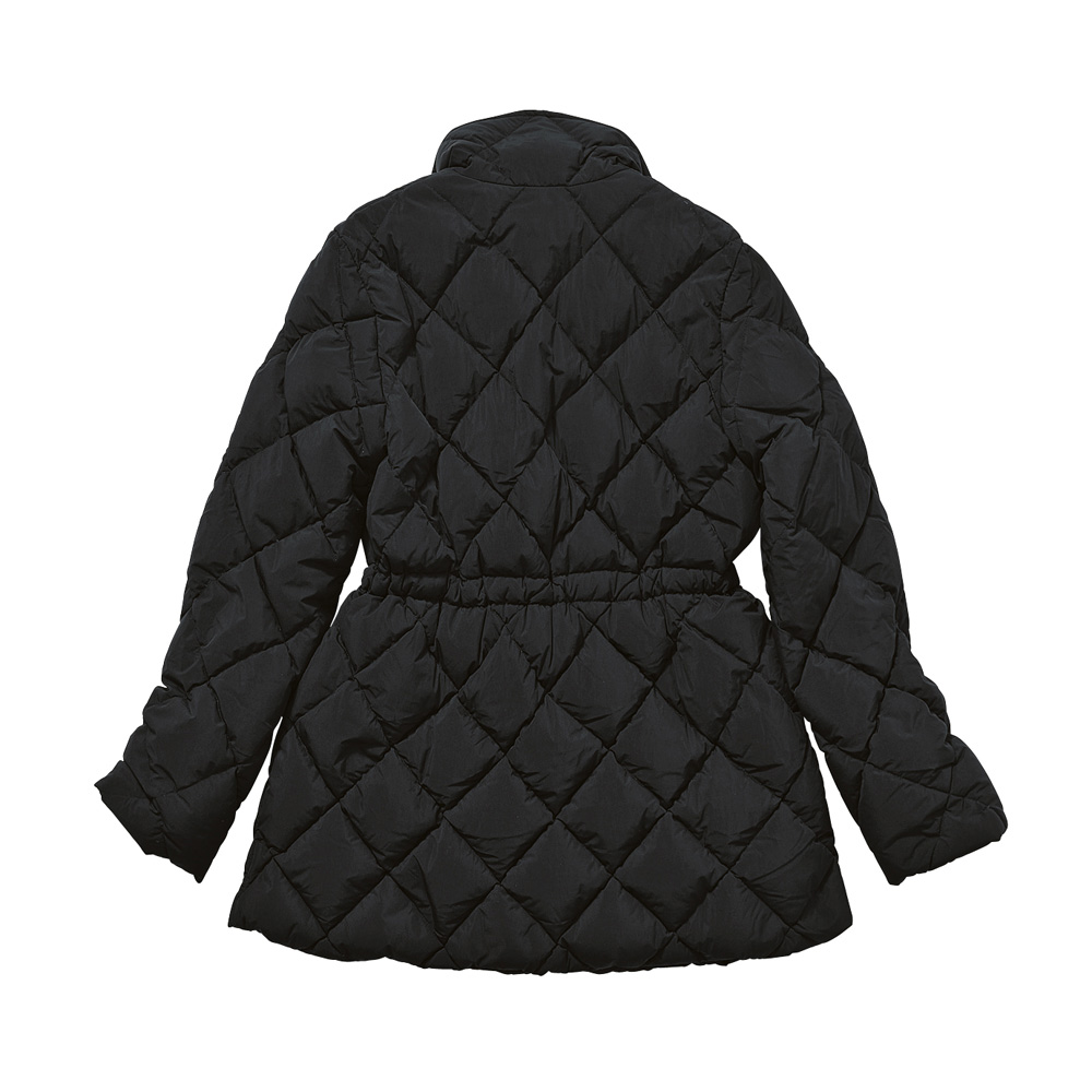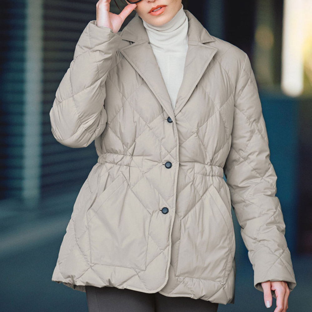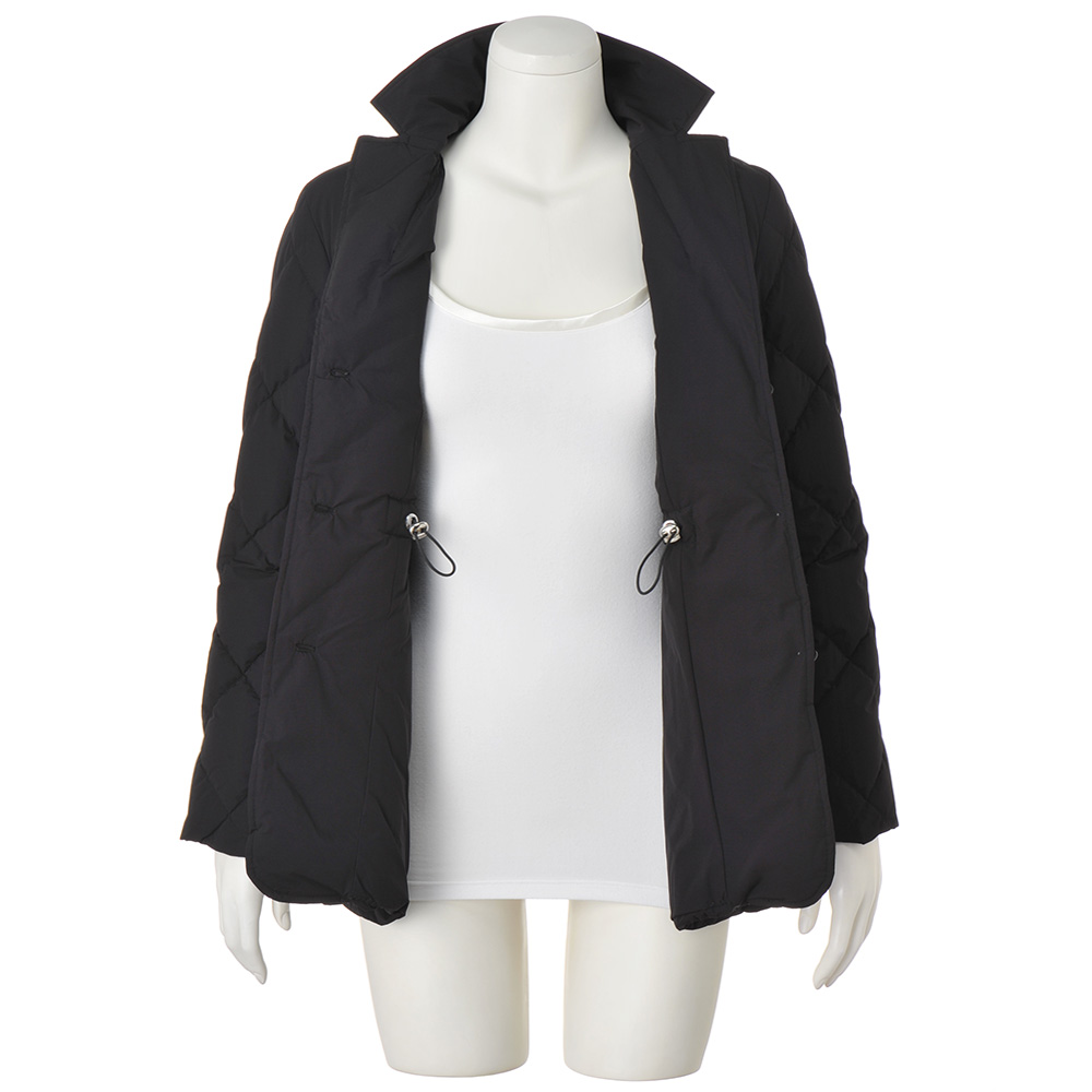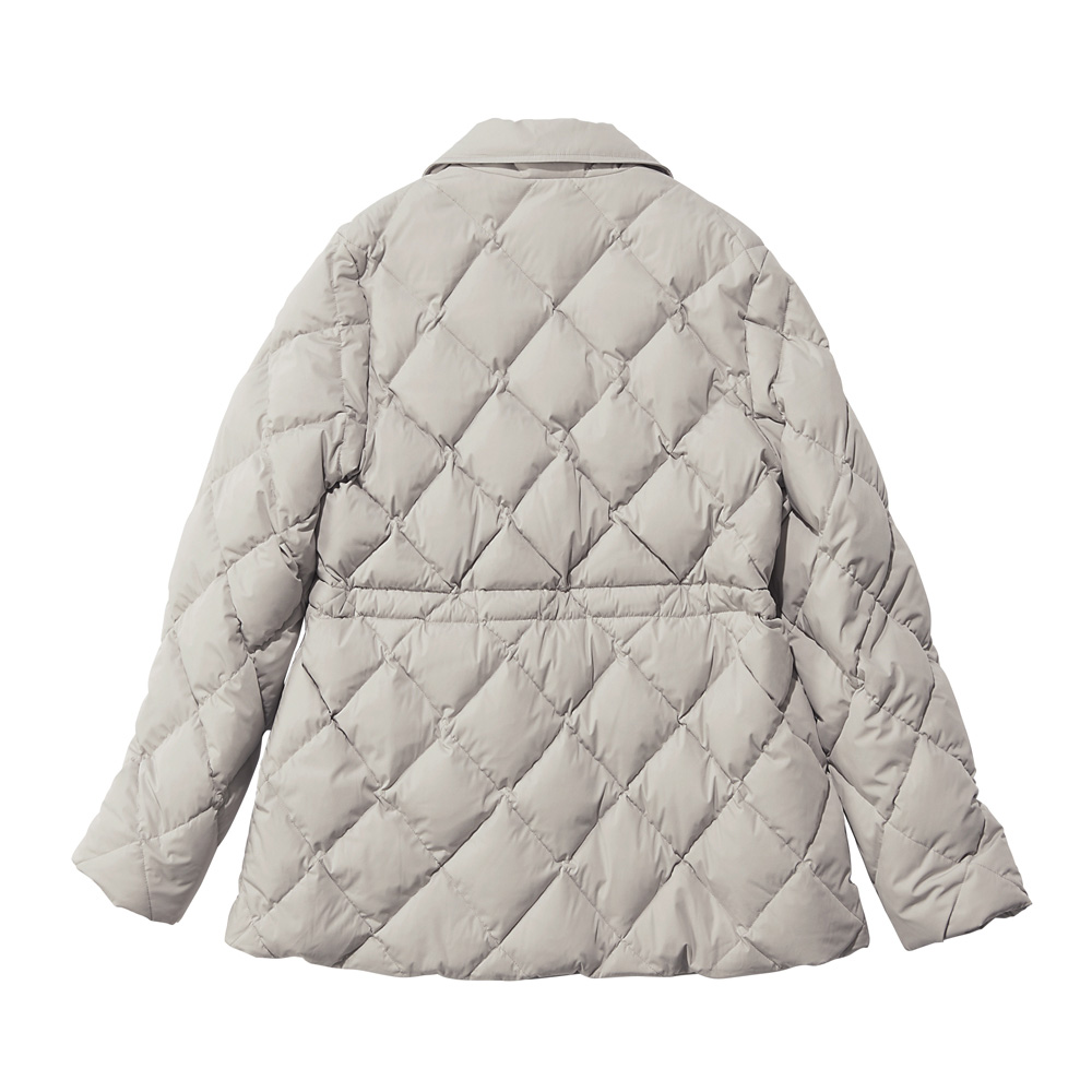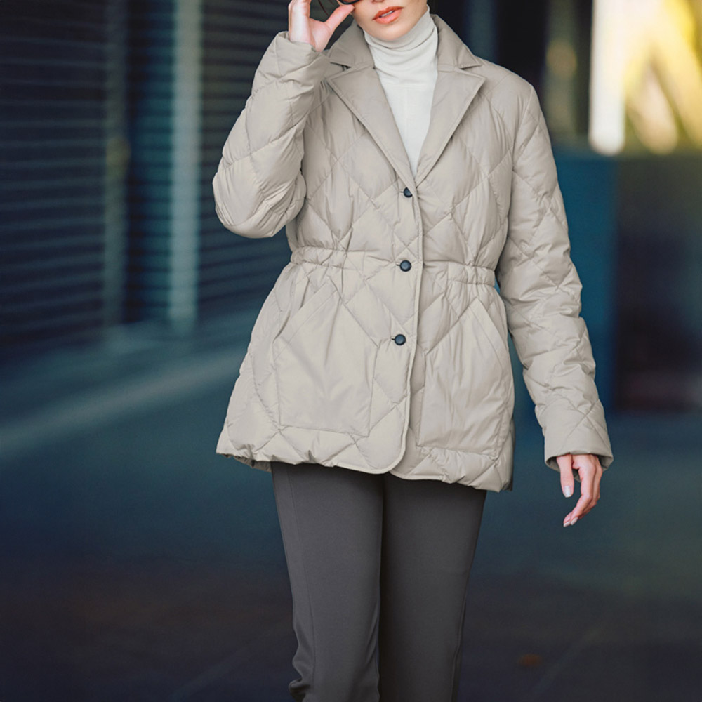 端正さと防寒性を両立したダウンジャケット他にない辛口な女性らしさでヒットしたダウンジャケットが登場。印象をトーンアップするオフグレーが加わりました。表裏ともにストレッチ生地を使用し、着心地は楽ちん。テーラードカラーとダイヤキルティングがすらりと見せ、レザー調くるみボタンも特別感を演出します。腰を覆うミディアム丈は、内側のゴムを絞ればシルエットがアレンジ可能。メリハリあるくびれが生まれ、着ぶくれ感のない着姿に。