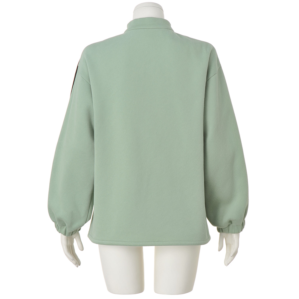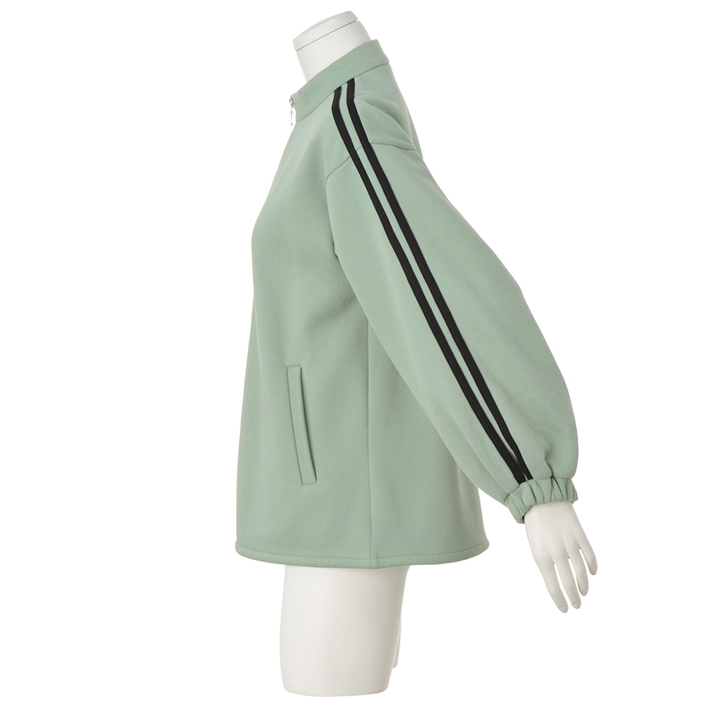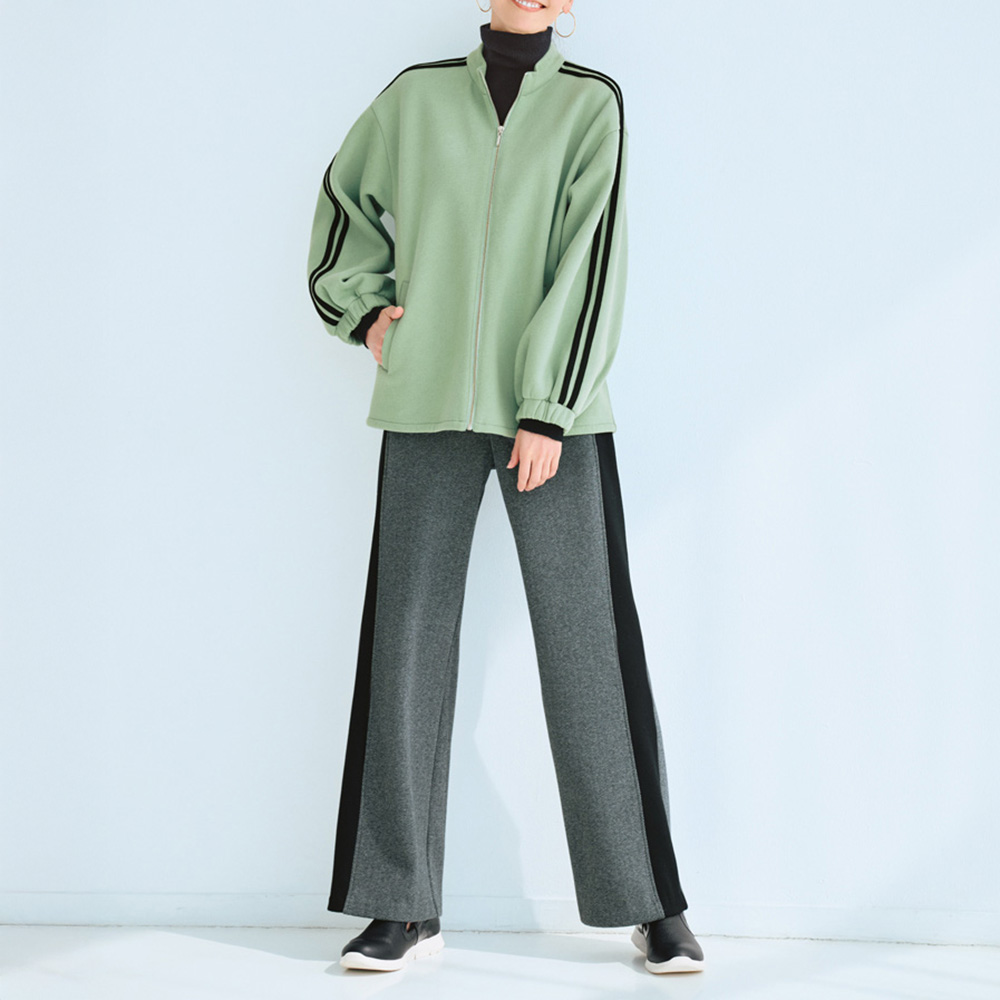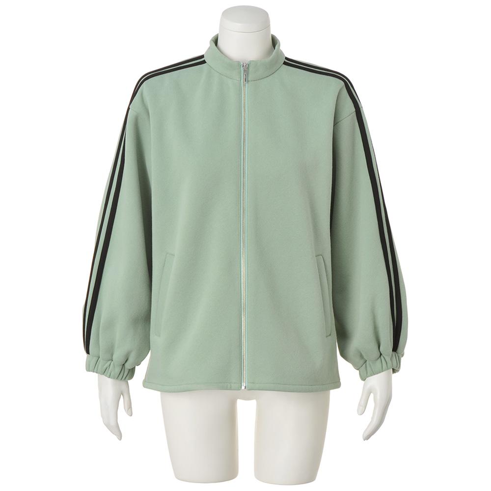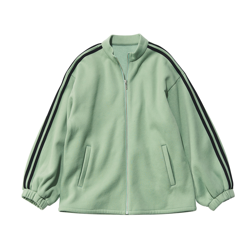 洒落感重視!ヘルシーに着こなす、「あったか」カジュアル裏面をふんわり毛羽立たせて、暖かさをキープする裏起毛加工。ホカホカと気持ちいい触感を伸びやかなジャージーと掛け合わせ、ハートまであったまるアイテムを作りました。流行のトラックデザインで寒い日をアクティブに過ごす袖に配したラインが映える、旬のジップアップブルゾン。厚みのあるジャージーの裏はふわふわと起毛されていて、一枚で充分に暖かい作りです。ミントがかった優しいグリーン、袖口のゴムギャザーなど、スポーティ要素に大人のニュアンスを添えて。