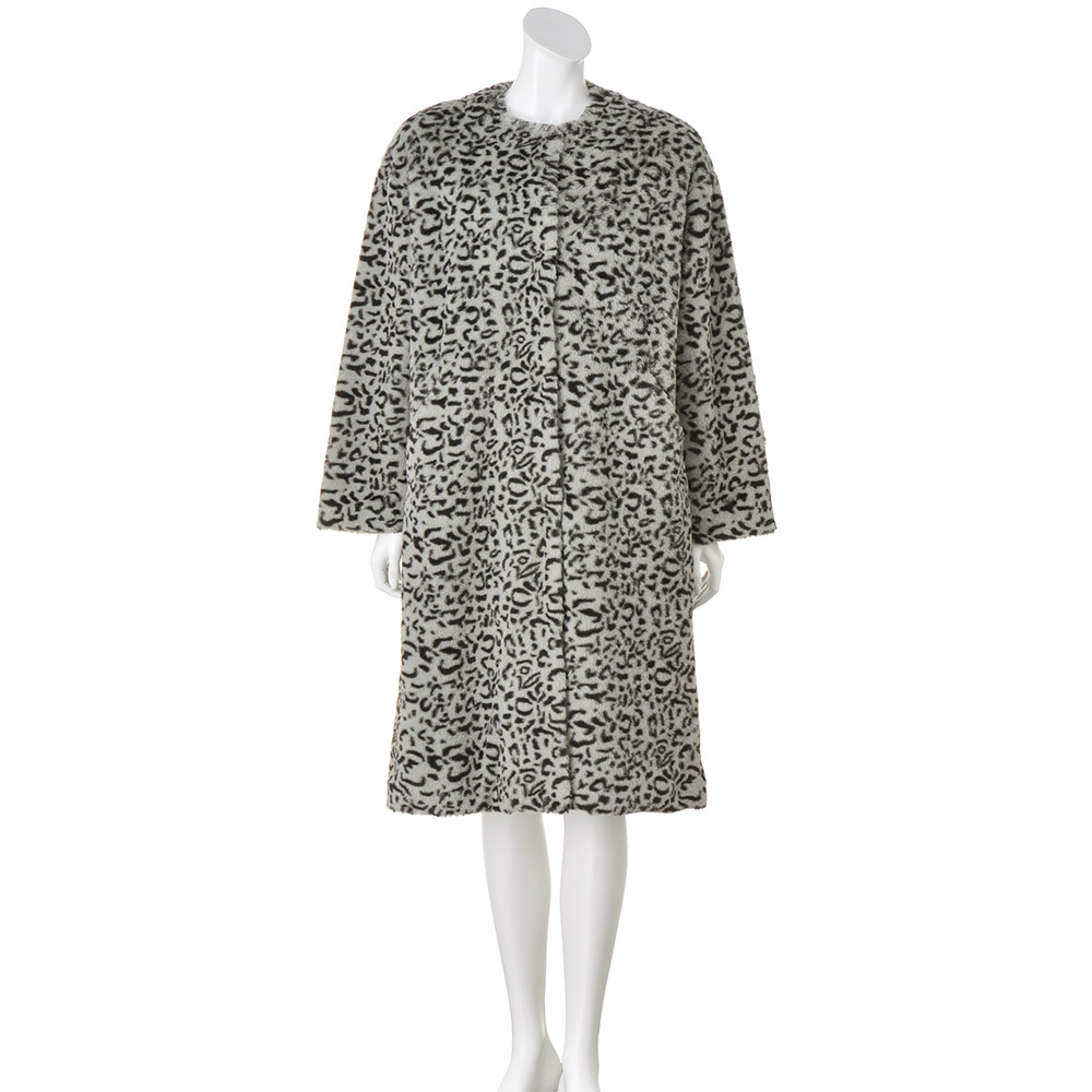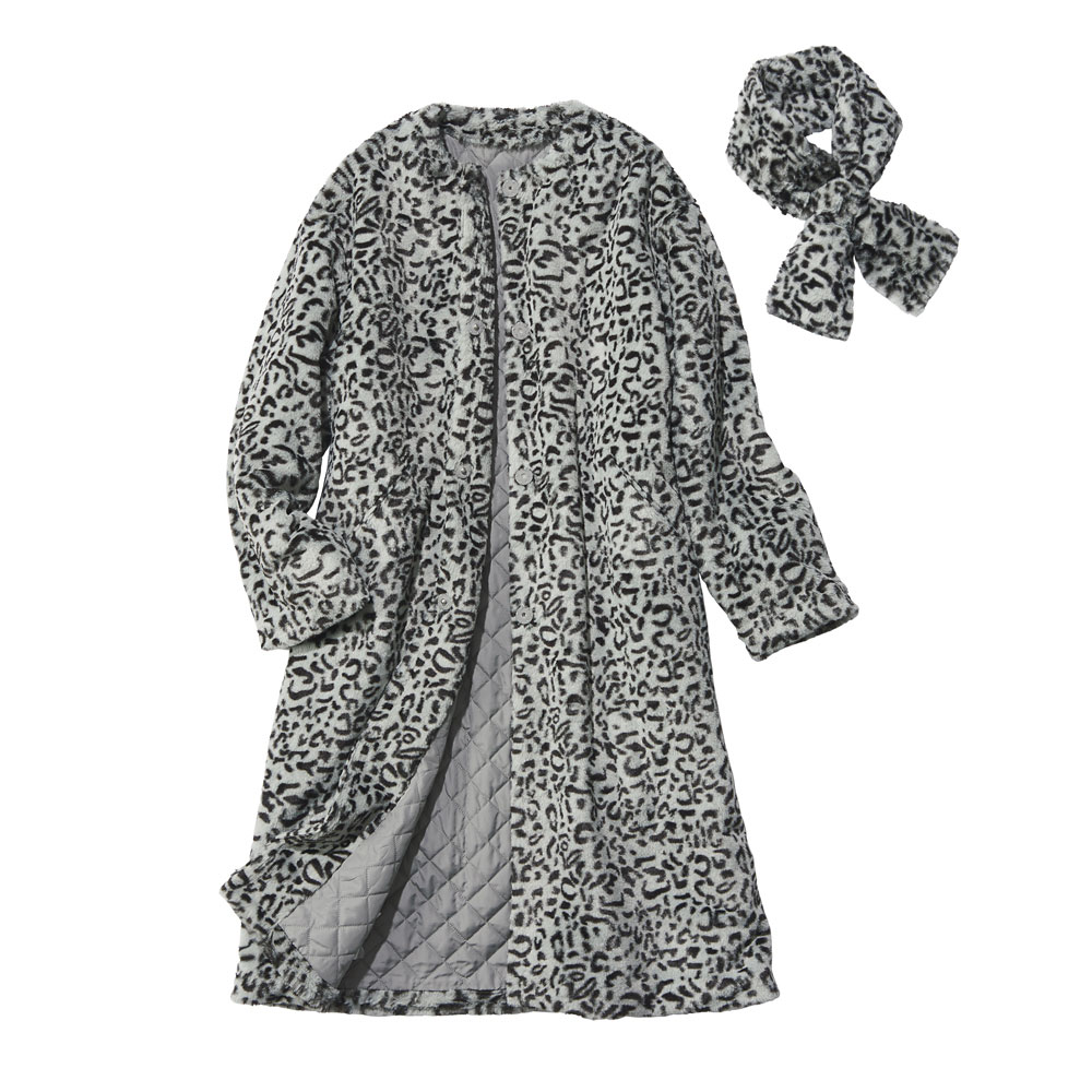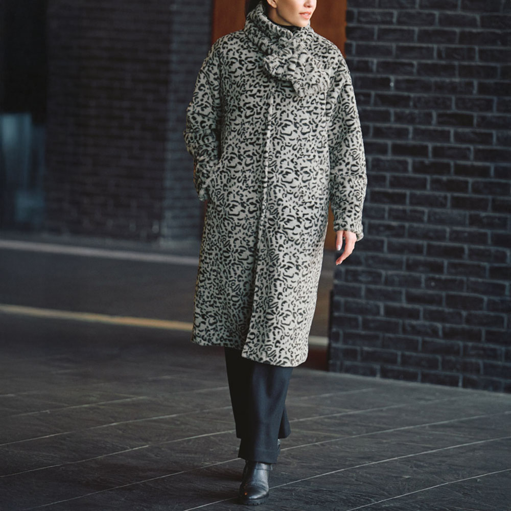 はつらつとした色柄、愛らしい素材――。美迫力という新しい選択なめらかな肌触りのフェイクファーの内側に、薄い中わたキルトをあしらったコート。ソフトな表情の素材をミントグレー×黒のレオパード柄でモードに昇華しました。ゆったりシルエットのロング丈はインナーを選ばず、ふわりと纏えば存在感が際立って。セットの共生地のマフラーは片側のホールに通すだけでリボン型になるので、サイドに流したり、他アイテムに合わせたりと、アレンジは自由自在です。