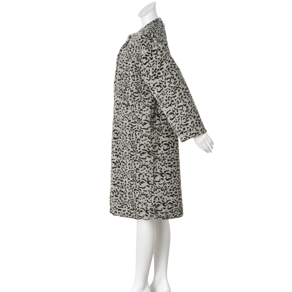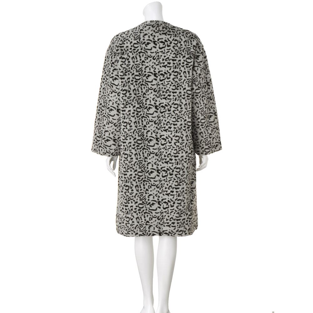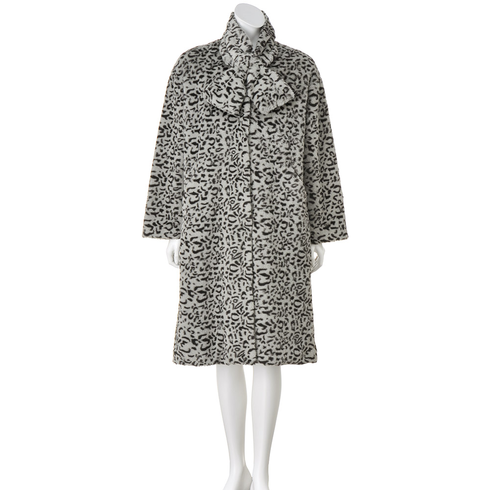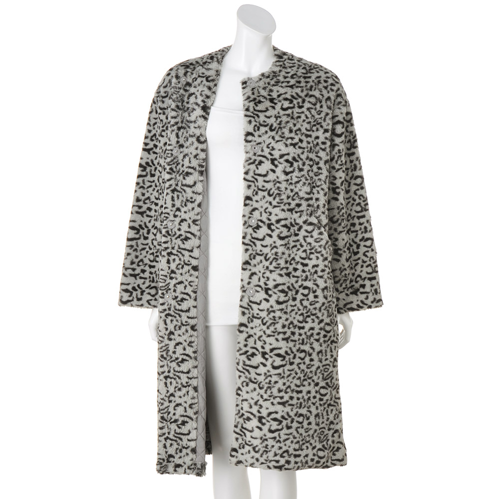 はつらつとした色柄、愛らしい素材――。美迫力という新しい選択なめらかな肌触りのフェイクファーの内側に、薄い中わたキルトをあしらったコート。ソフトな表情の素材をミントグレー×黒のレオパード柄でモードに昇華しました。ゆったりシルエットのロング丈はインナーを選ばず、ふわりと纏えば存在感が際立って。セットの共生地のマフラーは片側のホールに通すだけでリボン型になるので、サイドに流したり、他アイテムに合わせたりと、アレンジは自由自在です。