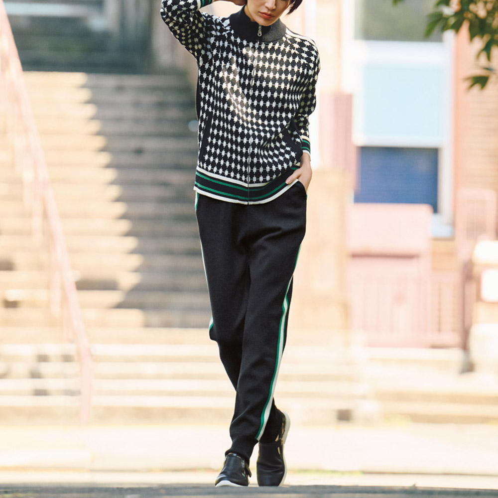 セット着用で洒落感&スタイルUPが実現単品でも幅広く使い回せる、ニット素材のブルゾン(商品番号:PC5866)+ジョガーパンツのセットアップです。裾のリブを長めにあしらったジョガーパンツは、すっきり&美脚見えにきくテーパードシルエット。サイドラインはグリーン×ホワイトの配色で、ブルゾンと色をリンクさせました。